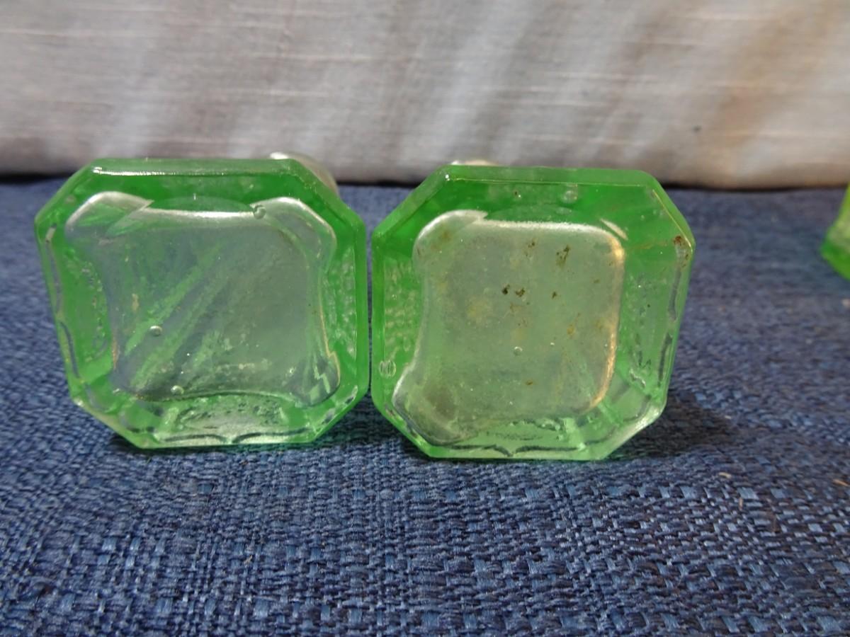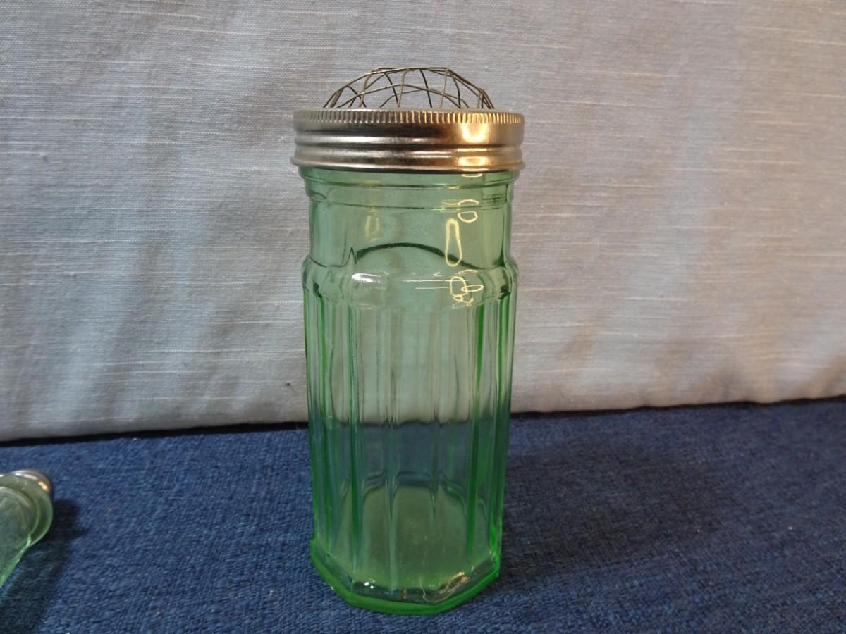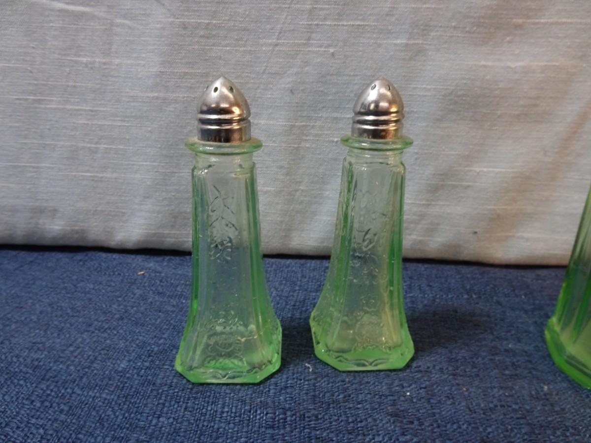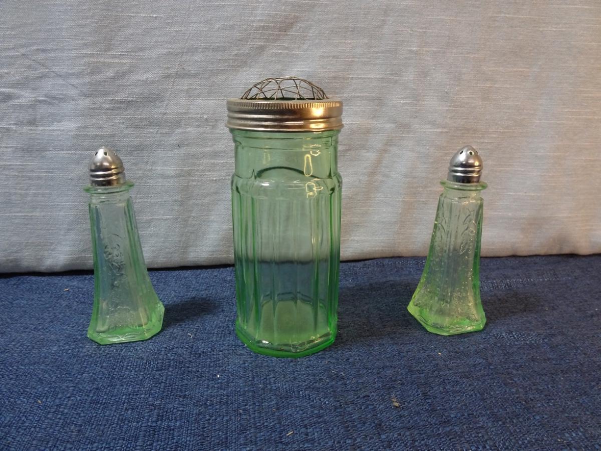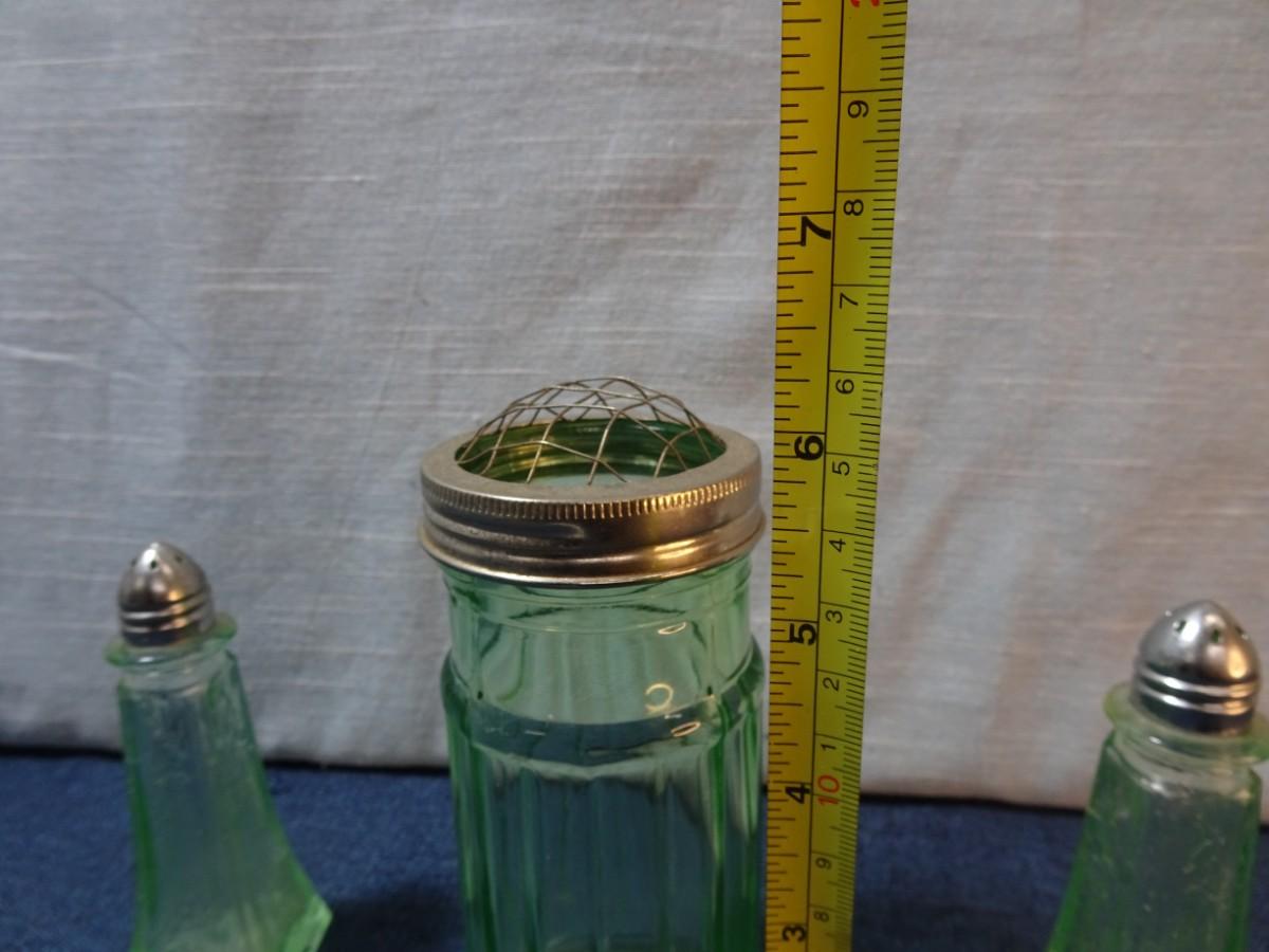 LOT 540. VINTAGE GREEN GLASS VASE AND SALT AND PEPPER SHAKER
