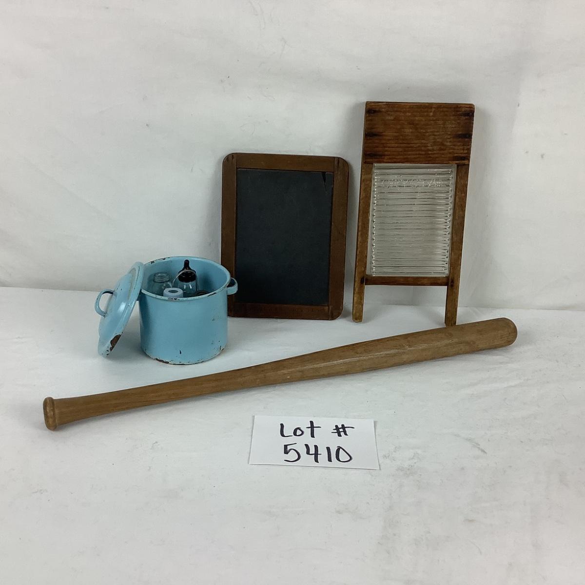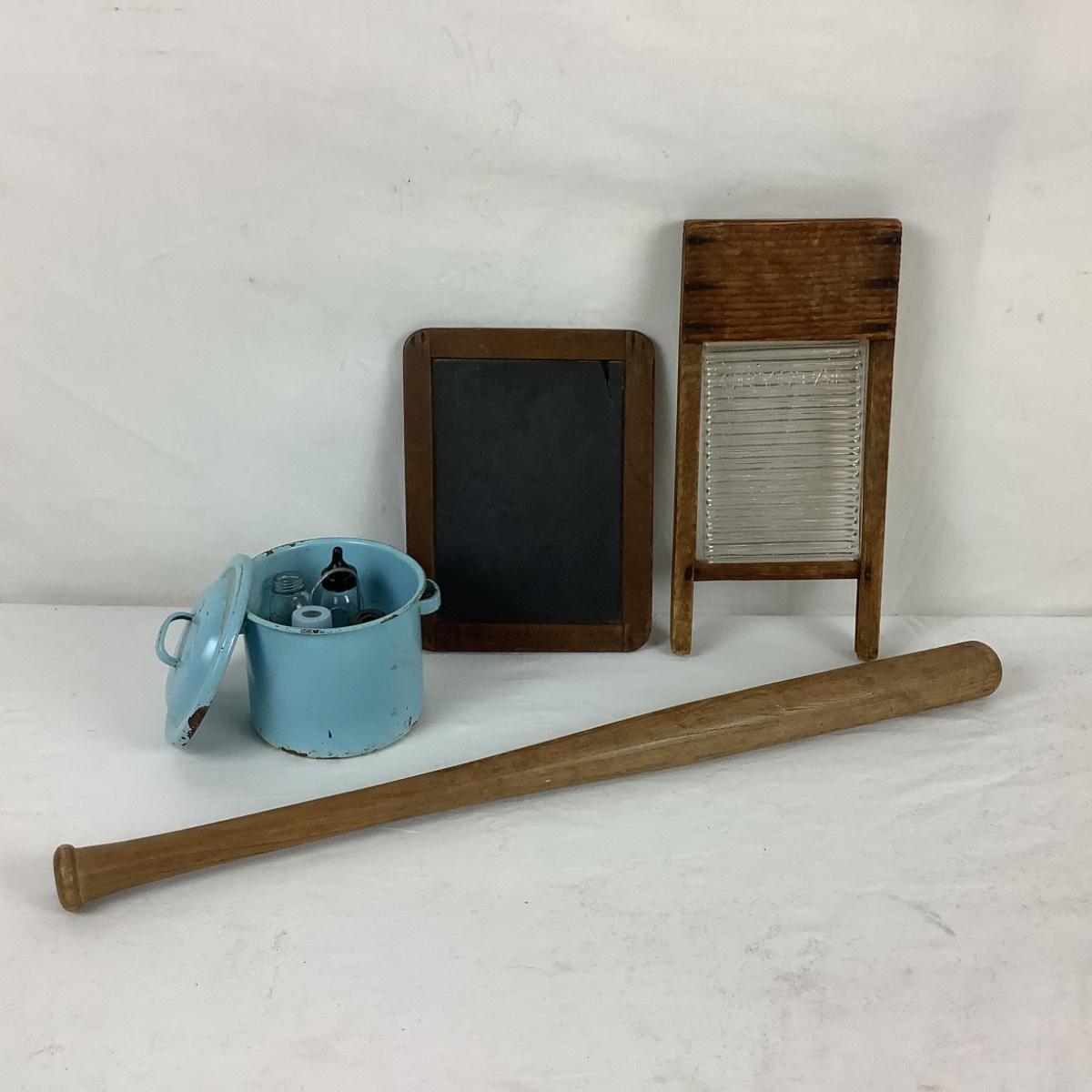 Lot. 5410. Antique Childs Blackboard/Wood& Glass Miniature Salesman’s Sample Washboard/Amsco Doll-E-Toy Baby Bottle Set/Wooden Miniature Bat
