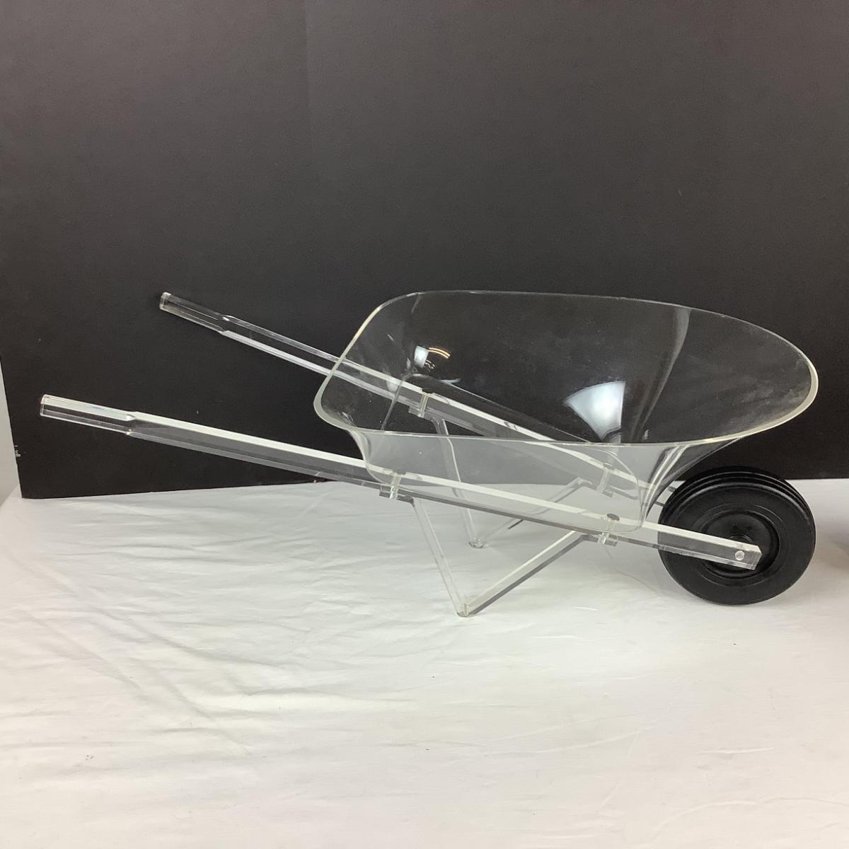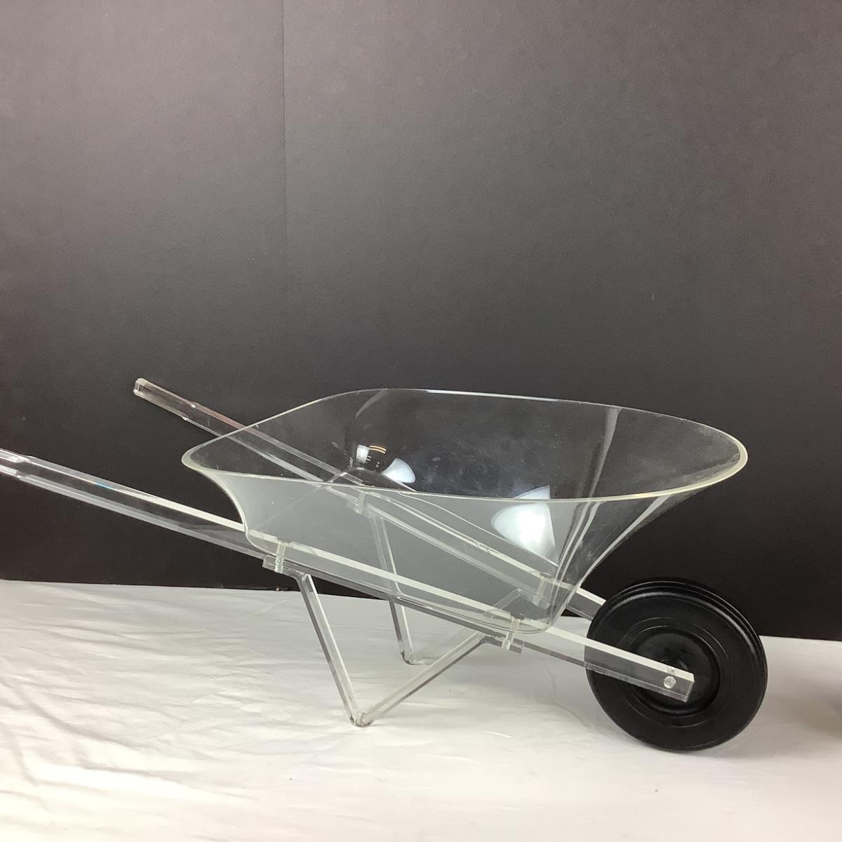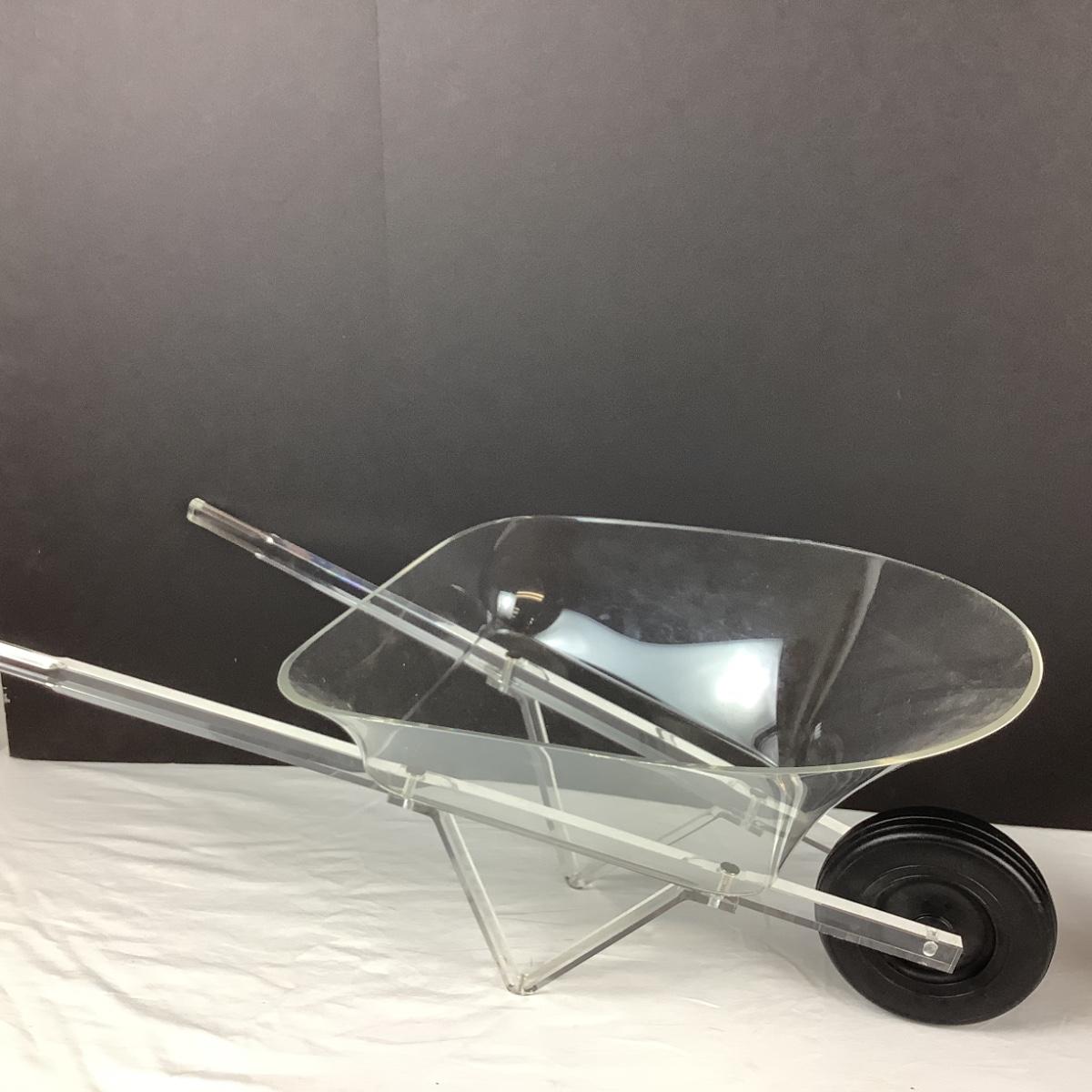 Small Clear Acrylic Wheel Barrow measures 8.5” High x 12.25” Wide x 23” Deep