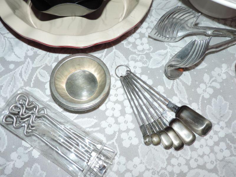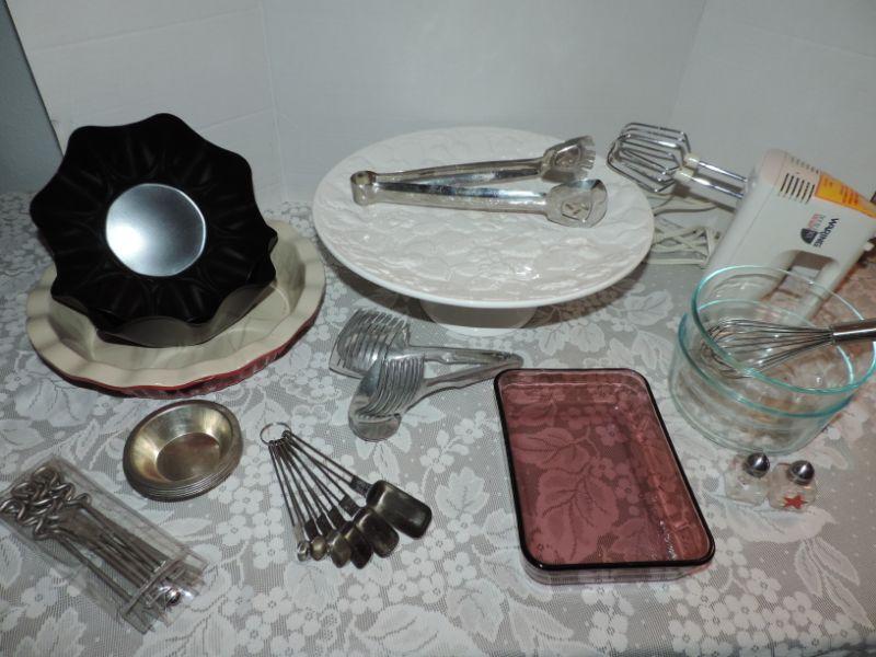 PEDESTAL CAKE STAND-HAND MIXER-GLASS BAKING PAN-MEASURING SPOONS AND MUCH MORE