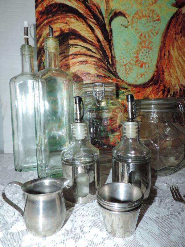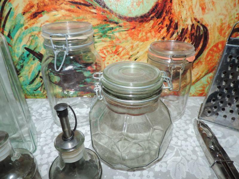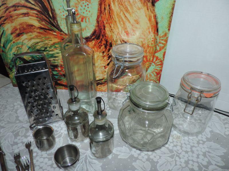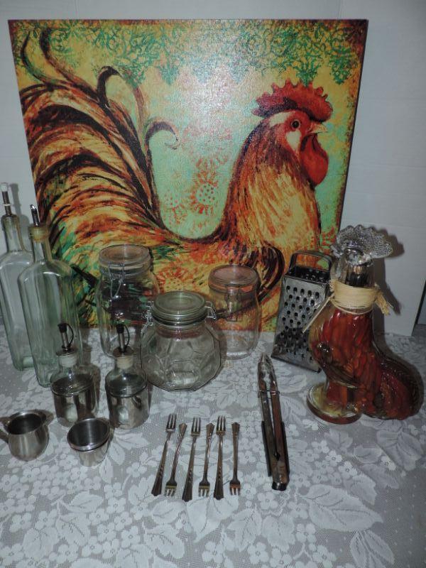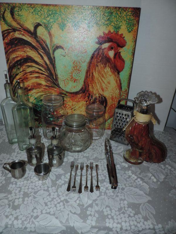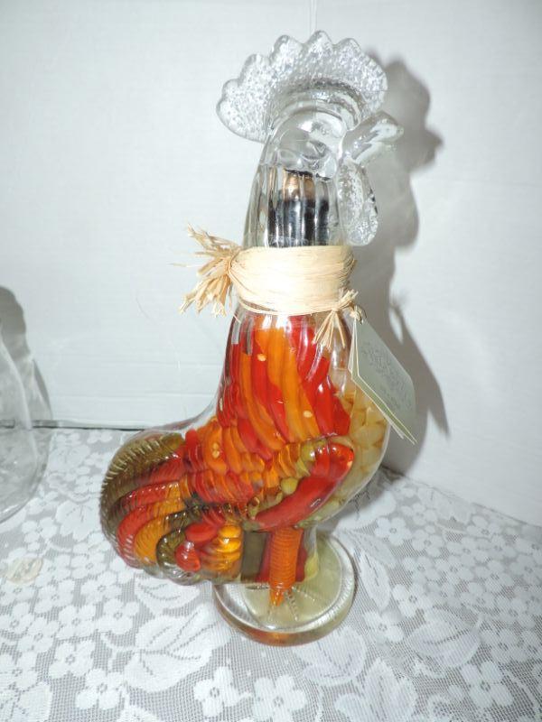 ROOSTER JAR FILLER WITH PEPPERS 12', TALL GLASS CONTAINERS & BOTTLES, ROOSTER PAINTING AND MORE