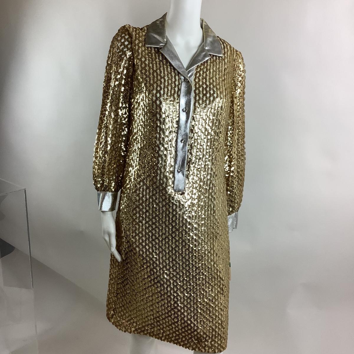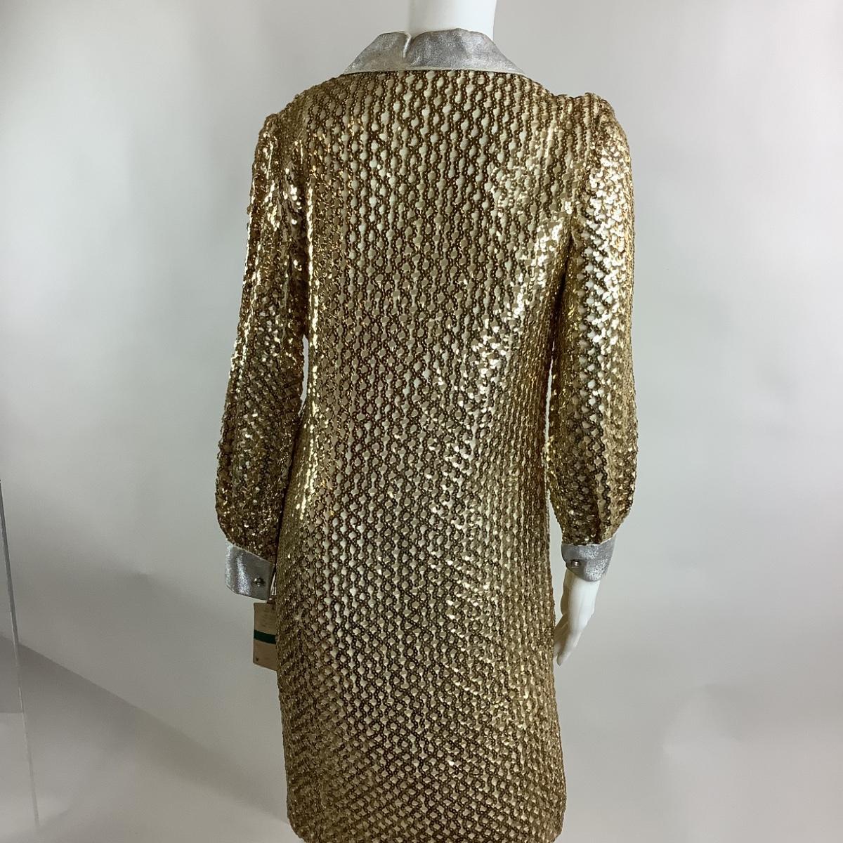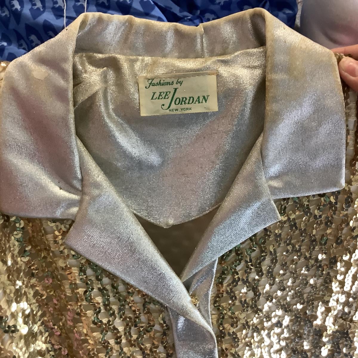 Lot 545 Vintage 1950's Lee Jordon Gold Sequins Dress with Metallic Collar, Faux Gem Buttons