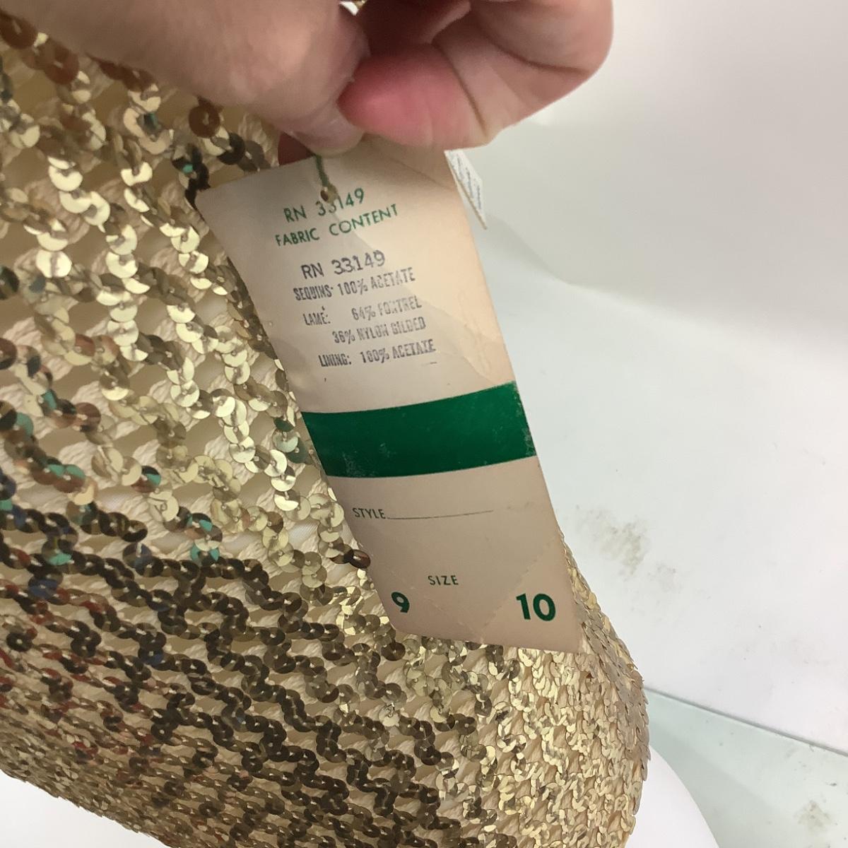 Vintage 1950's Lee Jordon Gold Sequins Dress with Metallic Collar/cuff, Faux Gem Buttons ( snaps ) with original tag