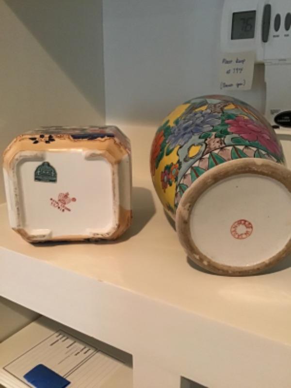 Covered jar is marked Royal Crown and vase is marked made in Japan