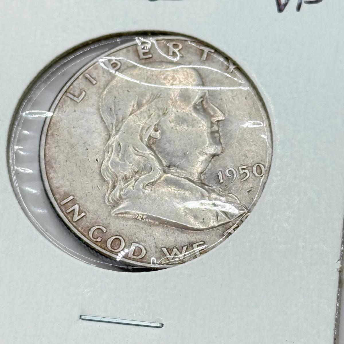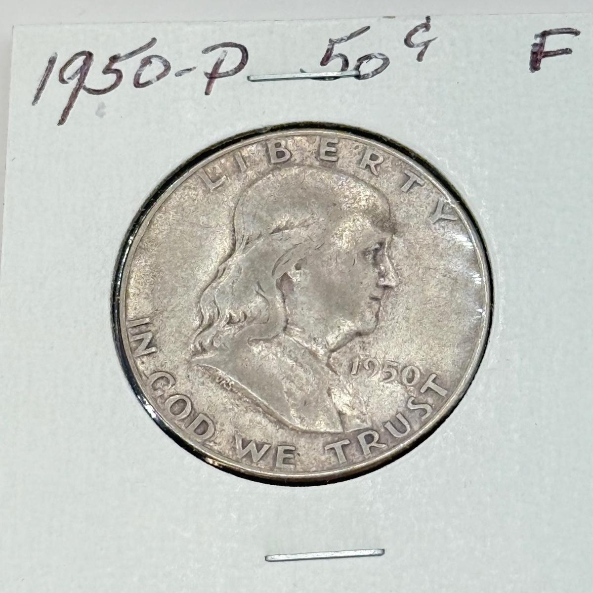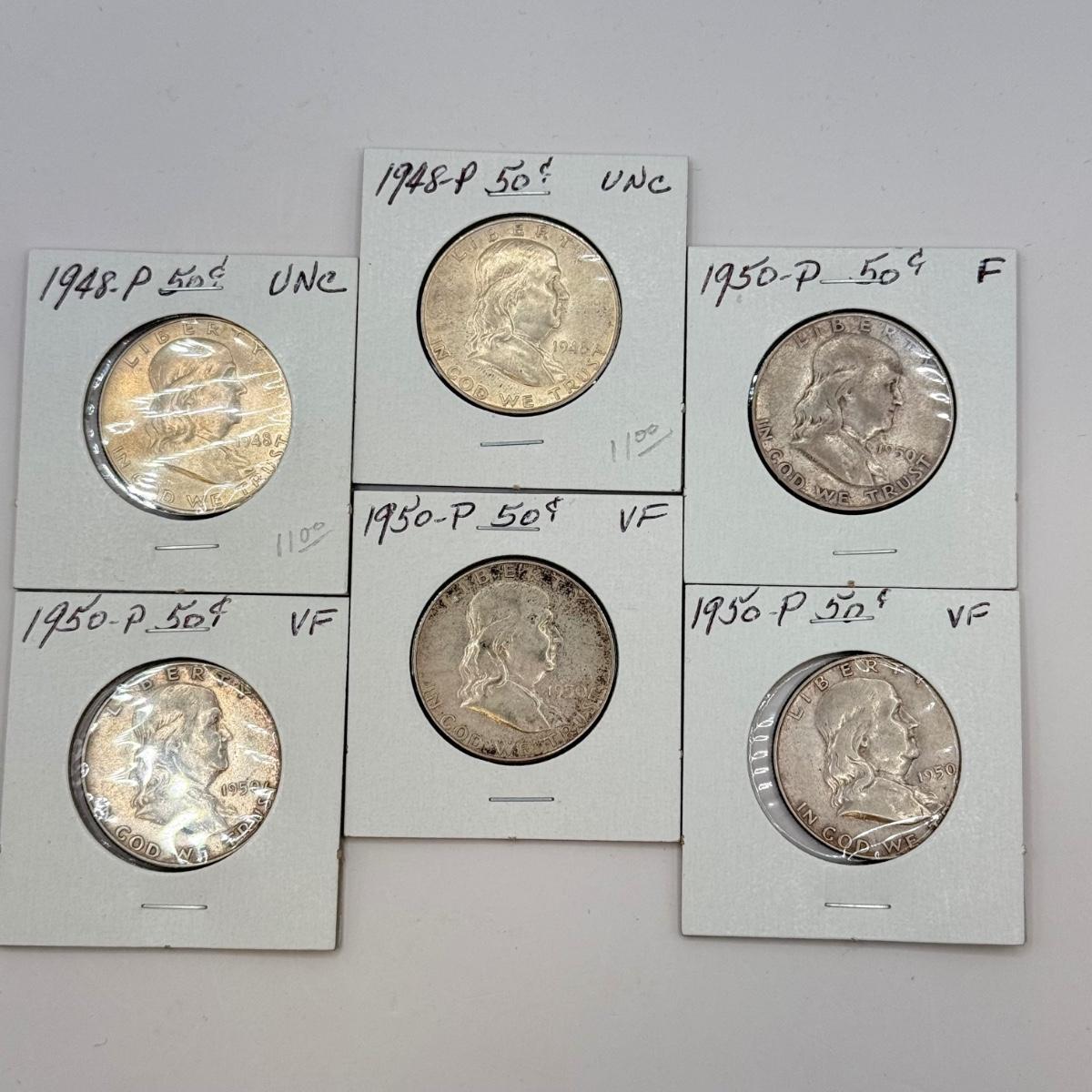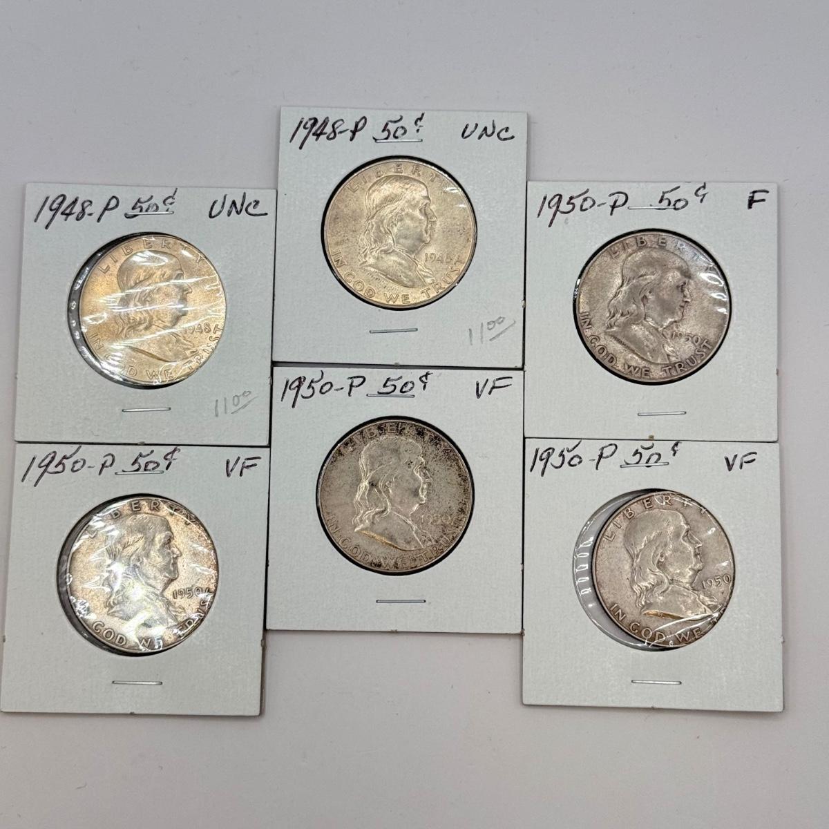 LOT 547J: 1948-P & 1950-P Benjamin Franklin Liberty Bell US Half Dollar Coins (90% Silver)