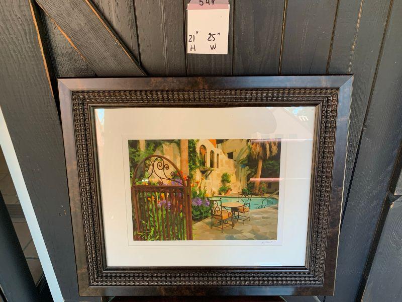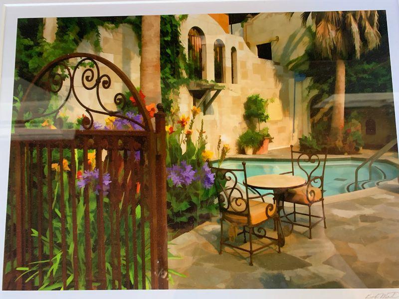 Framed Picture pool with patio table and building