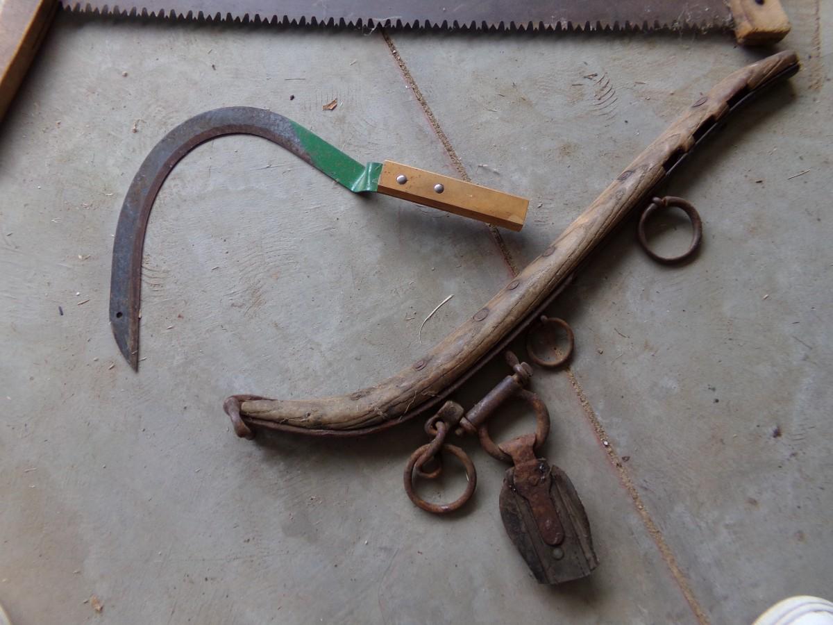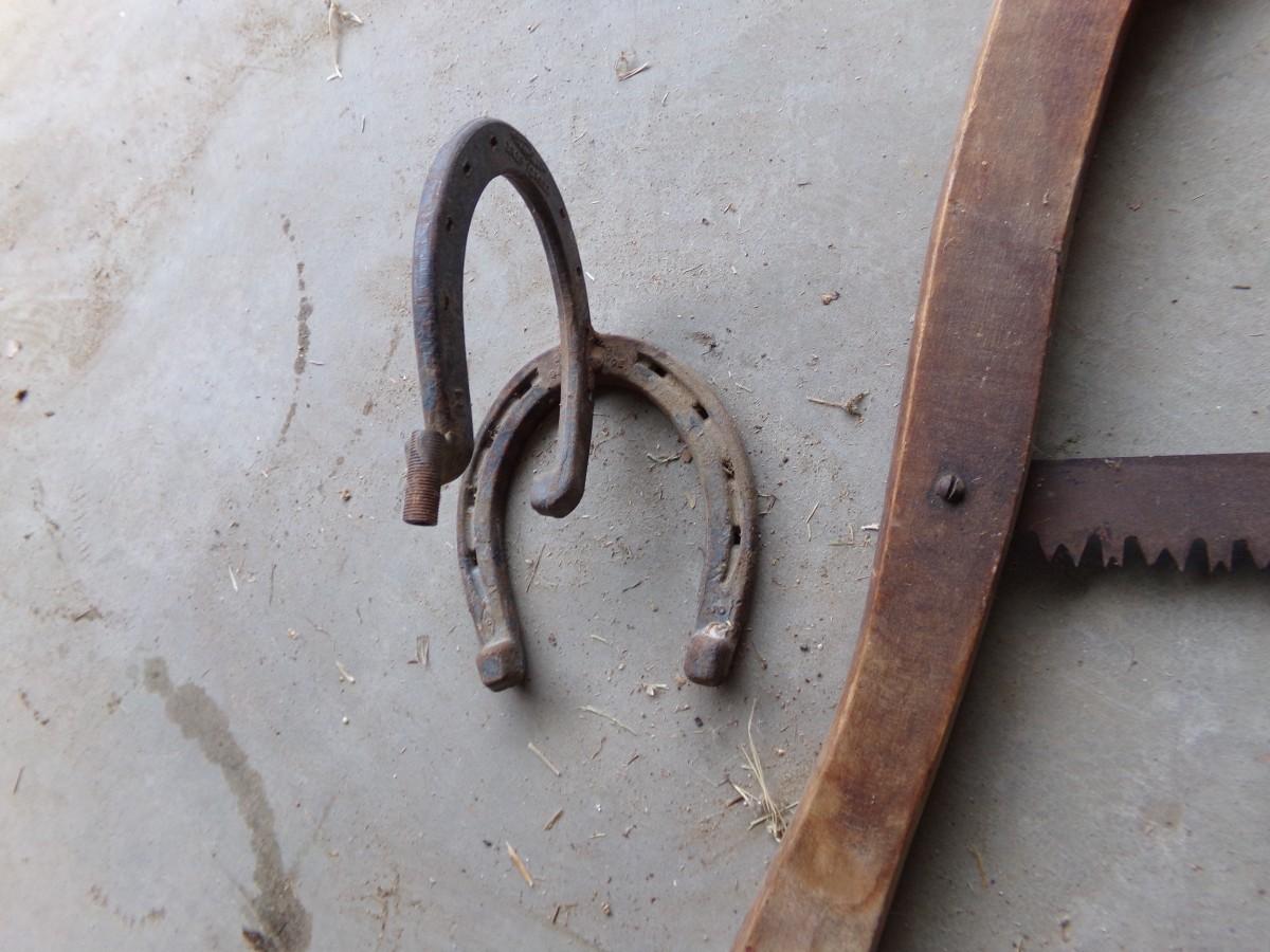 VINTAGE HAND SCYTHE SICKLE, BUCK SAW, HAND TOWEL HOLDER MADE FROM USED HORSESHOES AND AN OXEN YOKE