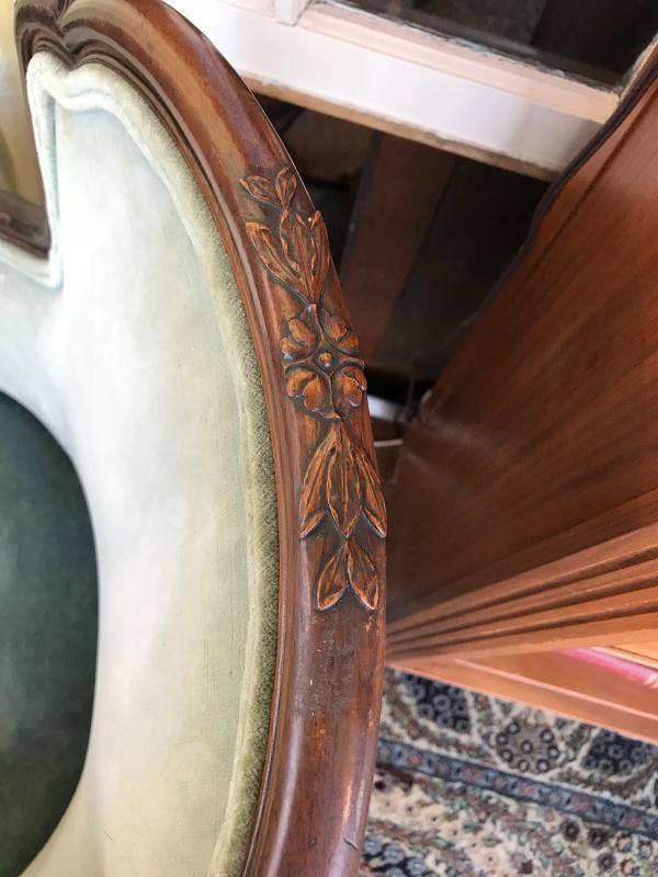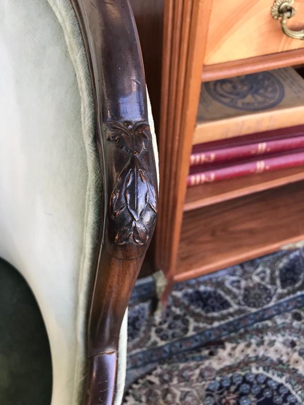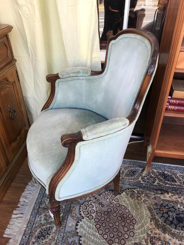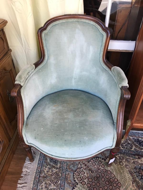Nice antique French Louis XV style armchair. Pale green velvet upholstery. Sits very well. Very nice condition. 24" x 24 1/2" x 35" H