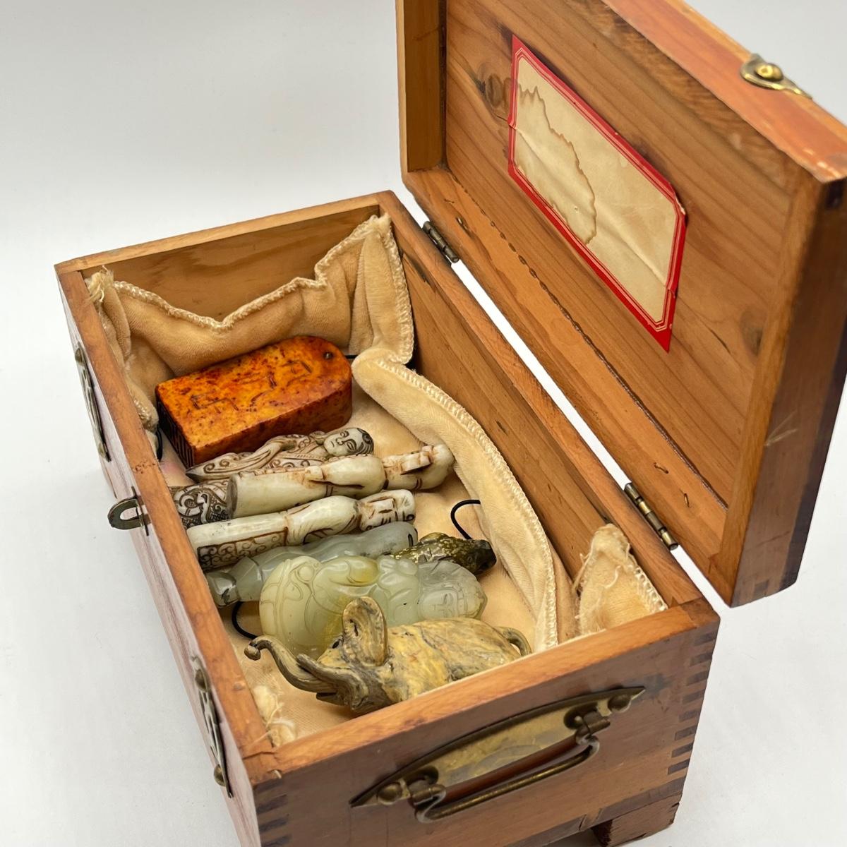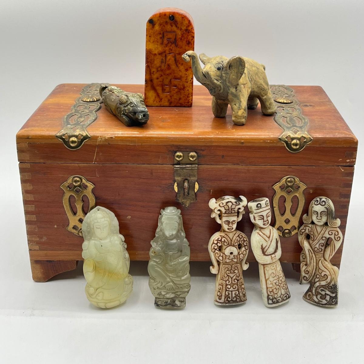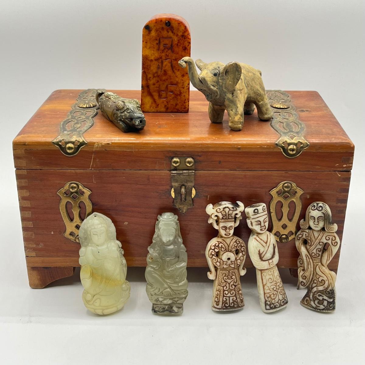 LOT 54B: Collection of Hand Carved Oriental Jade Pendants + More in Wooden Trinket Box