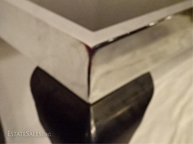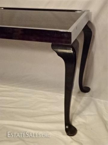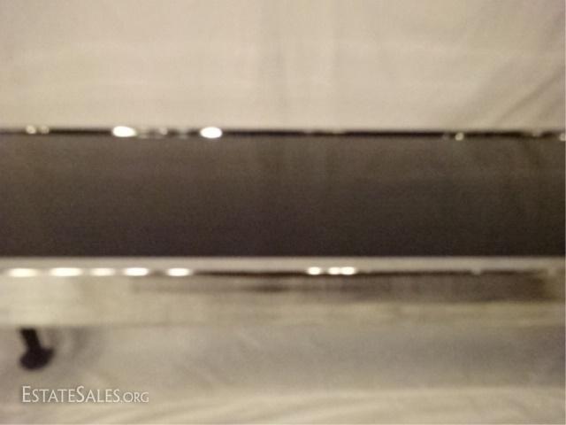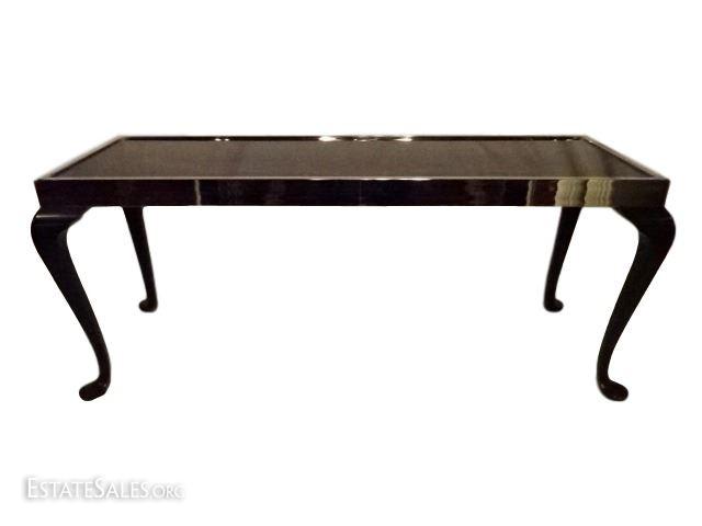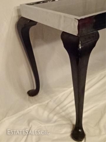 LOT 54C: MID CENTURY MODERN CHROME AND WOOD CONSOLE, BLACK GLASS INSET TOP IN CHROME FRAME RAISED ON BLACK ENAMEL CABRIOLE WOOD LEGS WITH SPADE FEET, VERY GOOD CONDITION WITH MINOR WEAR, 66"W X 29"H X 22"D, SKU387.38