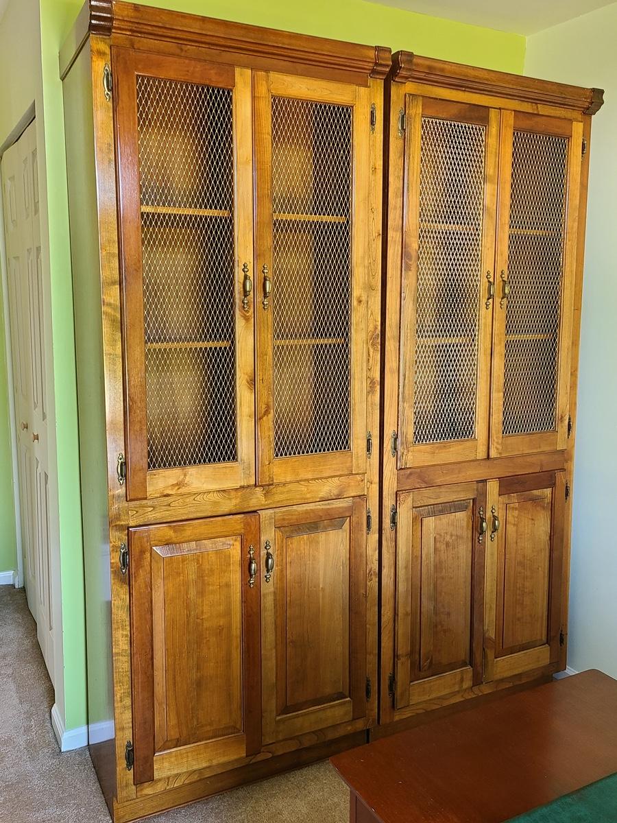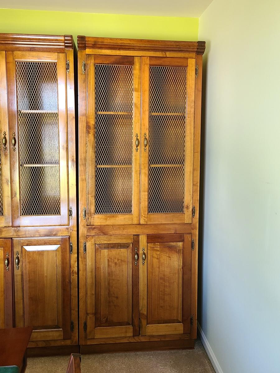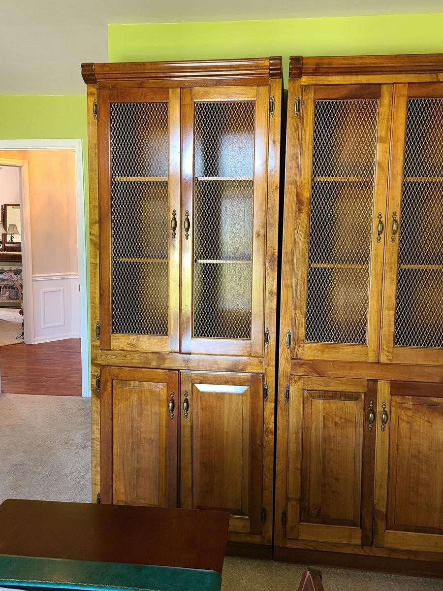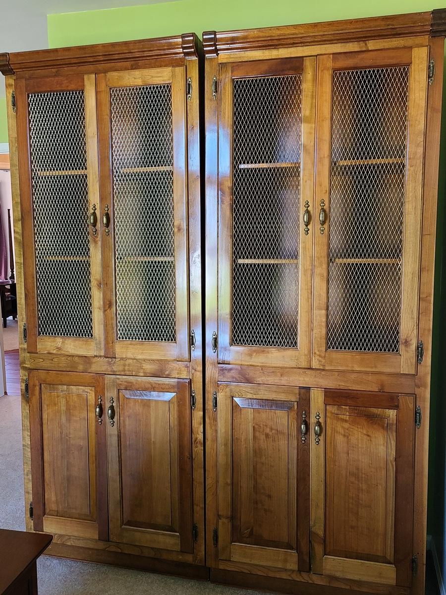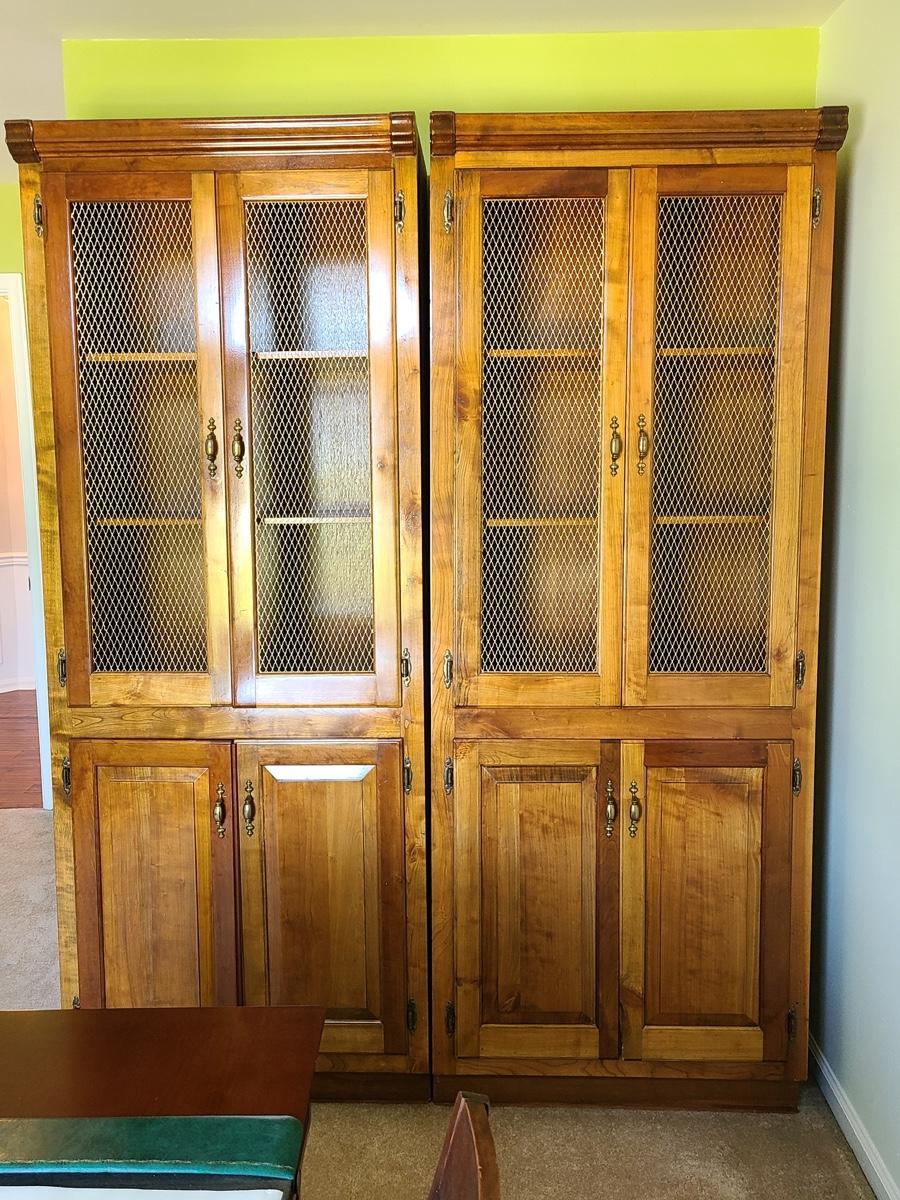 This set is gorgeous in person and is perfect for any room in the home. You can keep together as a set or use in two different rooms. Sturdy, solid, and lots of storage! The top boasts wood frames with metal lattice work doors. They around 84 inches tall, 16 inches deep, and 54 inches wide. These are on the second home and you will need to bring help to move. Please see all pictures as they are the best representation of the items in the lot, the condition of the lot, and will show measurements if taken. If purchasing furniture you must be able to move yourself with your own help, and truck. .