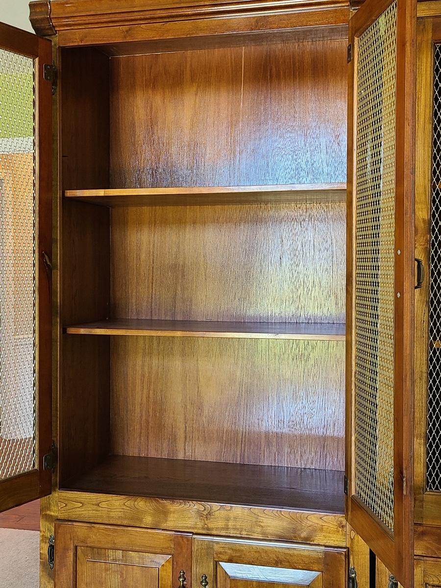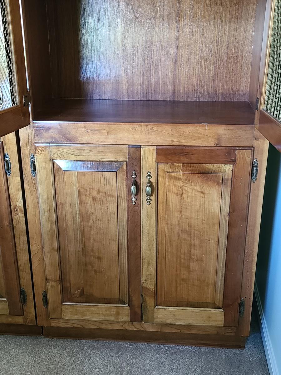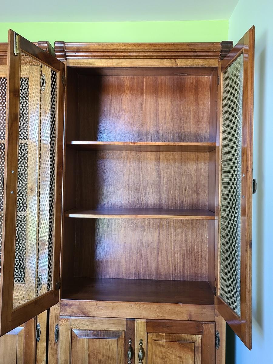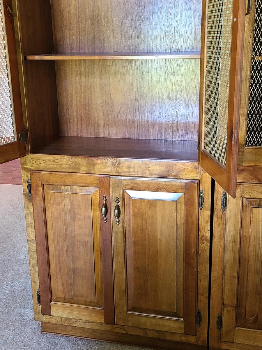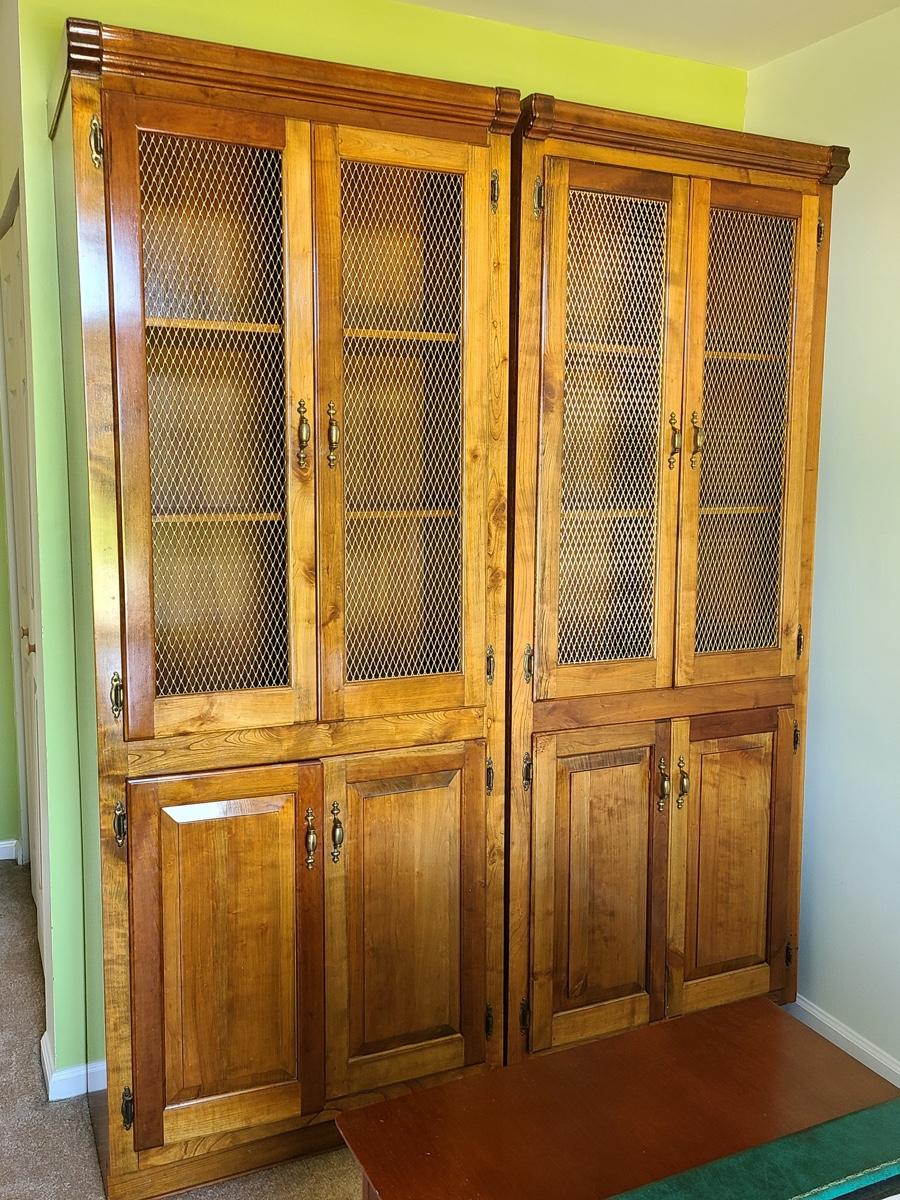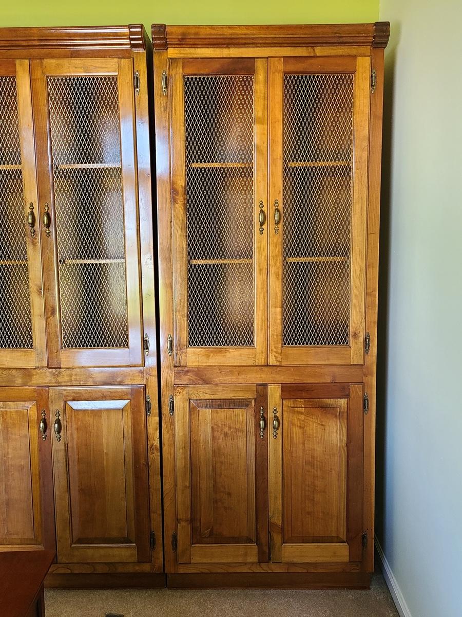 This set is gorgeous in person and is perfect for any room in the home. You can keep together as a set or use in two different rooms. Sturdy, solid, and lots of storage! The top boasts wood frames with metal lattice work doors. They around 84 inches tall, 16 inches deep, and 54 inches wide. These are on the second home and you will need to bring help to move. Please see all pictures as they are the best representation of the items in the lot, the condition of the lot, and will show measurements if taken. If purchasing furniture you must be able to move yourself with your own help, and truck. .