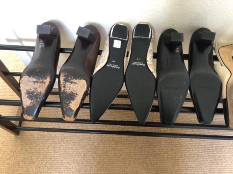 Lot 54U. Eight pairs of shoes: vintage Russel & Bromley heels, 7 used, 1 new, Size 9 with square buckle; 40.5 black tie up-toe harness clasps, size 40, 4 pairs of heels, 1 pair of brocade flats, new)--$275