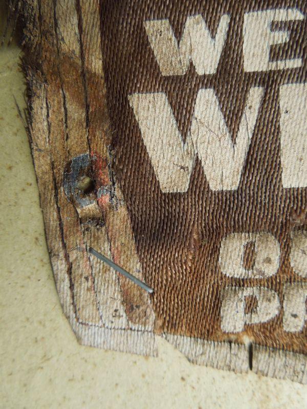 This is a fabric remnant from a pocket (I imagine) that has been stapled onto a stiff piece of cardboard and covered with a light blue plastic shield for protection from sun. It is about 8" h x 5.5" w. See close up shots for damage. There are a few small tears and some of the ink from the silk screen has deteriorated. Very rare.