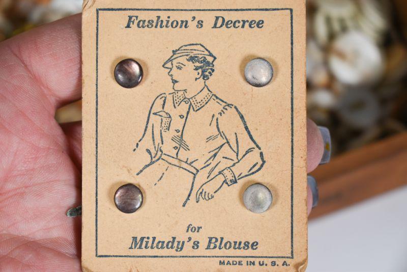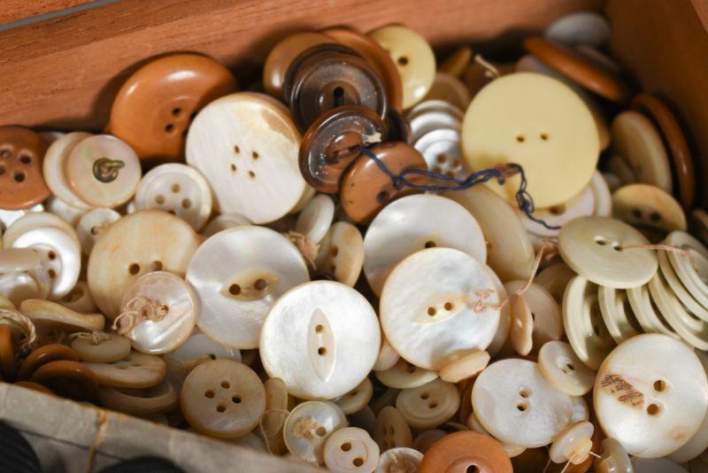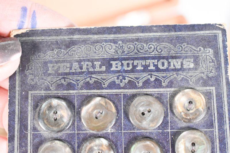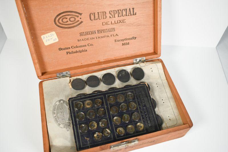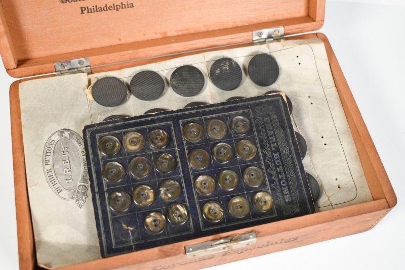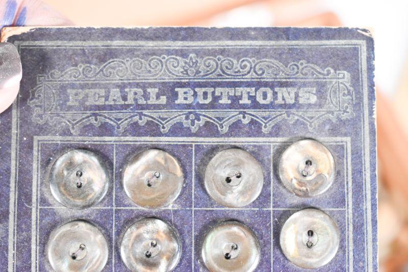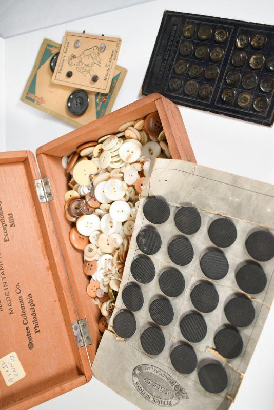Pearl buttons still on card, plus a vintage wooden cigar box filled with loose buttons of all sizes. **Please read Terms and Conditions before placing a bid. Pick up is Sunday, December 22 from 11am to 3pm or Monday, December 23 from 4pm-7pm in Mantua, NJ. All sales are final. All sales are as is, where is. Please review all photos. Props are not included. Measurements are approximate.
