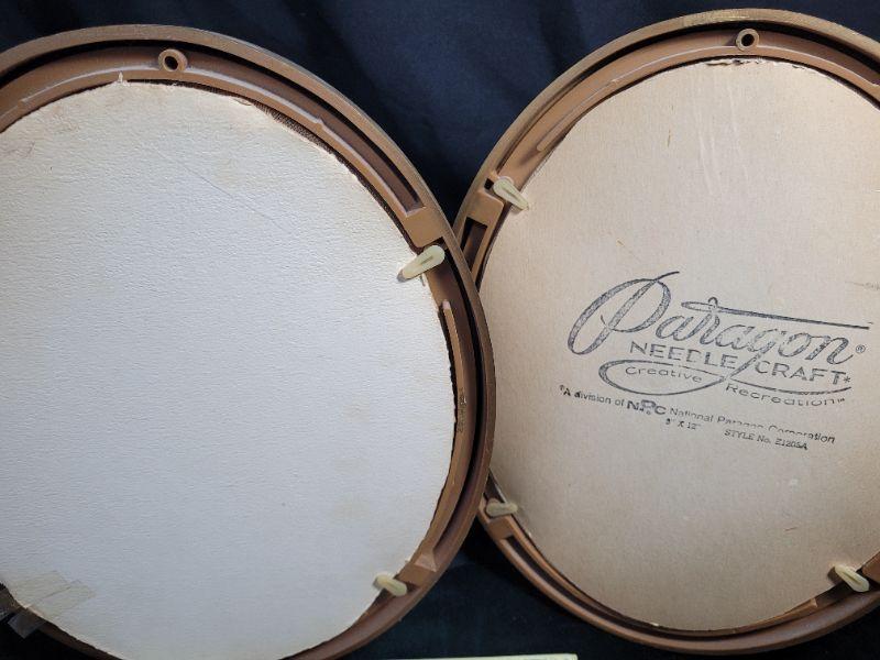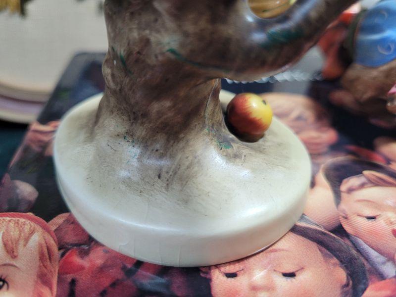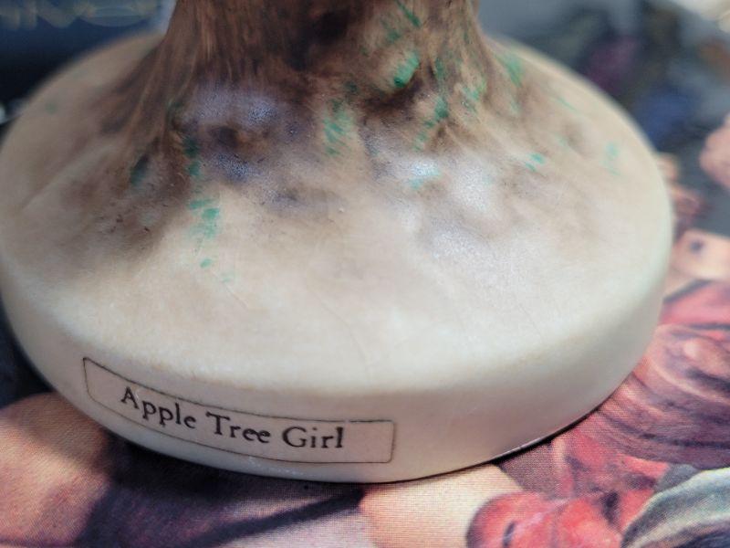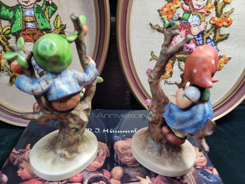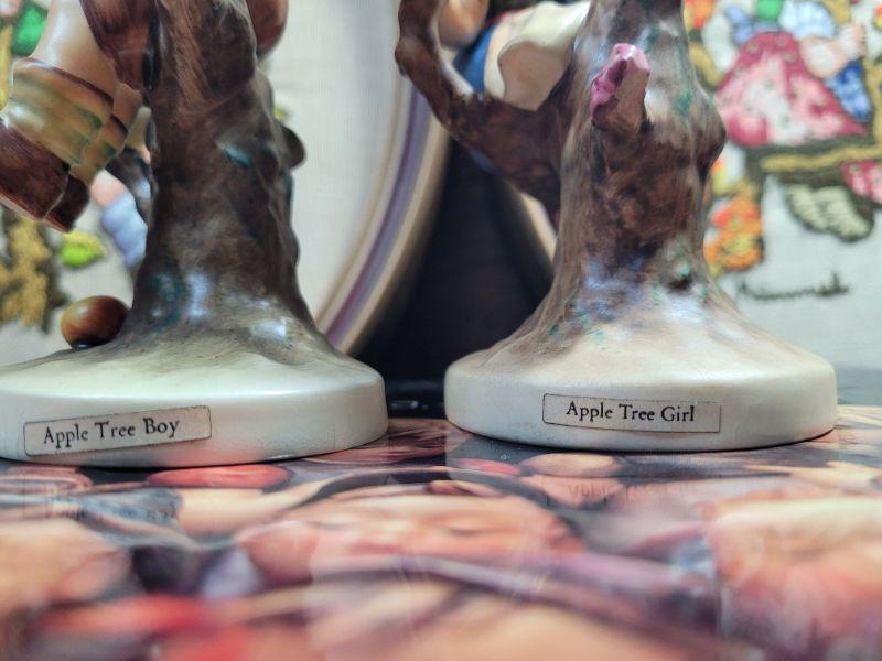 Apple Tree Girl" (TMK 3ss) & "Apple Tree Boy" (TMK 5) have very mild crazing around their bases. VERY sought after Pair, Rare and Valuable. Also comes with two framed needlepoint of both figurines for free. They measure 13" height, 10" length, 1" width.