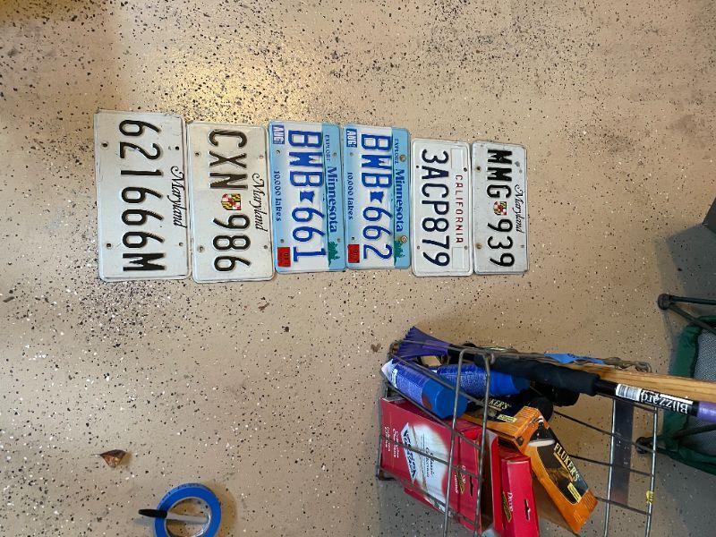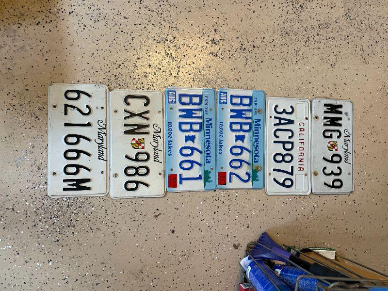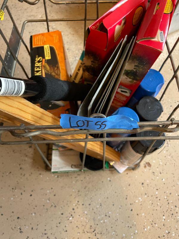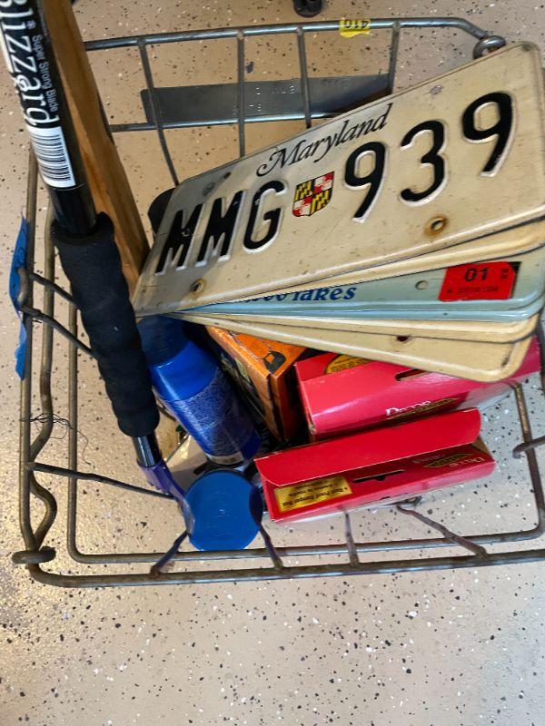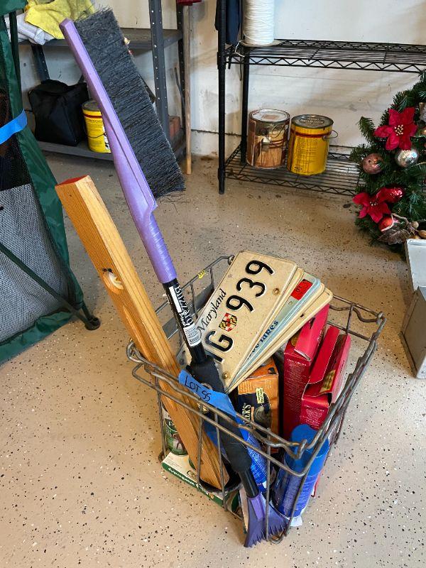 Lot 55 -  (6) vintage license plates, metal basket, level, misc. sprays and supplies