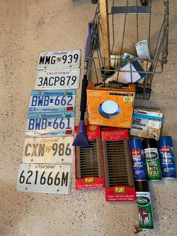 (6) vintage license plates, metal basket, level, misc. sprays and supplies.