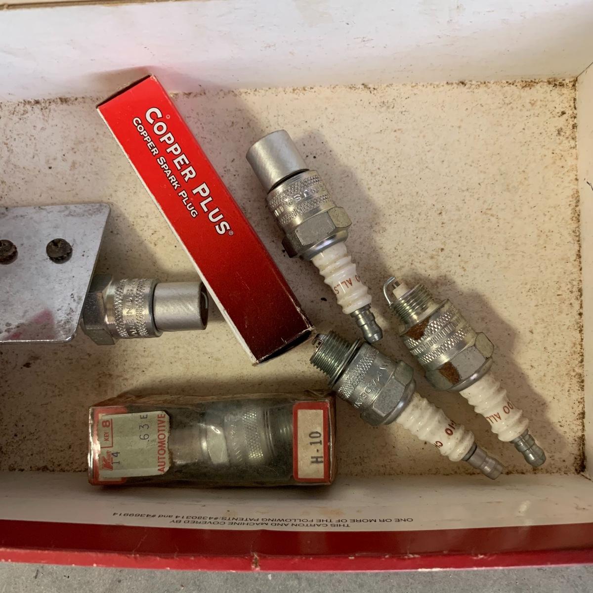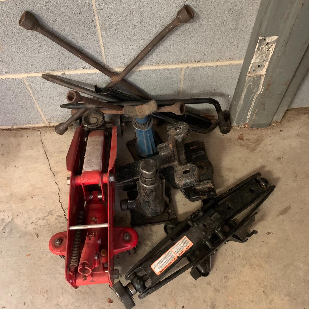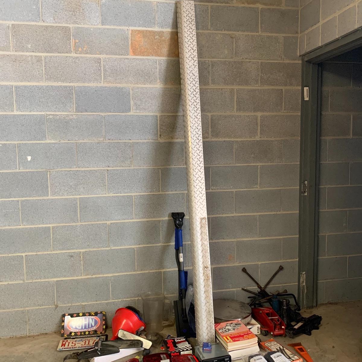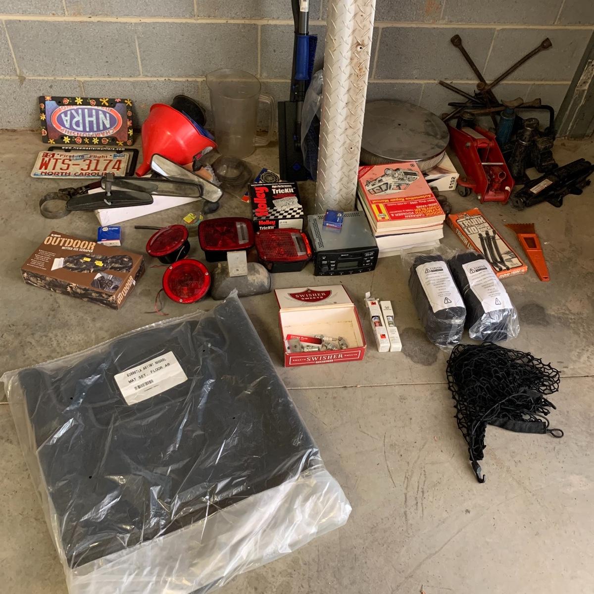 This lot includes everything you would need for the decoration of a car such as car mats, licence plate covers, car lights, rear view mirrors, and more. It also includes supplies for car maintenance such as ice scrapers and brushes as well as Honda touch up paint. It also includes car tools such as, scissor jacks, lug wrenches, carburetor service parts, funnels, copper spark plugs, work gloves and net, a tire chain tightener, and more. The lot includes a car radio, car repair manuals, automotive air filters, and more. The large metal piece measures about 97in tall. Local pick up only.