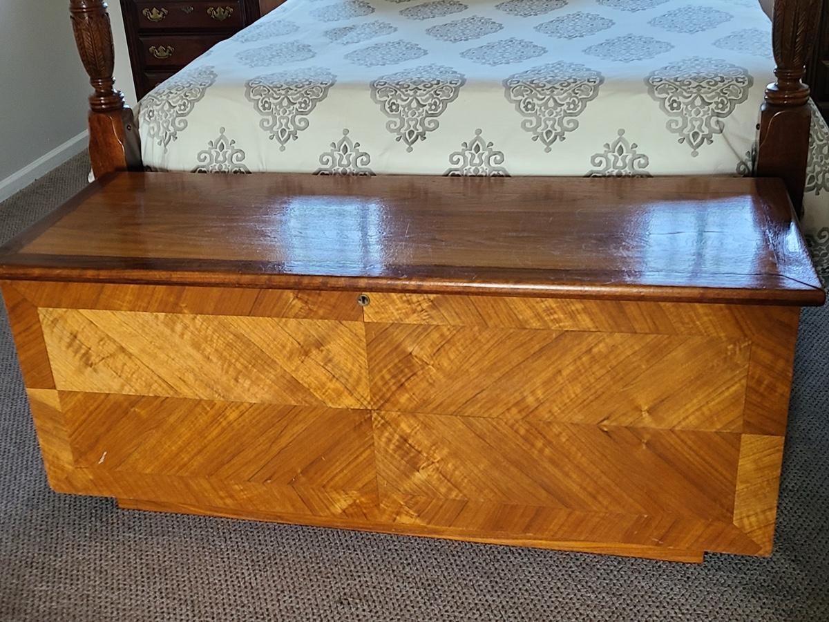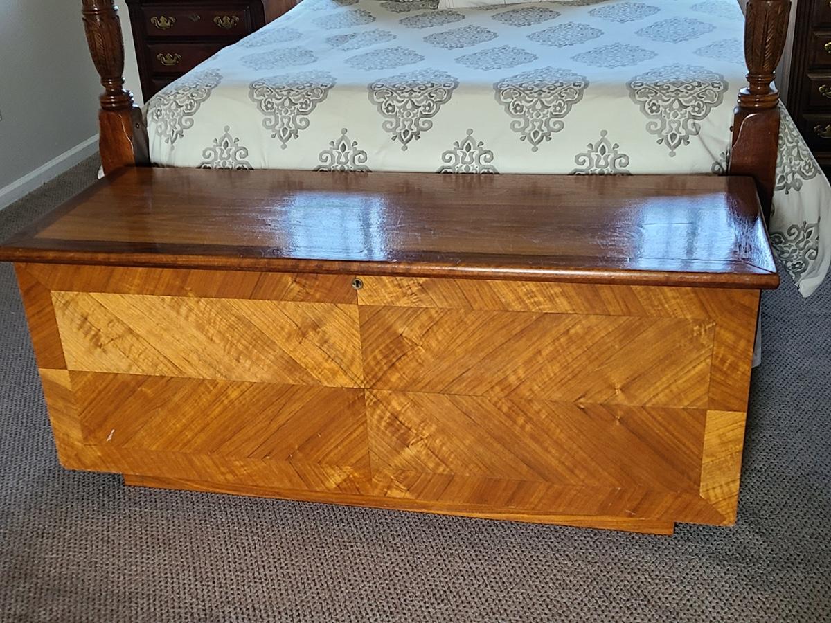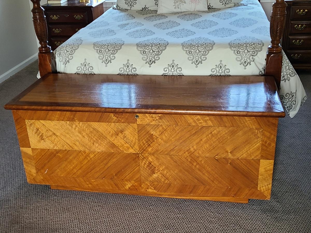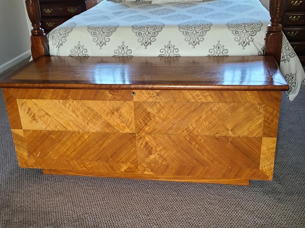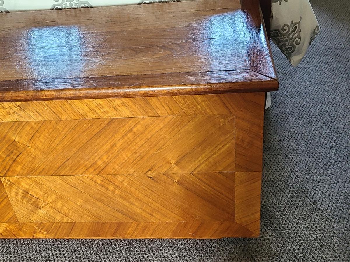 This is large and very sturdy, even enough to be full bench or coffee table! The color and wood grain is gorgeous and even though this is vintage or possibly antique it still looks new. It does need a hinge repaired. This is 58 inches long, 21 wide, and 24.5 inches high. Please bring help to move and this is located on the second floor and will need to be brought downstairs! Please see all pictures as they are the best representation of the items in the lot, the condition of the lot, and will show measurements if taken. If purchasing furniture you must be able to move yourself with your own help, and truck. .