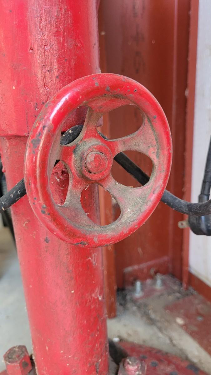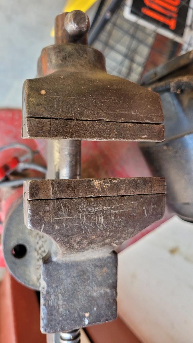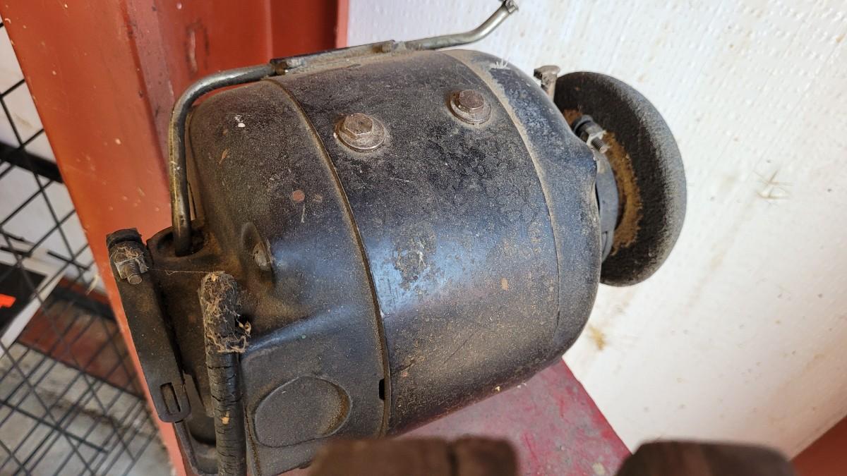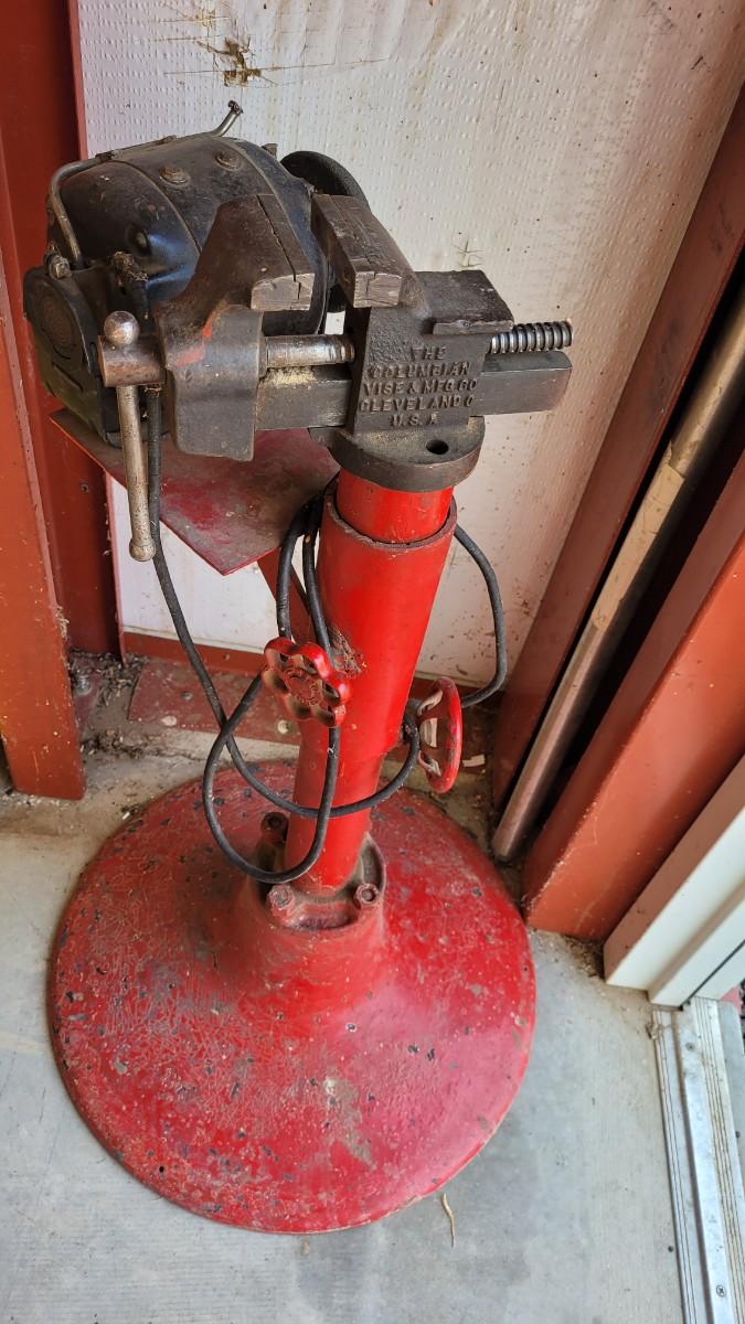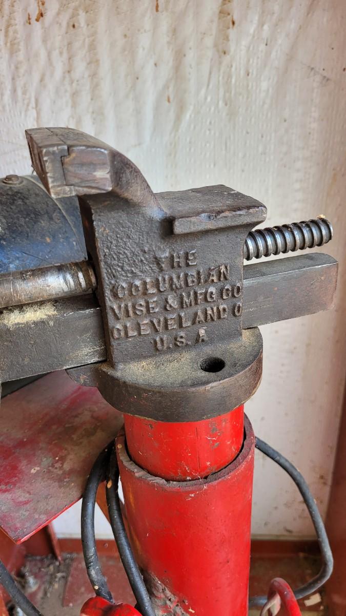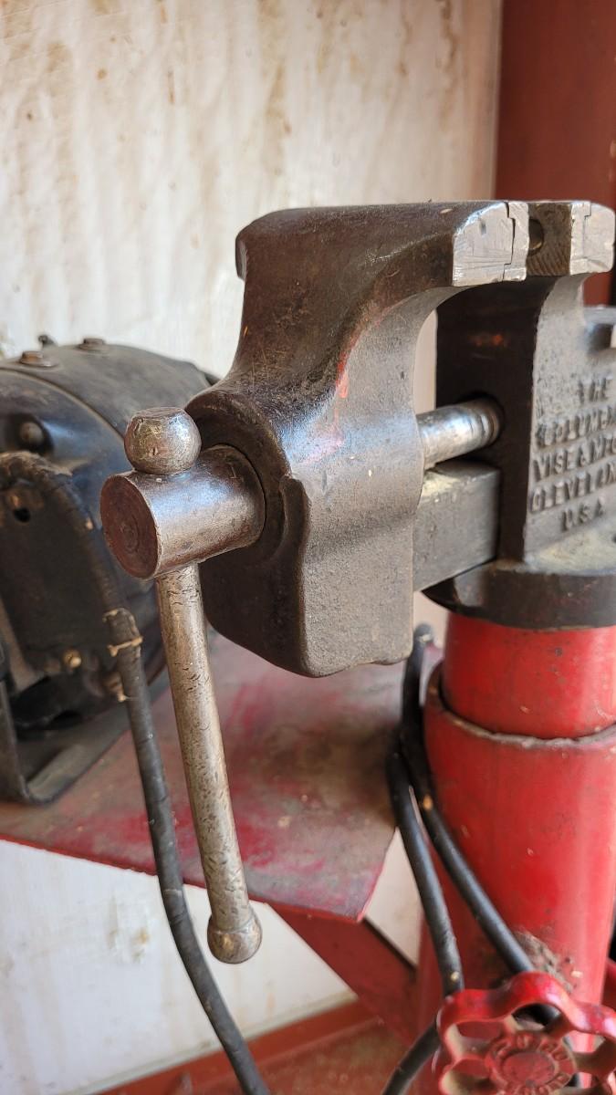 Lot 55: Vintage Red Chippy Paint Base w/ Columbian VISE and GE Bench Grinder