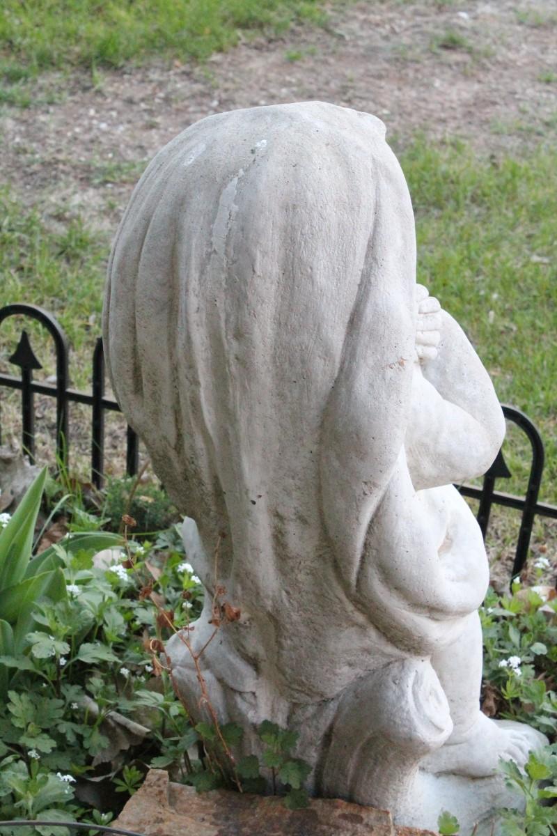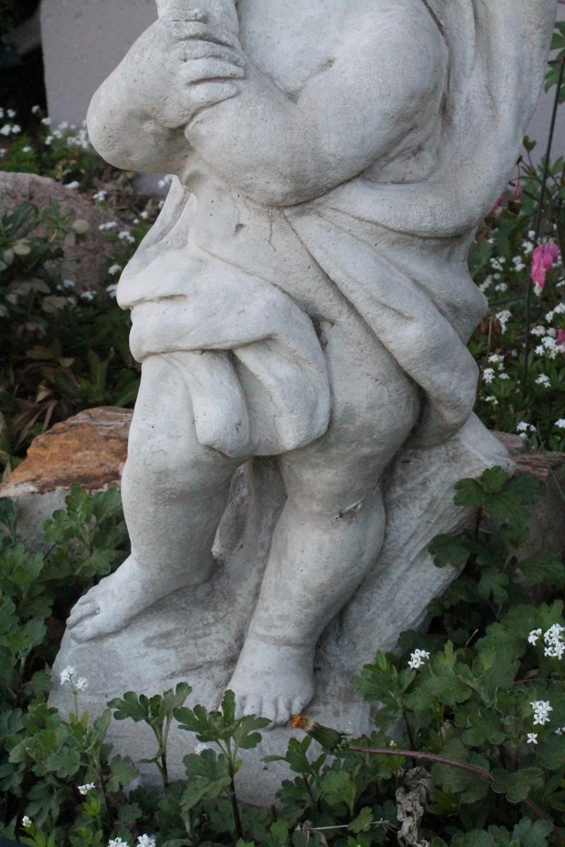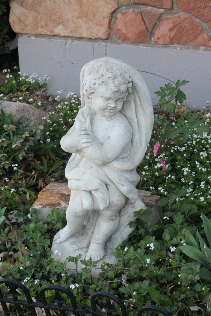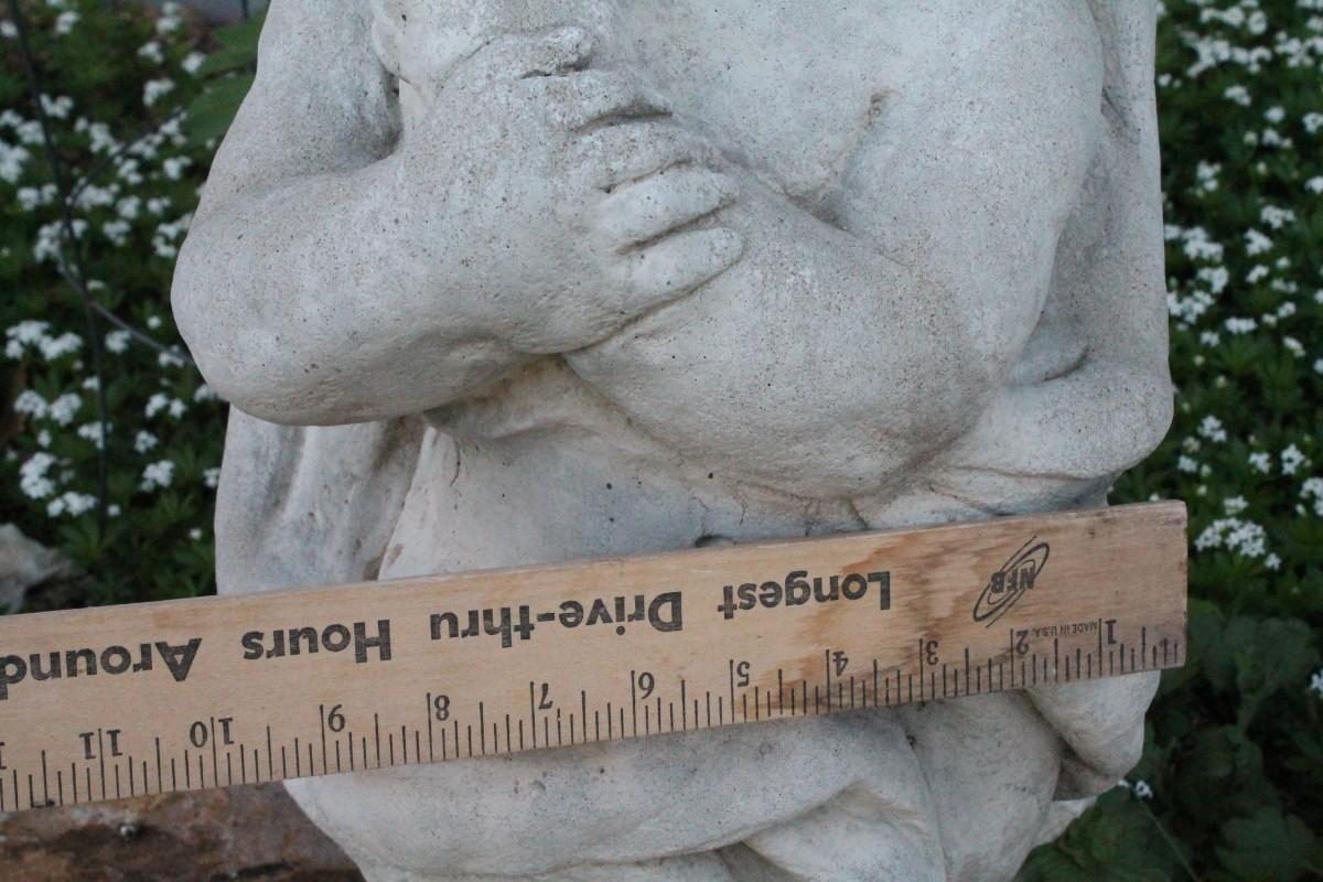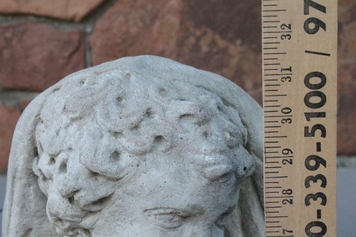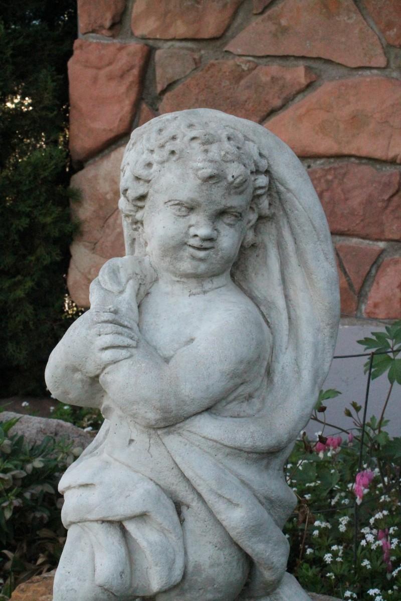 This vintage garden feature is a Angel Cherub wrapped in soft blanket. Great for adding some design to your outdoor spaces. About 32" x 10" .