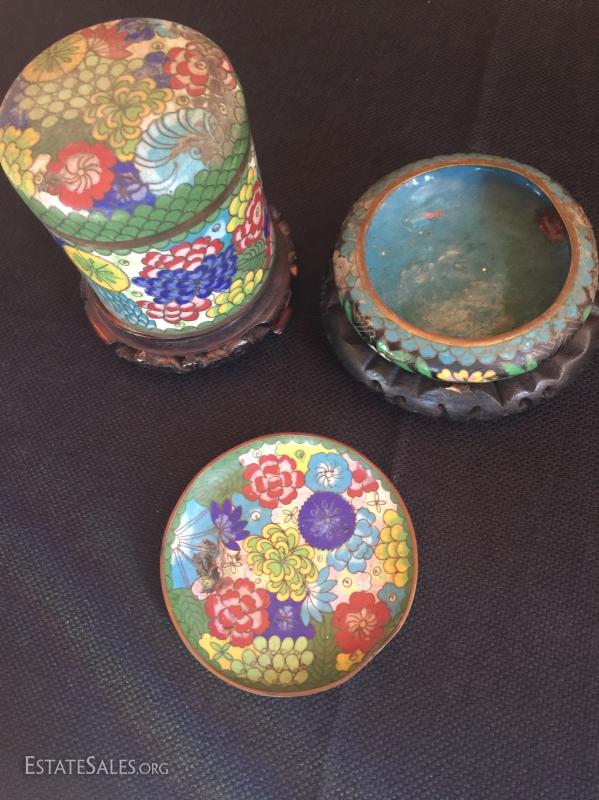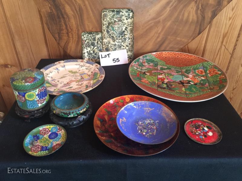Lot of various Asian style plates and cloisonné pieces. 10+ pieces. Sold as is . See photos for details.