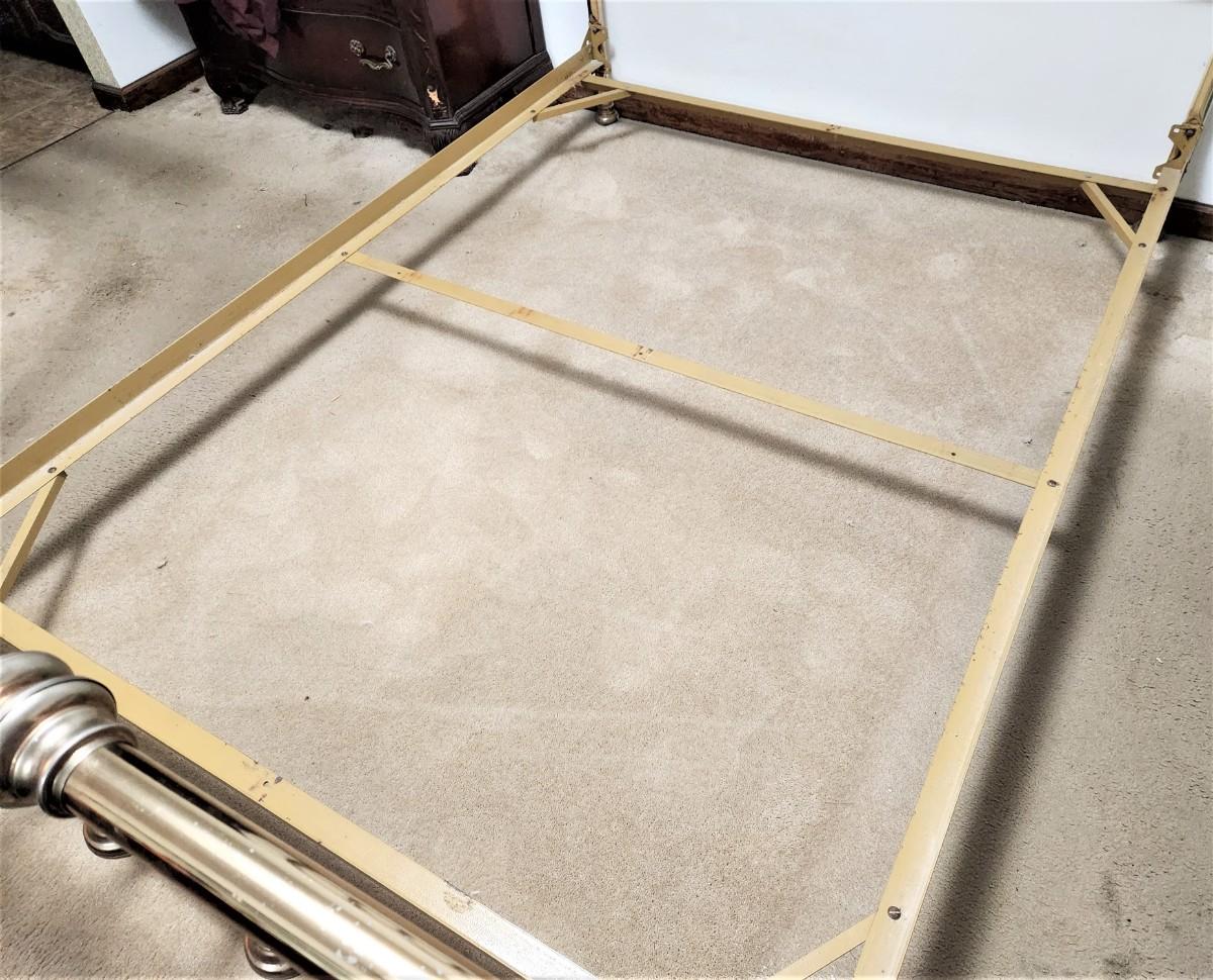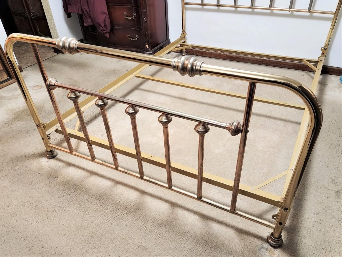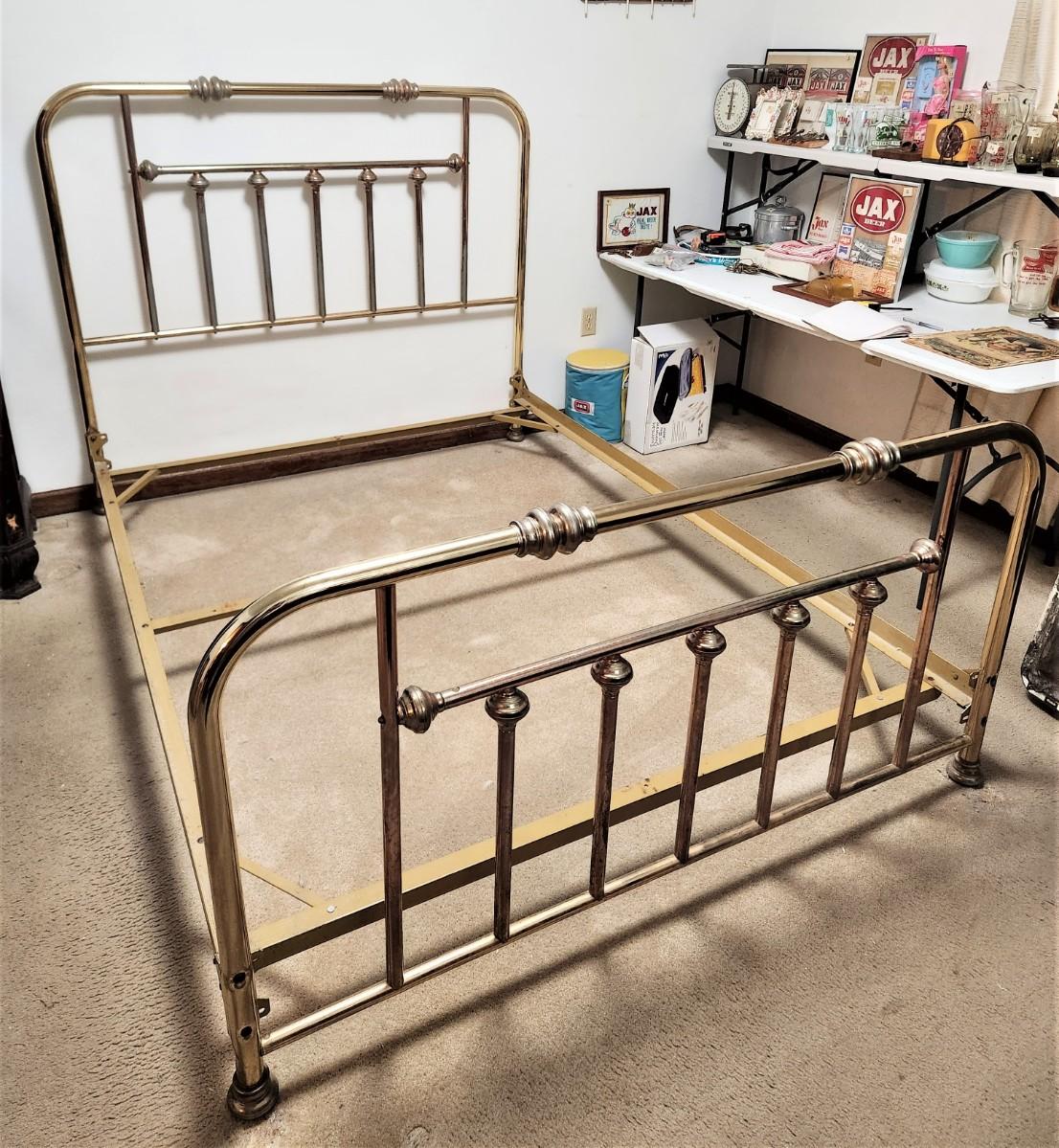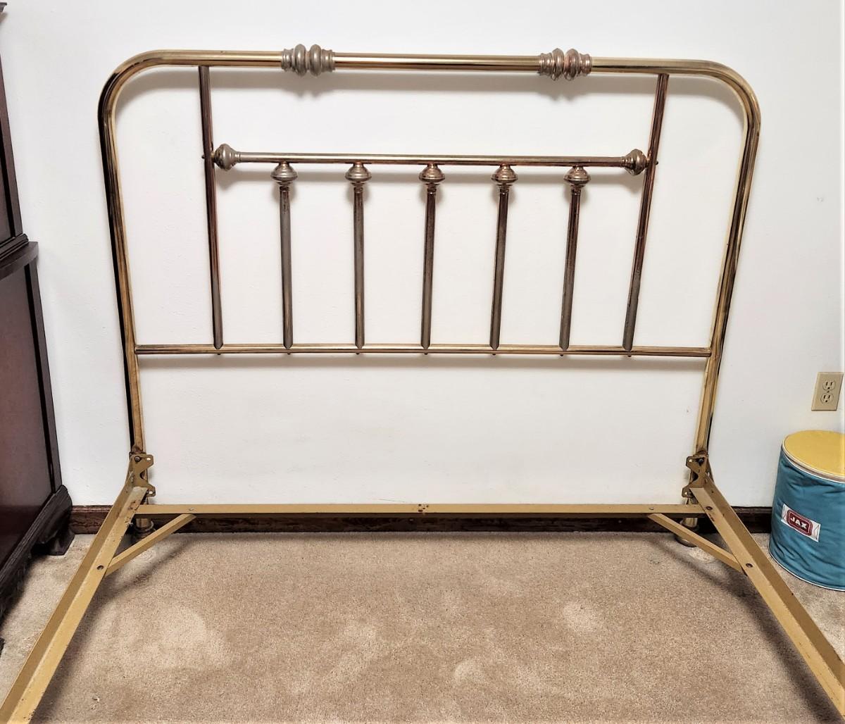 Brass finish double/full bed - no mattress set. 62" wide, 84" long, headboard 53" tall, footboard 34" tall. Used condition.