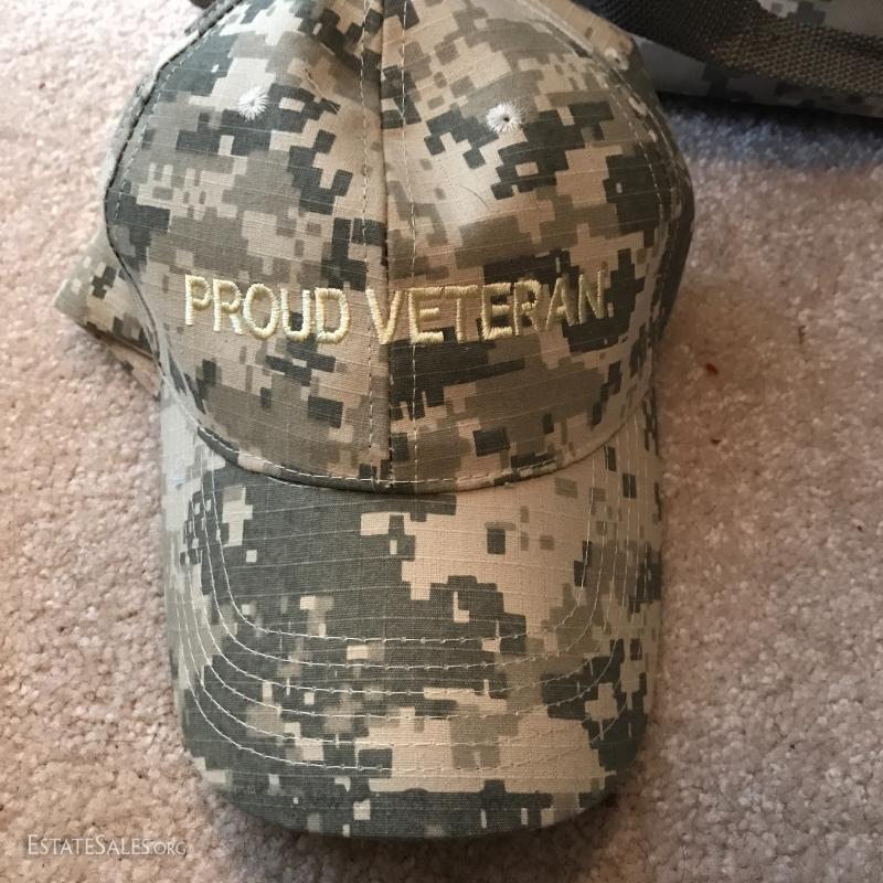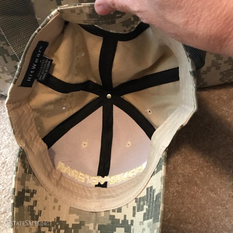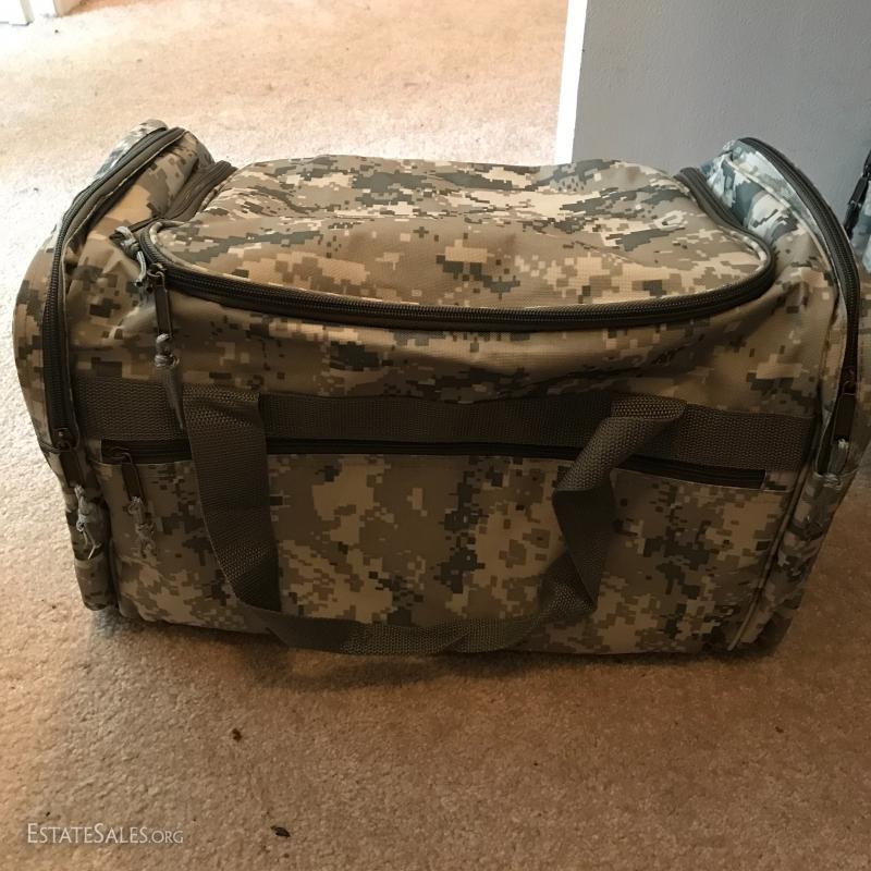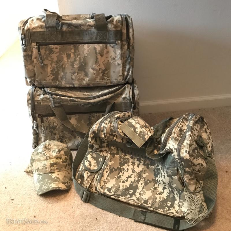 Three small duffle bags and a hat in camouflage. Largest one measures 18" x 10.5" x 12". This lot is available for shipping or local pick up in Mills River, NC.