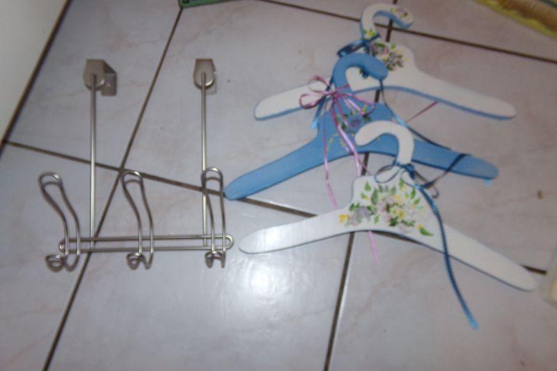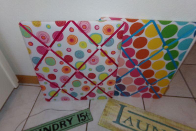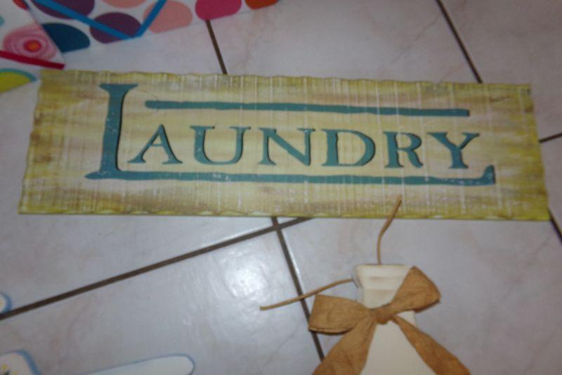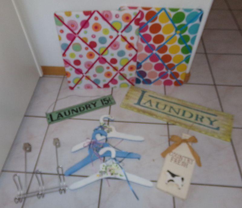 2 RIBBON PHOTO BOARDS, TIN AND WOOD LAUNDRY SIGNS, PAINTED WOODEN HANGERS, OVER THE DOOR HANGER AND MORE