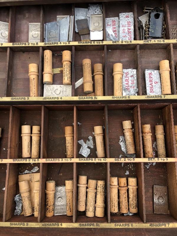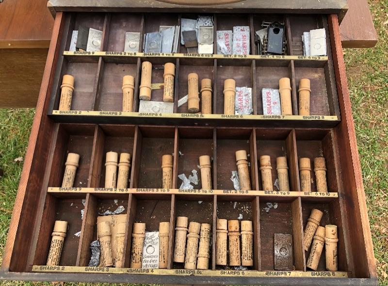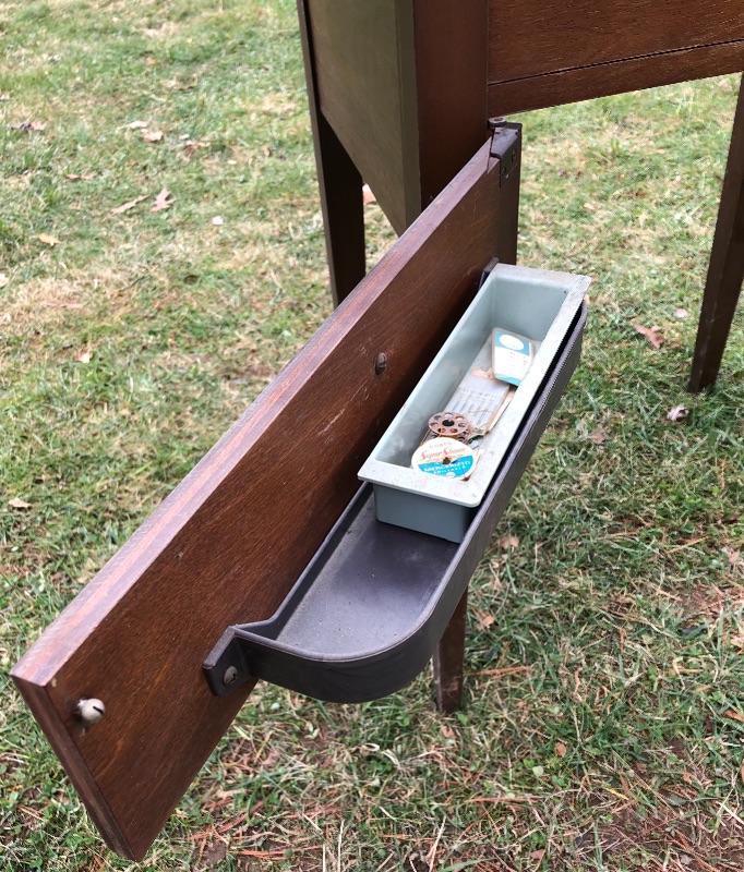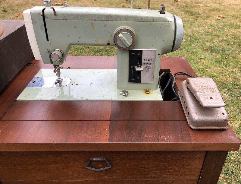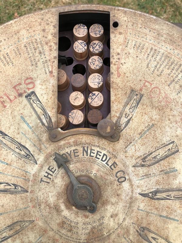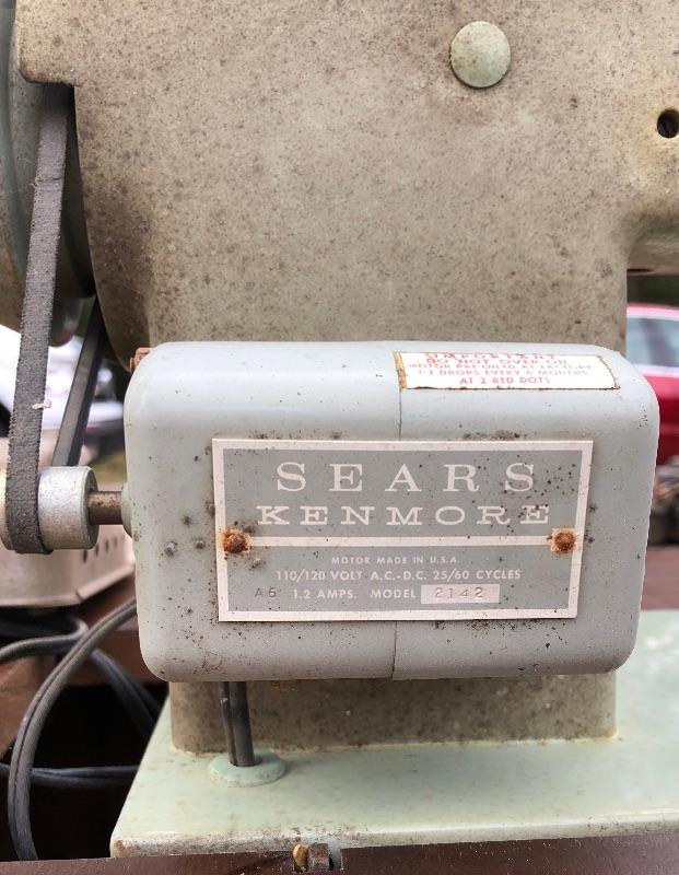 Vintage Sears Kenmore Sewing Machine Model 2142 with table. 23” L x 18” W x 31” H. Antique Boyle Needle Co. parts case for store display. 18” L x 20” W x 9” H. The rotating case is filled with NOS parts as well as the storage drawer in the back. Please see measurements, and all pictures for condition. Thank you for looking and have fun bidding.
