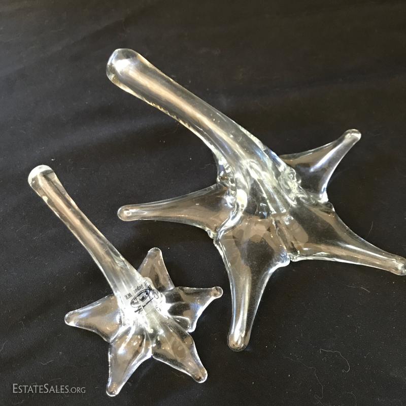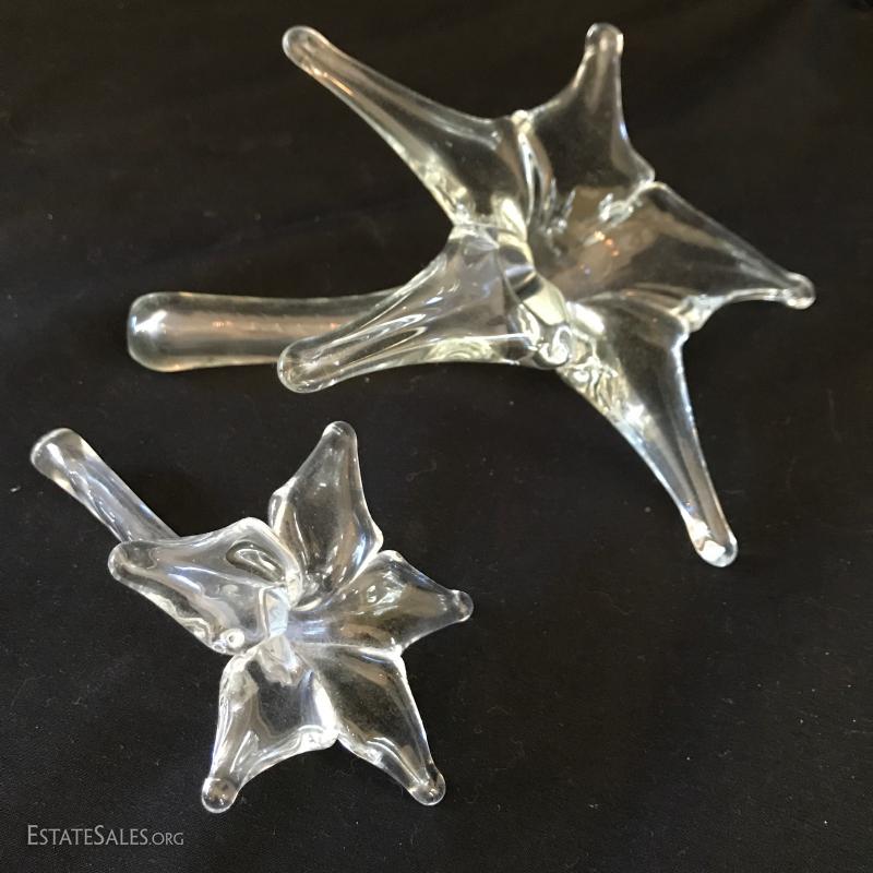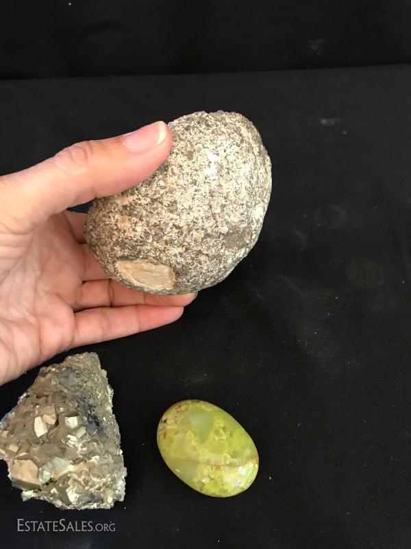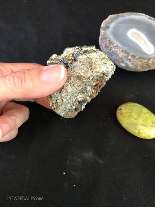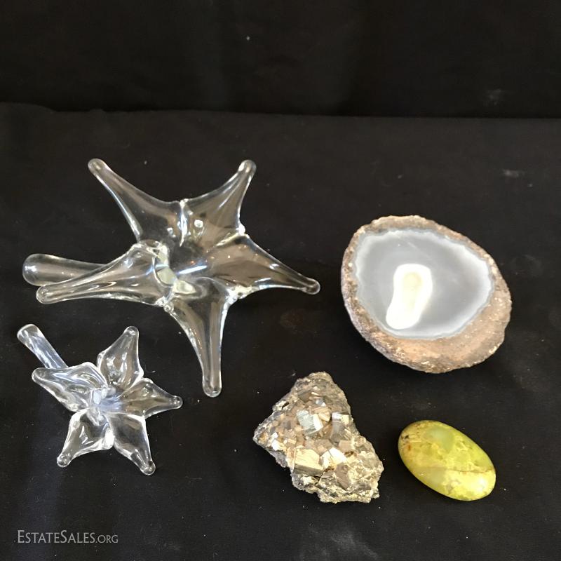 Two blown glass flowers by Robert Hamon Glass. Sticker says "Scott Depot W.V." Largest is 7." Three rocks including geode. See photos for details. Shipping available or local pick up in Flat Rock, NC.