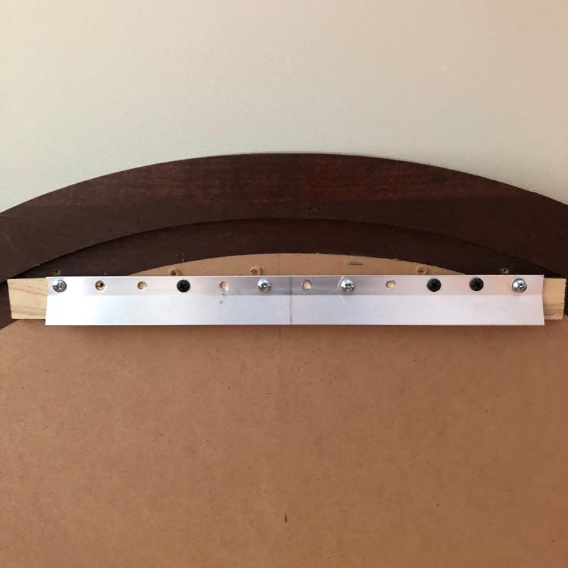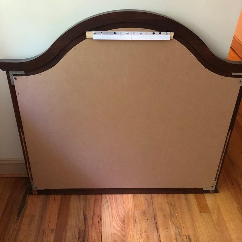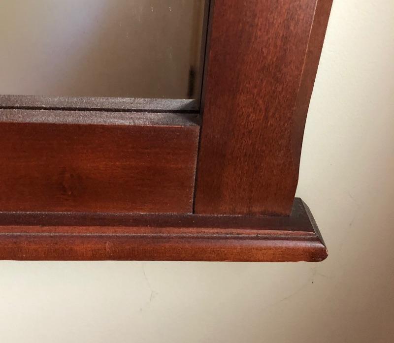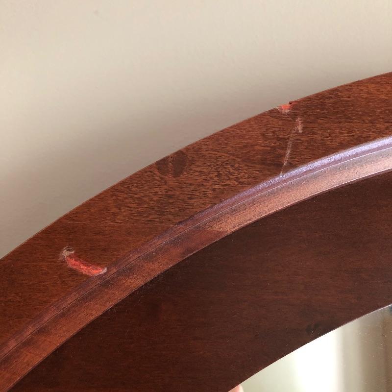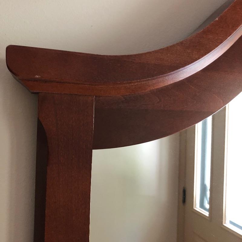 This elegant mirror is a medium to dark toned wood with an attractive arched top. Measuring 43” x 38”, it’s a good size and has a sturdy hanging bar for mounting it securely to a wall. There are a couple of minor blemishes shown in an image.