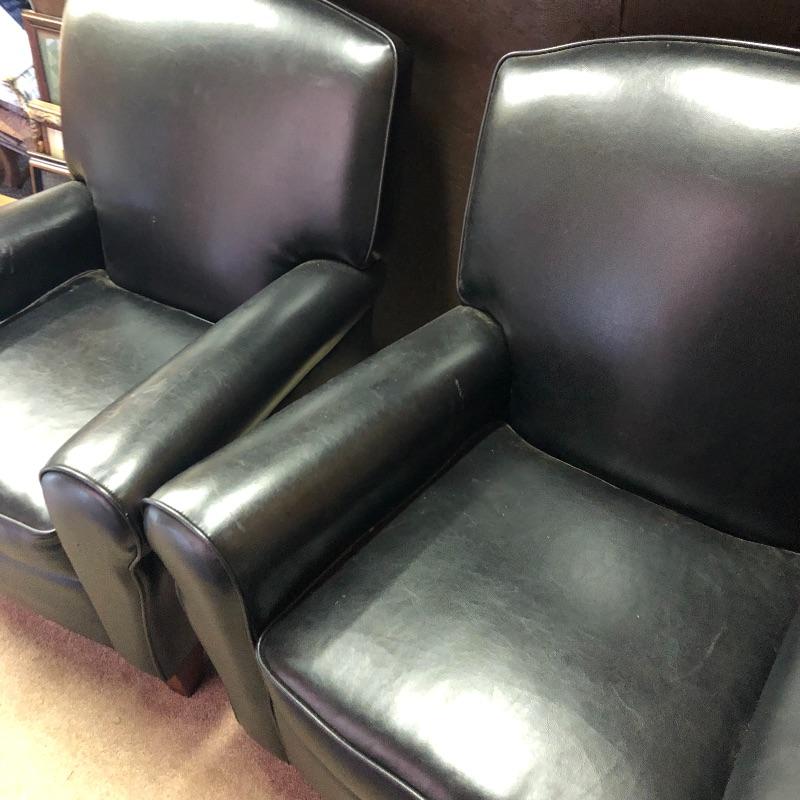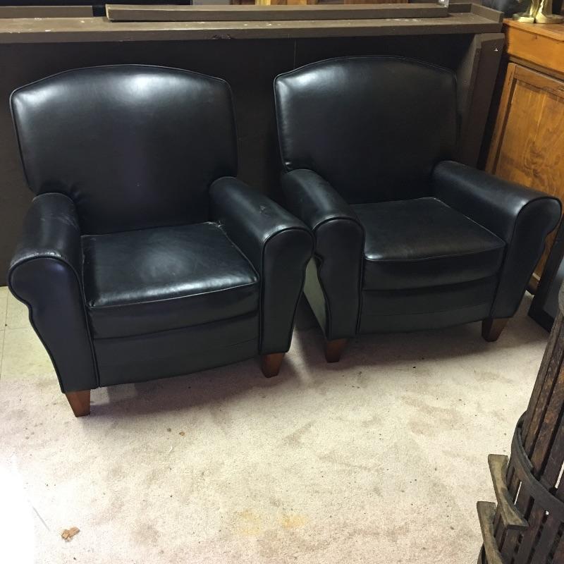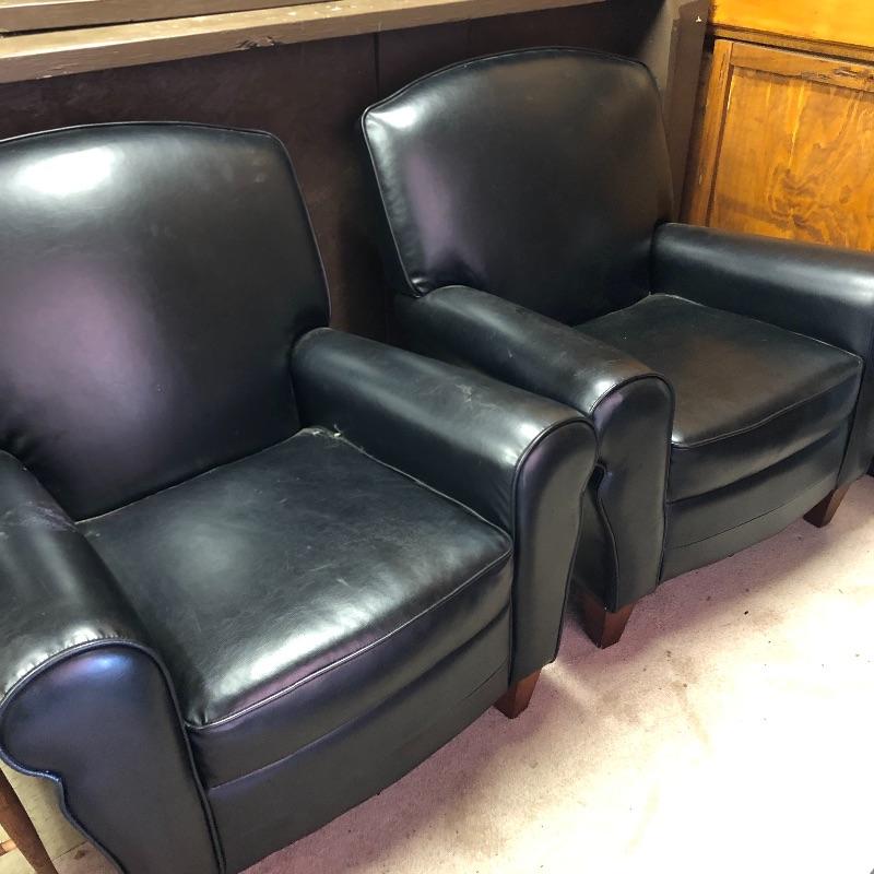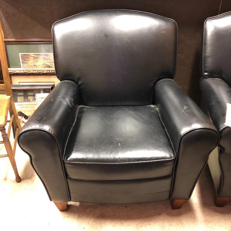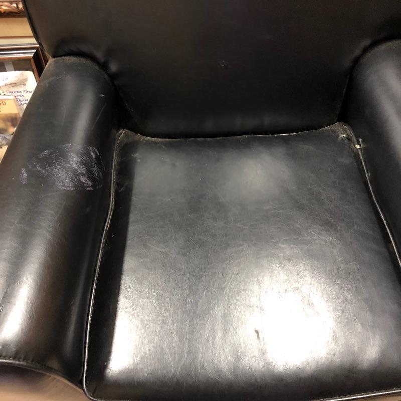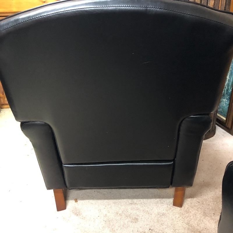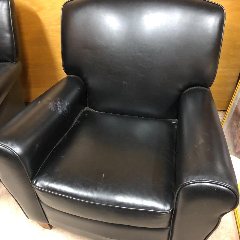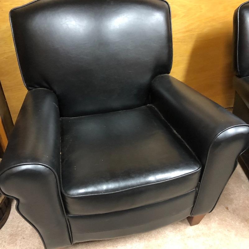 These comfortable coffee shop like chairs are of a black leather like material with wooden legs. They are in good condition yet do have a few marks on them (see pictures). The marks may come off with cleaner or oil? Seat Cushions are not removable. Dimensions are 35”x 34.5”x 32”. The seat height is 17.5”. Local pick up only.