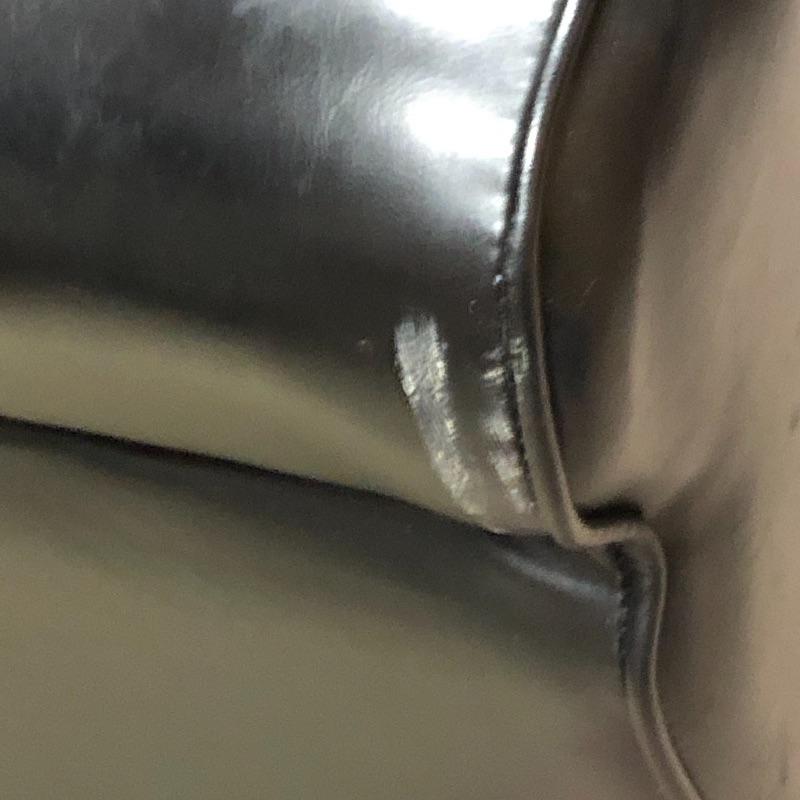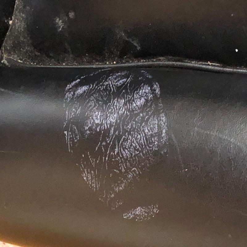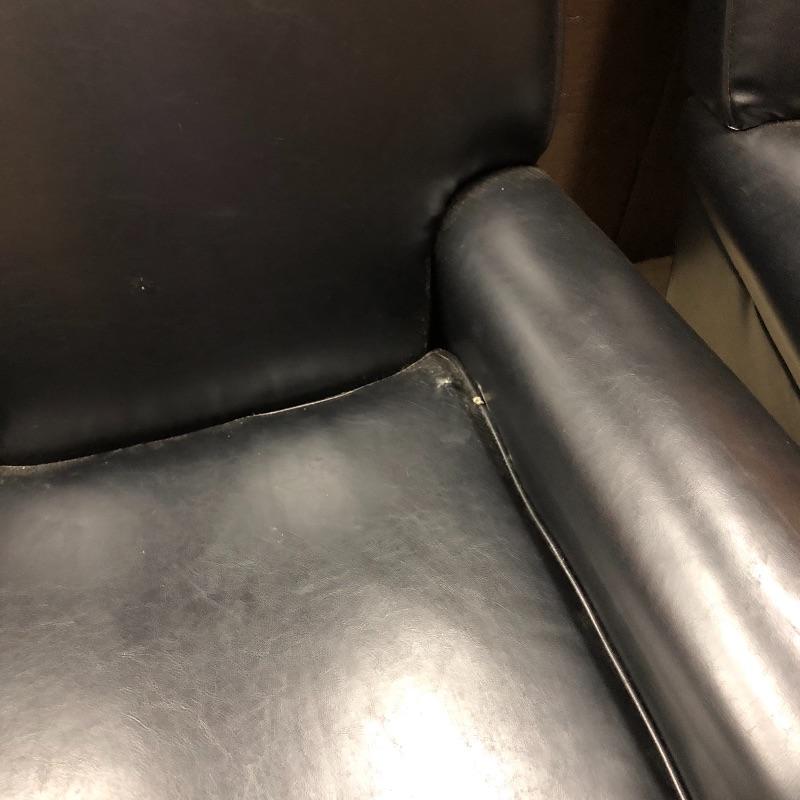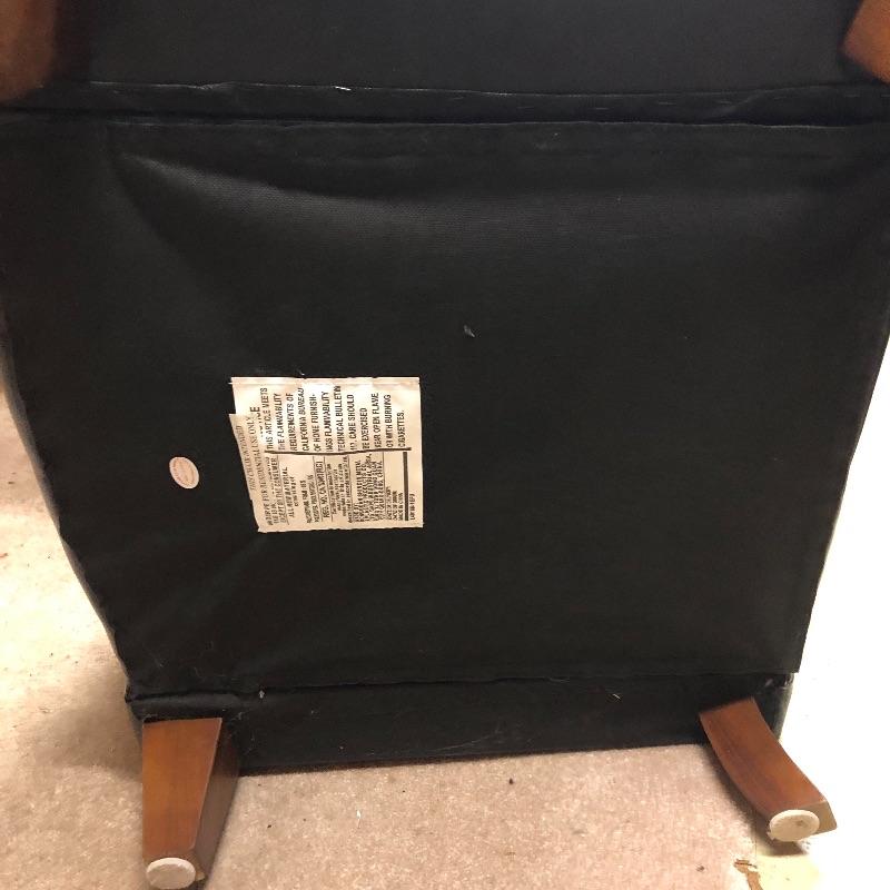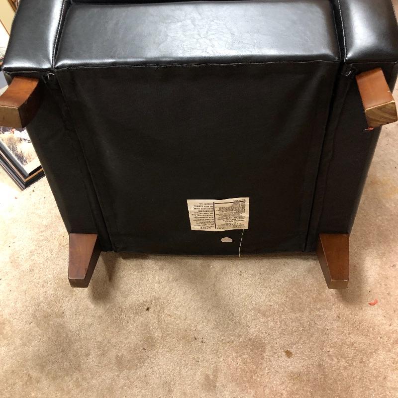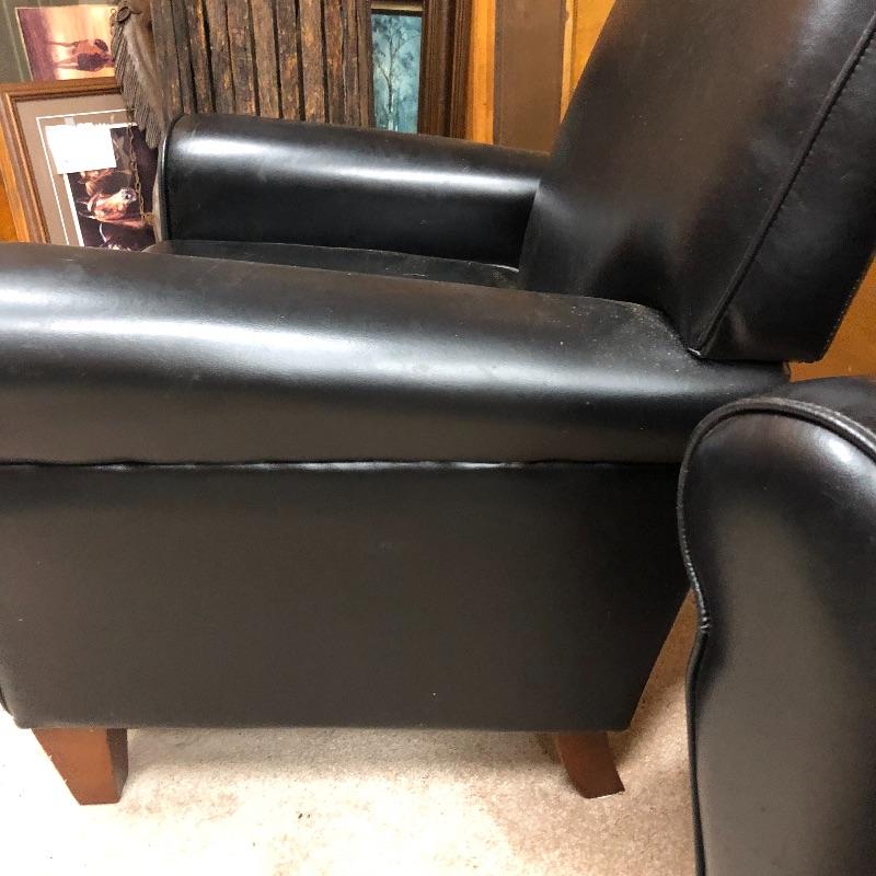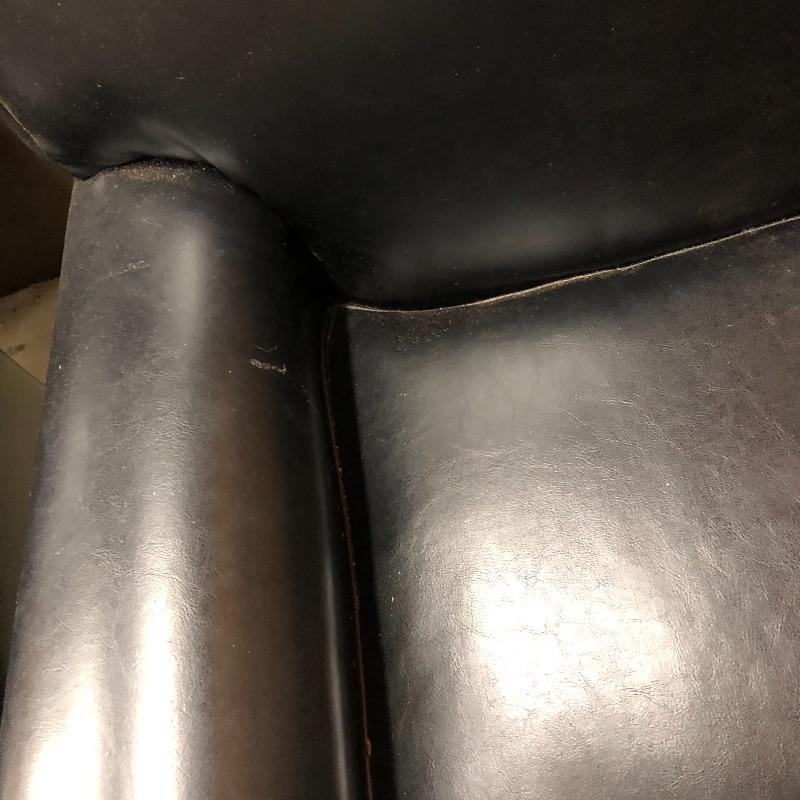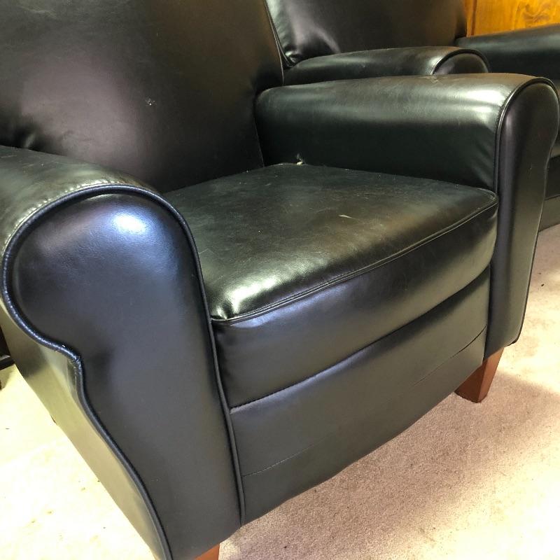 These comfortable coffee shop like chairs are of a black leather like material with wooden legs. They are in good condition yet do have a few marks on them (see pictures). The marks may come off with cleaner or oil? Seat Cushions are not removable. Dimensions are 35”x 34.5”x 32”. The seat height is 17.5”. Local pick up only.