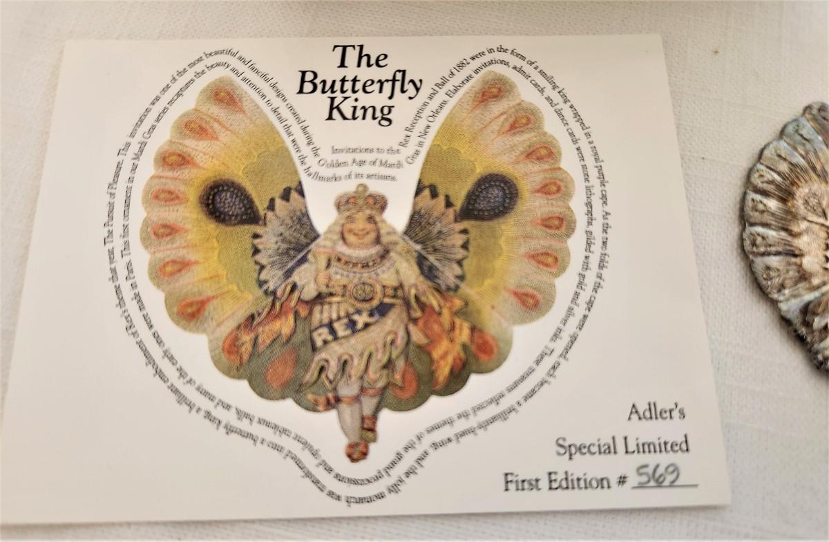 1st in a series (now retired) - ADLER Butterfly King Mardi Gras ornament, #569, in original box with paper. 2.5" across. Scarce.