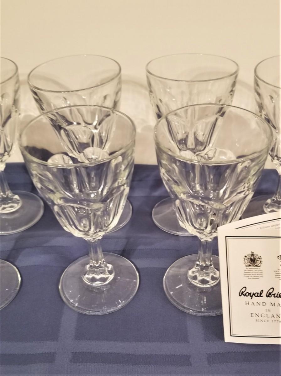 These nice simple crystal goblets - each 5.5" tall - match the ones offered in Lot #30. Please IGNORE the Royal Brierly care in front - we have since learned that this set is NOT Royal Brierly. These are not marked. Good condition.