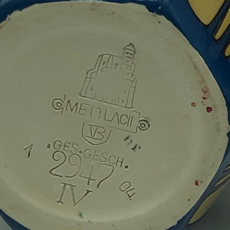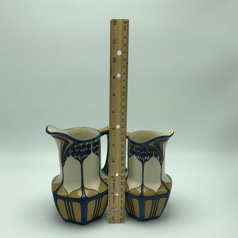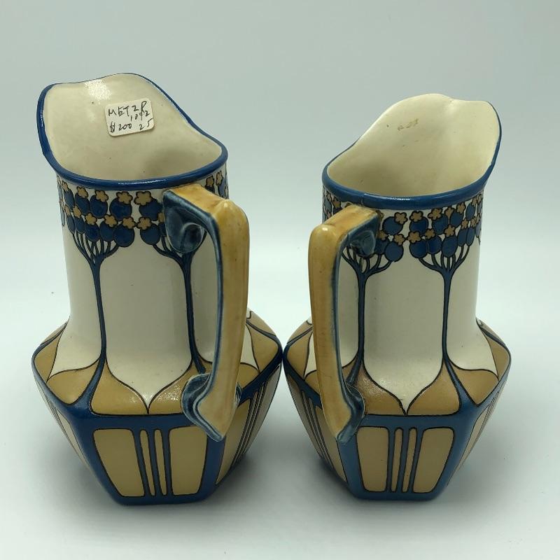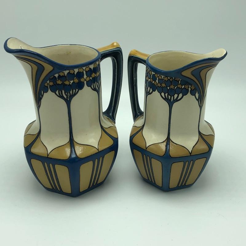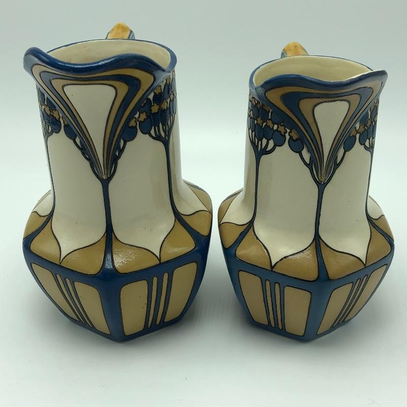 1910 Blue, white and tan decorative pair of small Mettlach Villeroy & Boch pitchers numbered 2947 V and VI. Glazed inside these pieces are