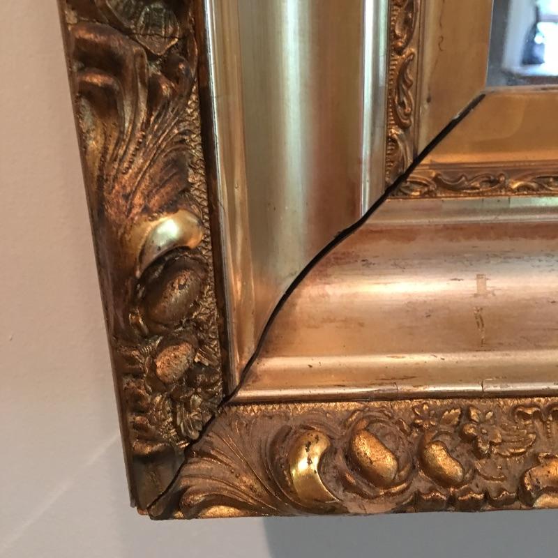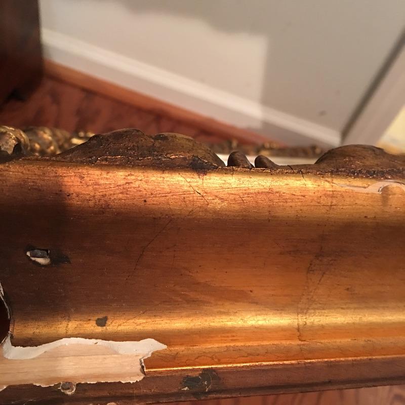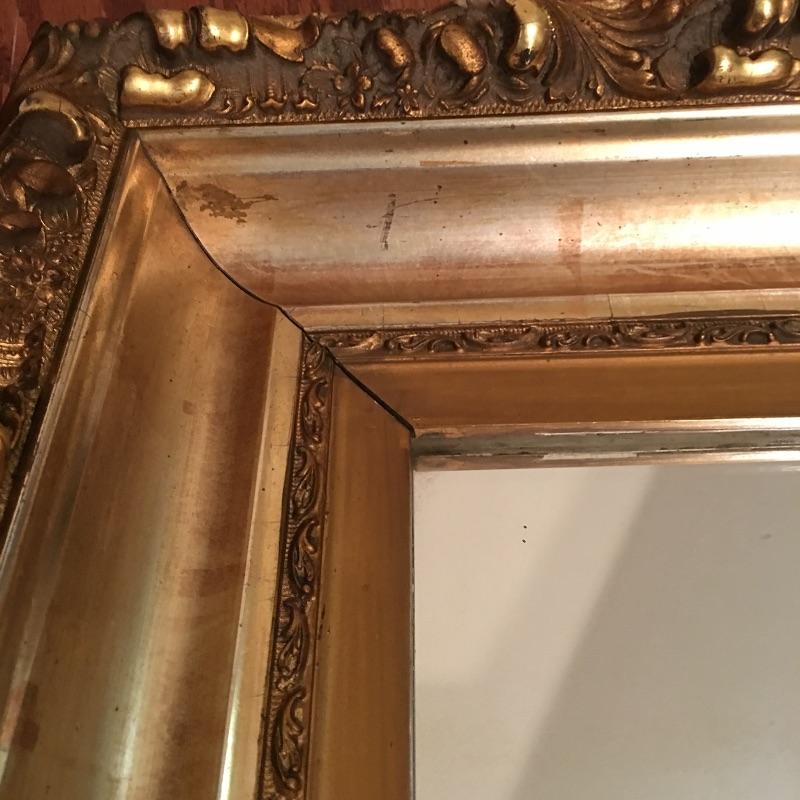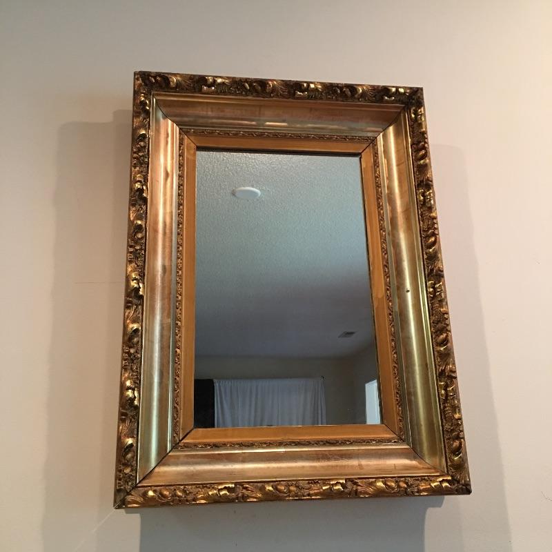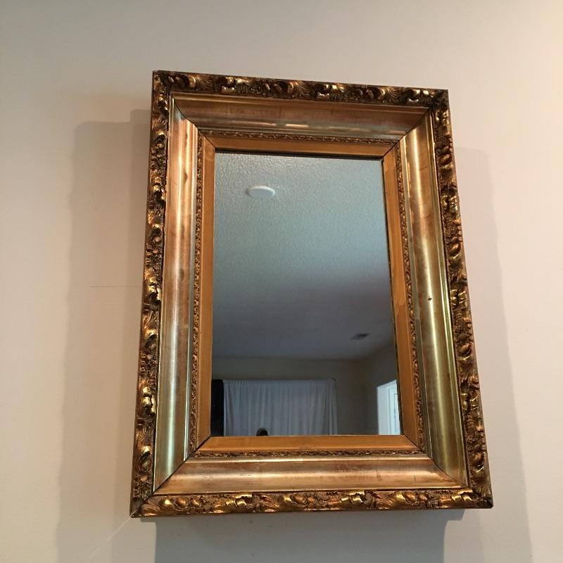 Ornate gold colored wooden frame mirror is very attractive. The frame does have some damage to it that could possibly be masked with paint, see pictures. Mirror measures 20” x 27” x 3”.