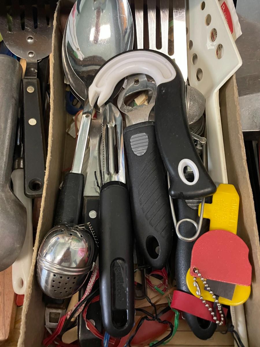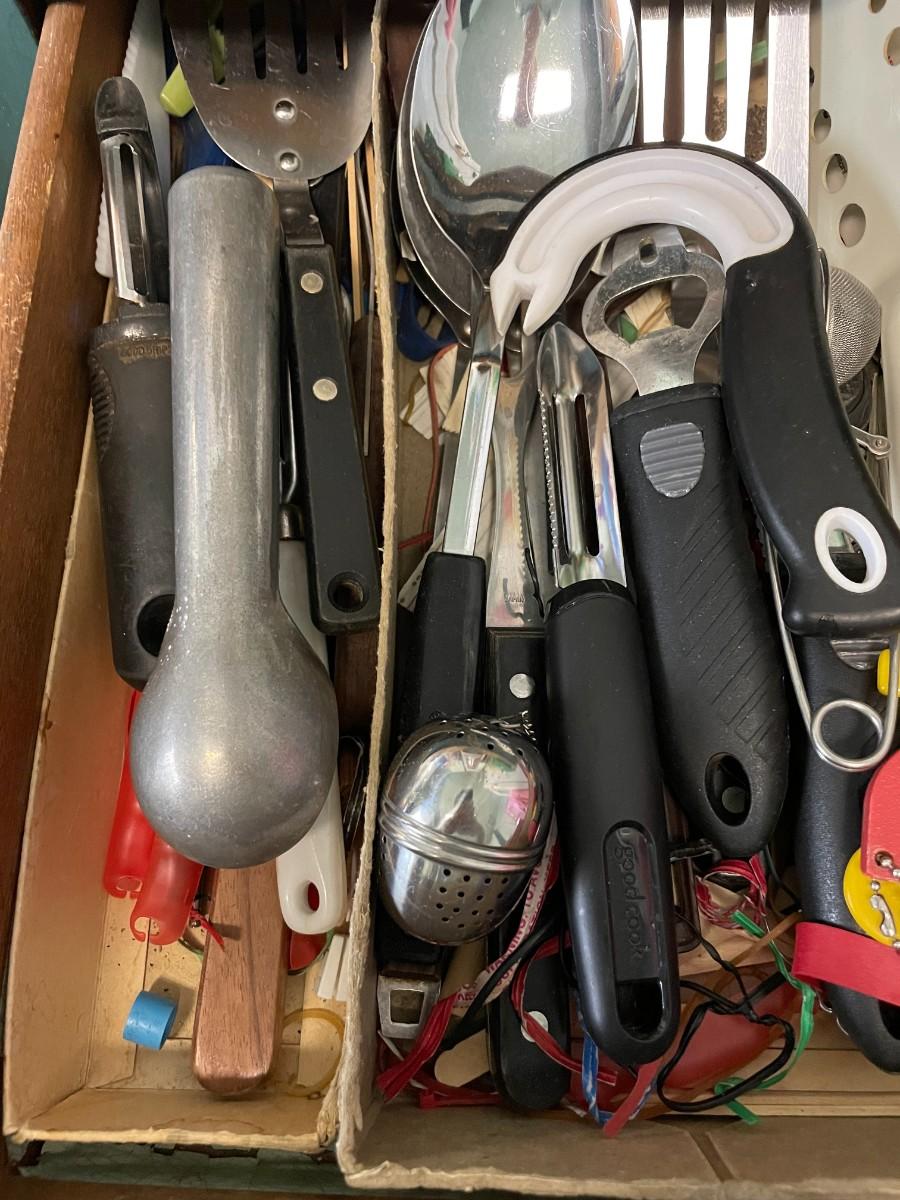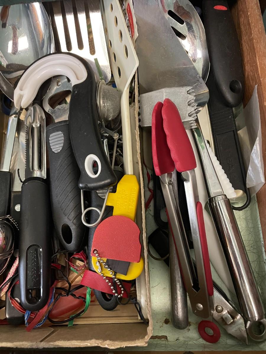Misc. kitchen tools, knives, spoons, spatulas, etc.