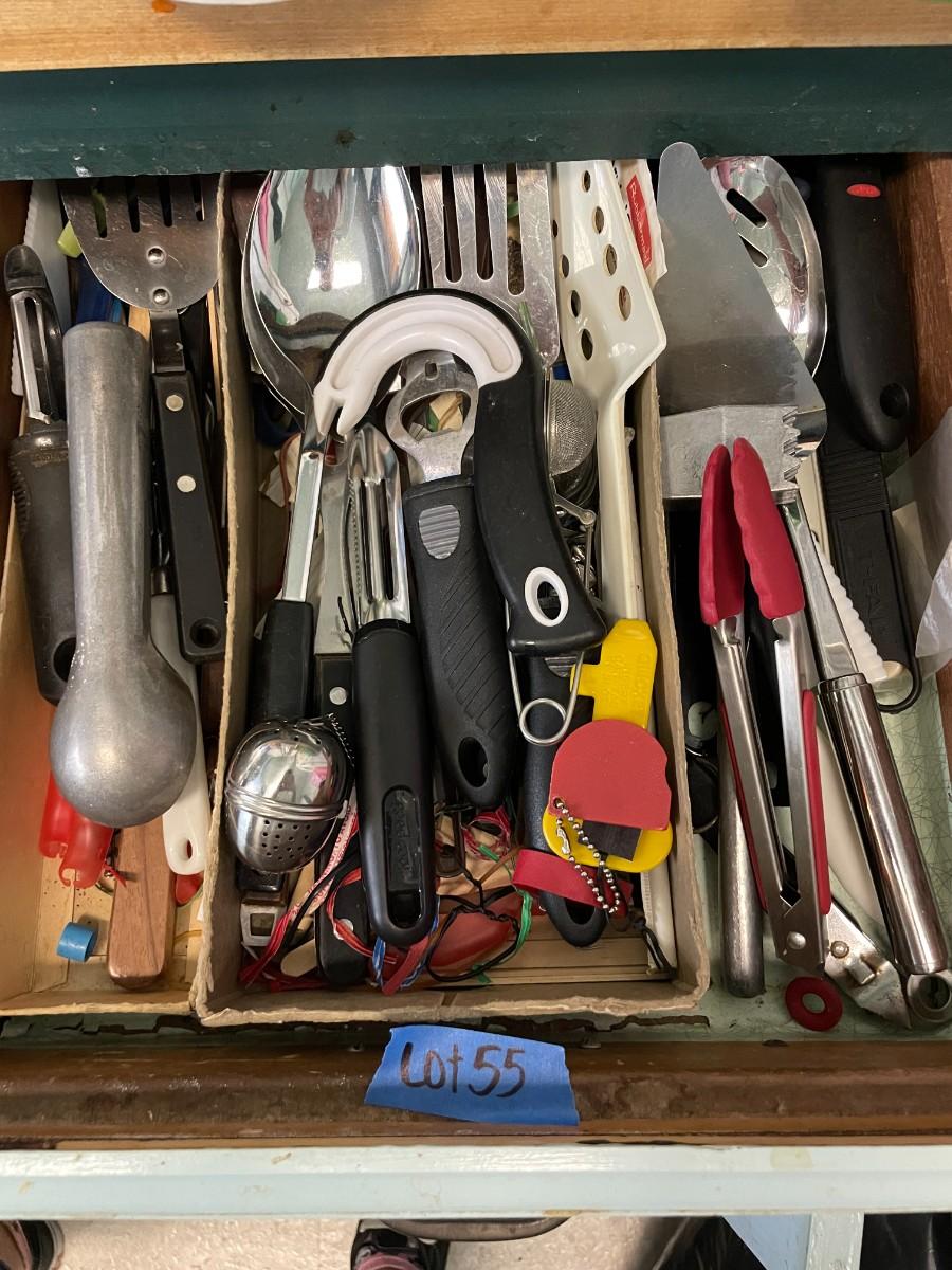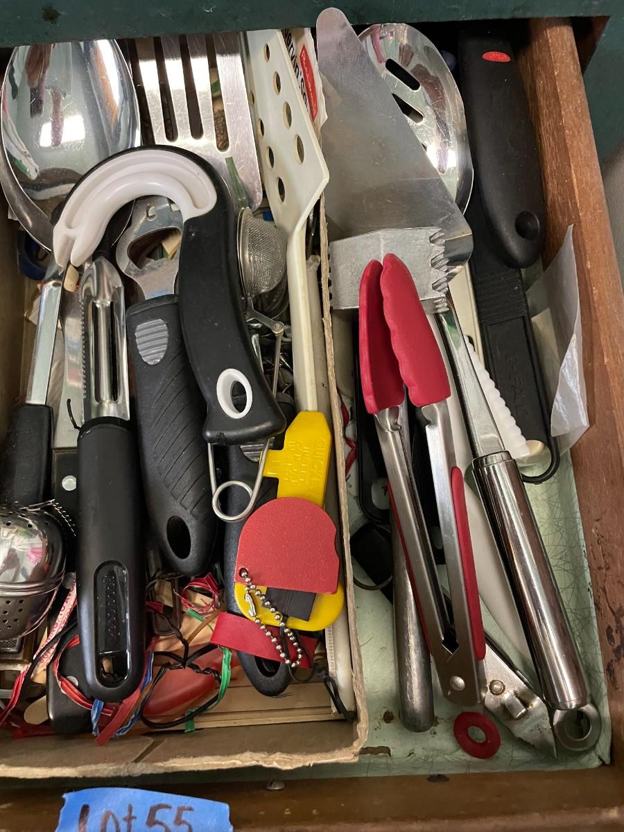lot 55- Misc. kitchen tools, knives, spoons, spatulas, etc.