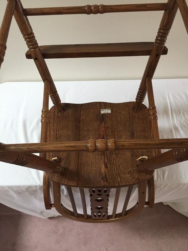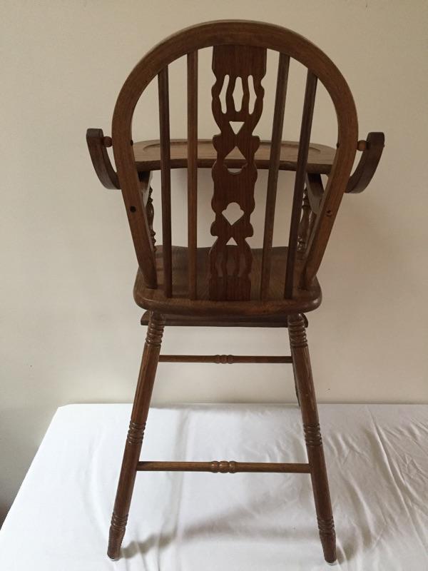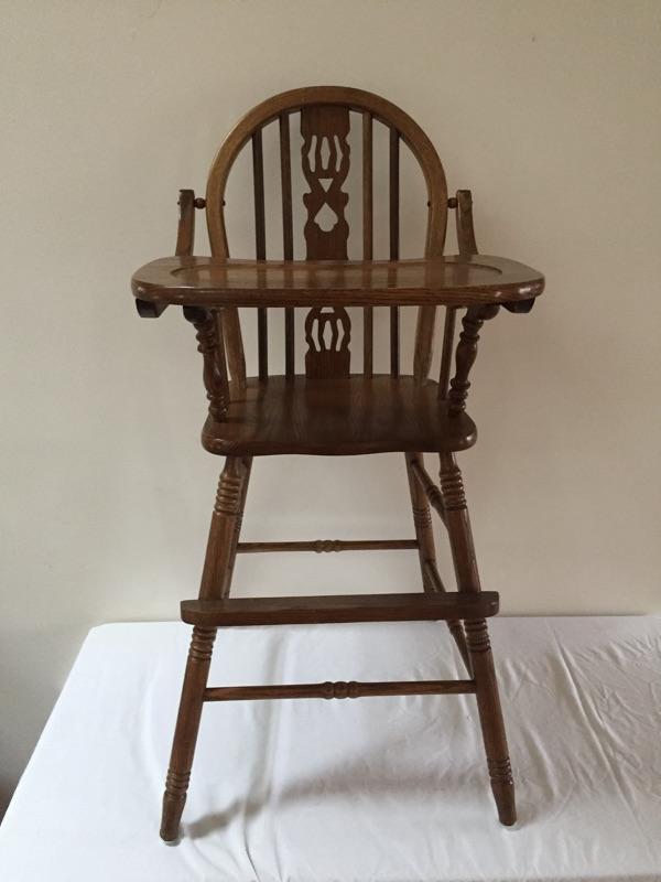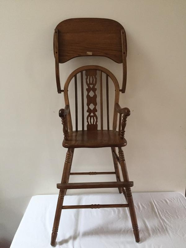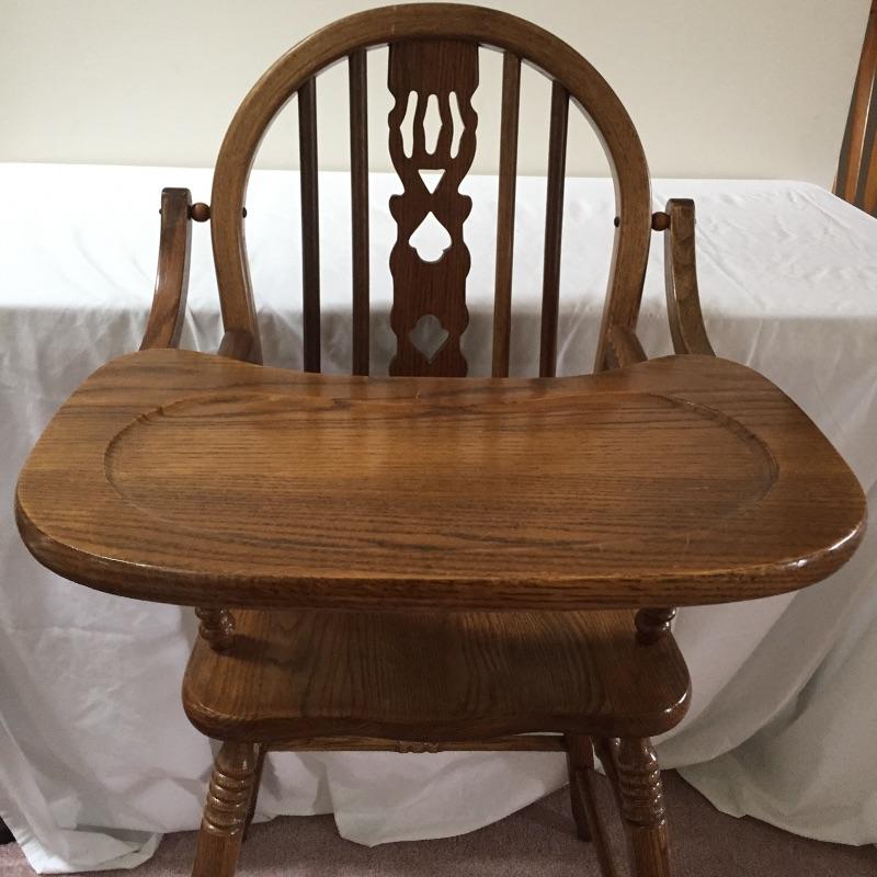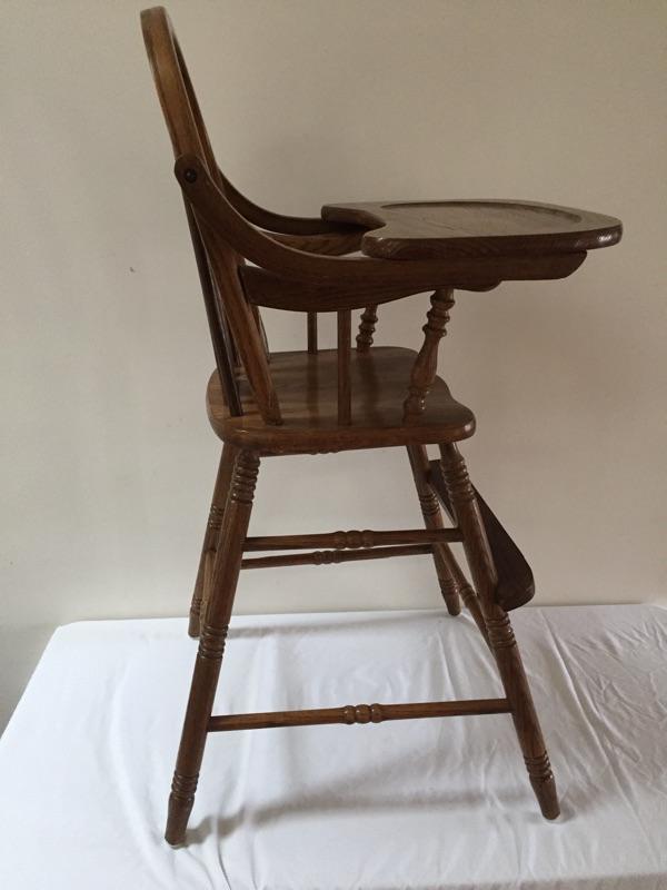 Lovely oak high chair in excellent shape. Great for the kids or grandkids. Illegible stamp on bottom. Tray can swivel up or down. Nice and Sturdy. Chair measures 20” x 21” x 39.5” with a 22” seat height.