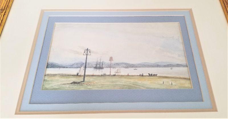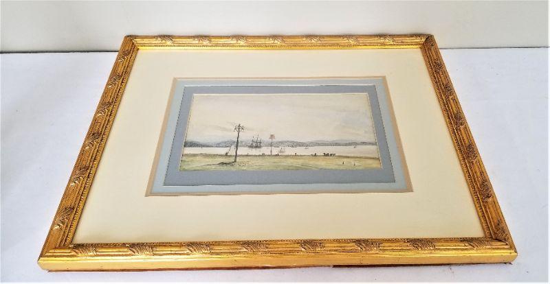 Sweet original watercolor that depicts some 19th century citizens enjoying a summer day by the bay. No signature. Triple mat. Measures 20.5" x 16.5".