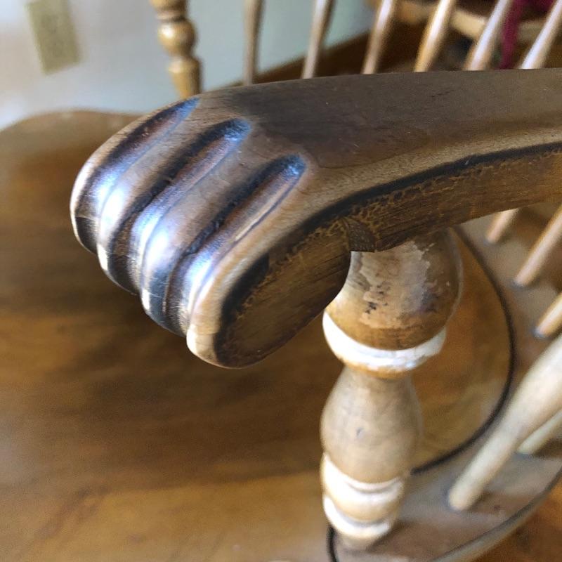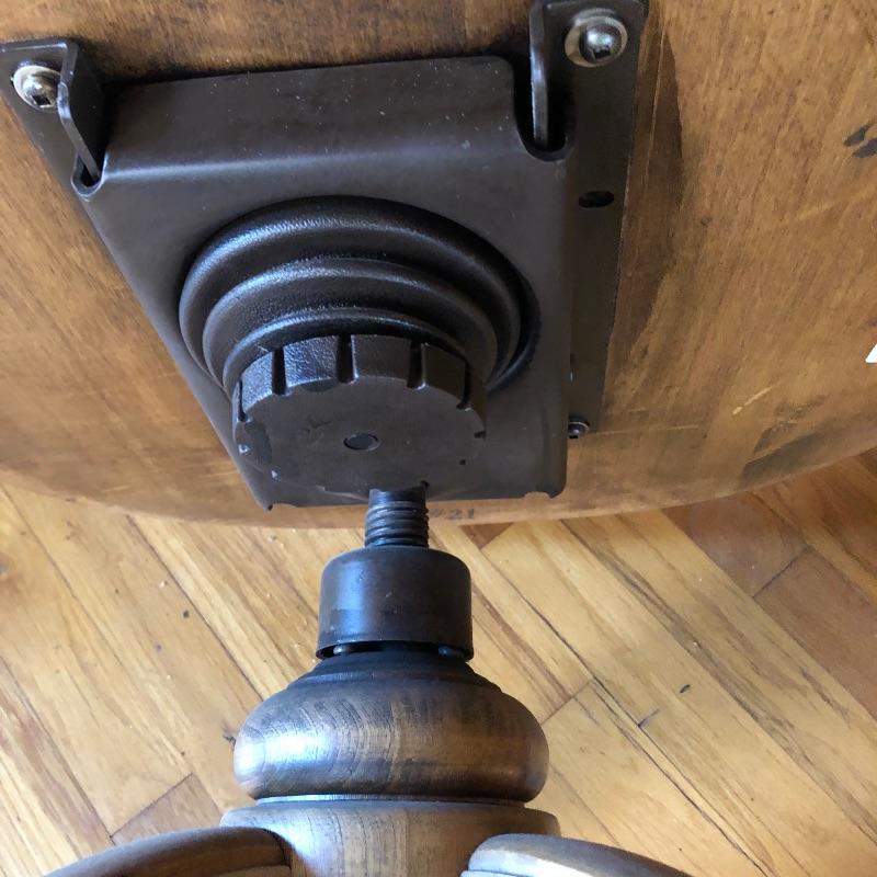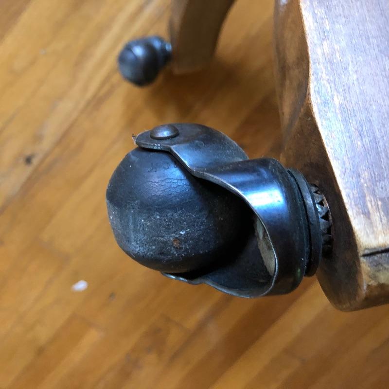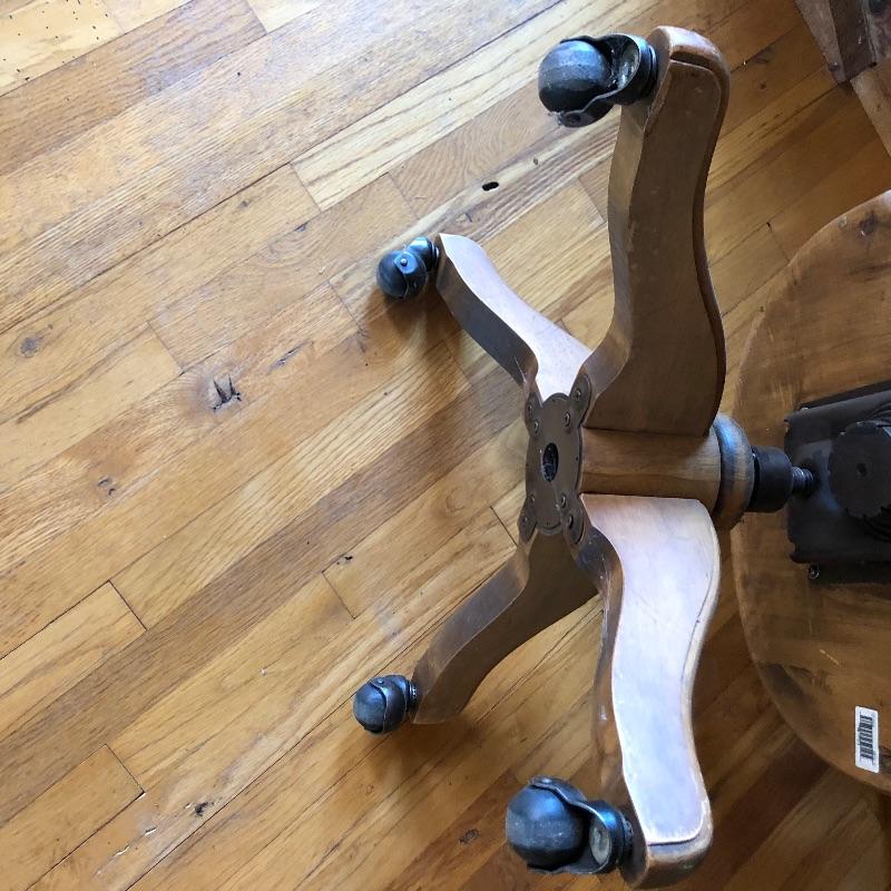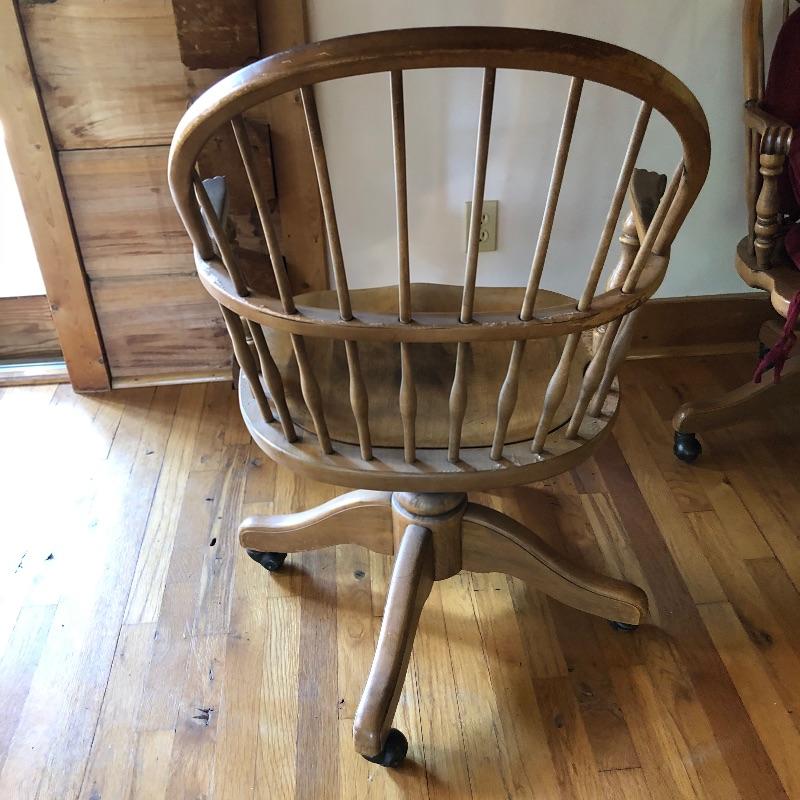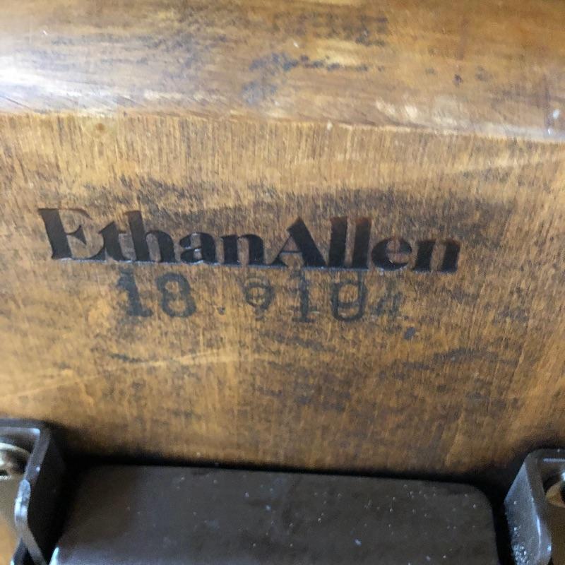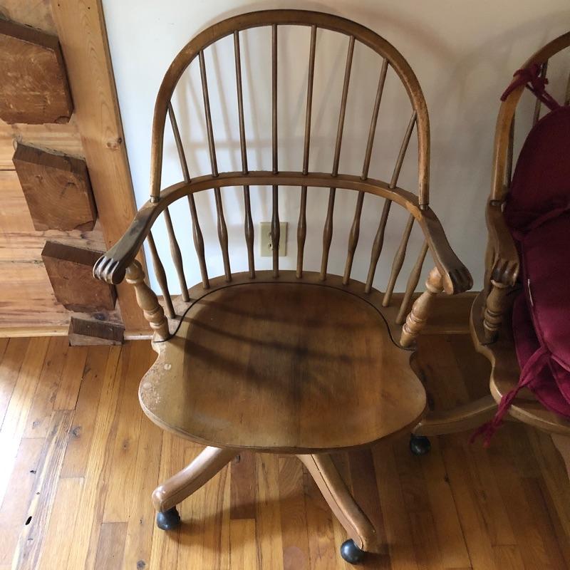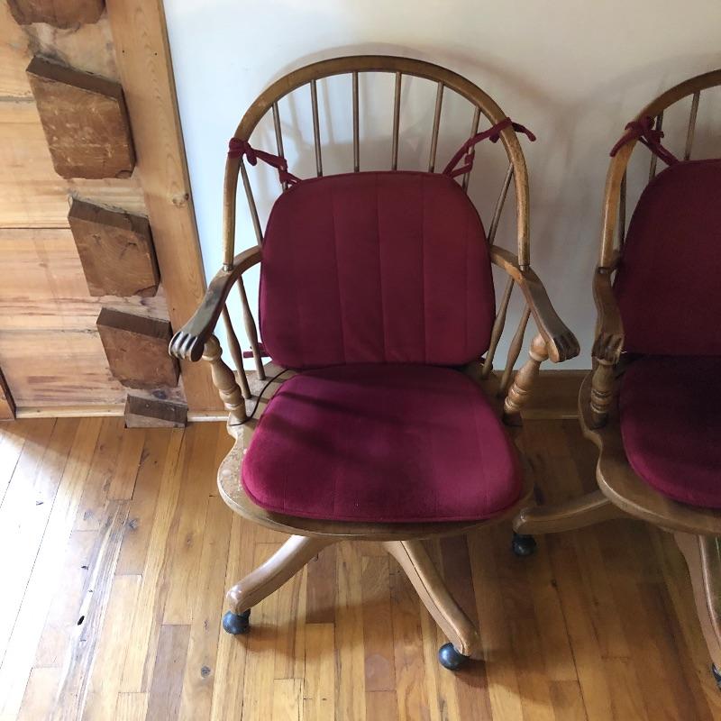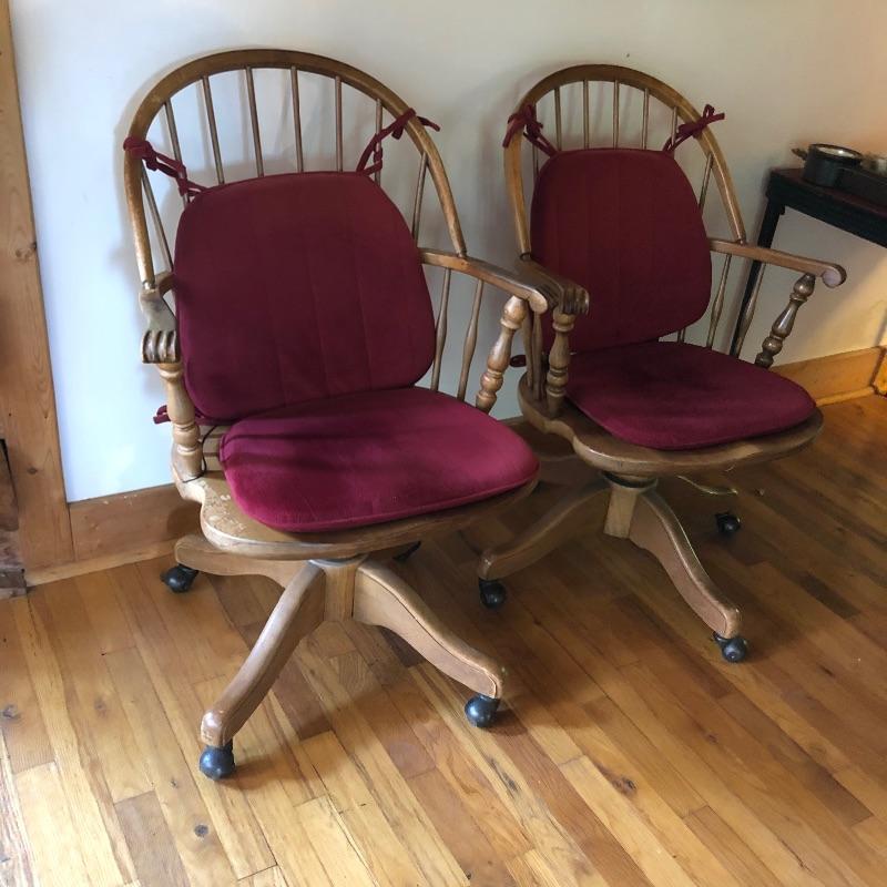 These two Ethan Allen chairs are matching. They have good quality wheels and appear to be height adjustable. The varnish is flaking off and worn away in a lot of areas, but with a little work they could look even better than when they were new. They come with detachable dark red plush seat and back cushions.