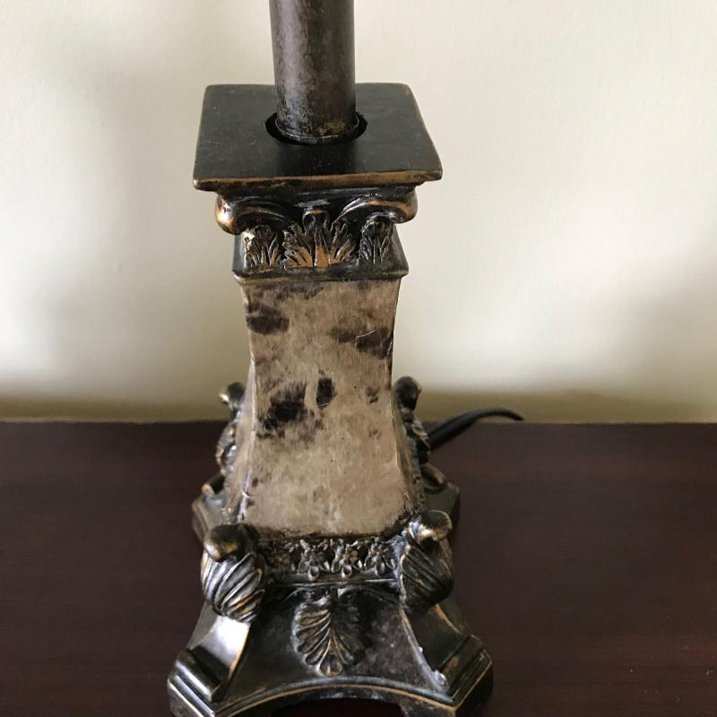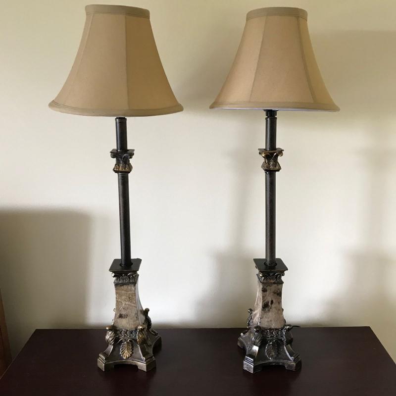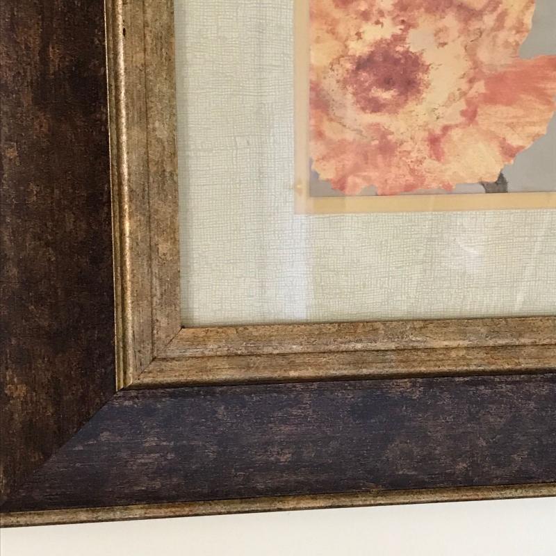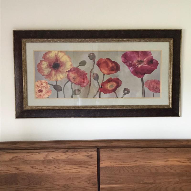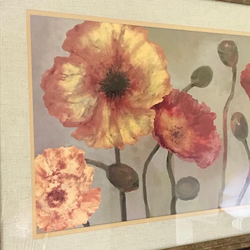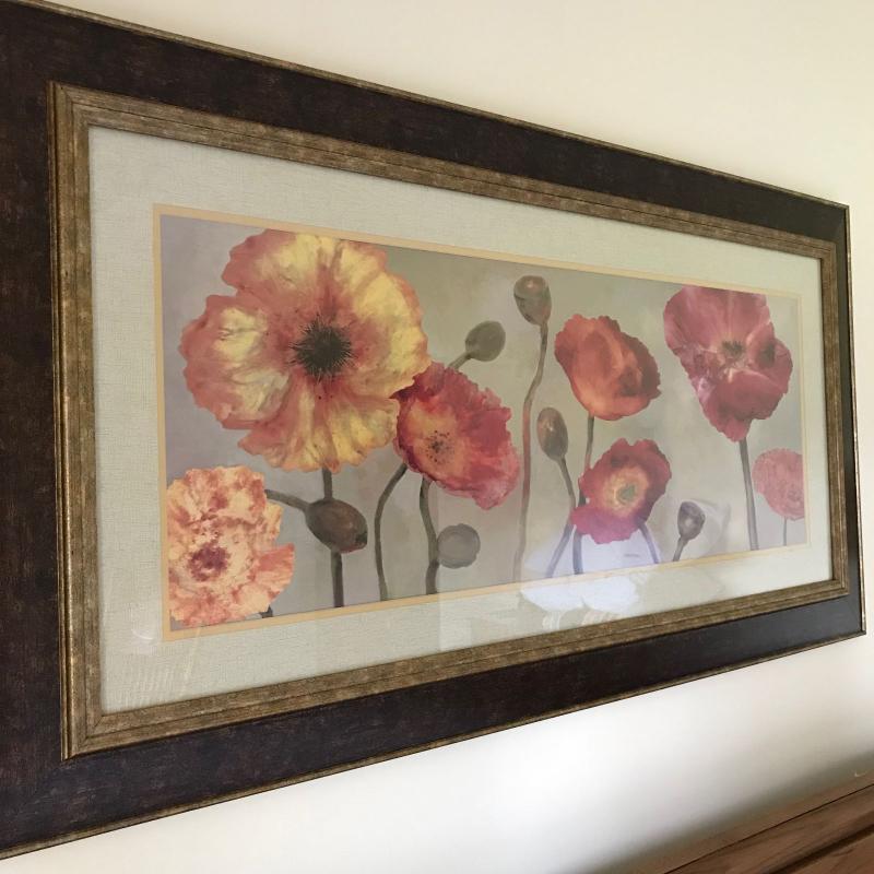 Nice large print of Poppy Flowers with reds and yellows. Measures 47” x 24.5”. Lot also includes pair of matching lamps with faux marble base. Base without shade measures 5”sq x 27”h. No shipping.