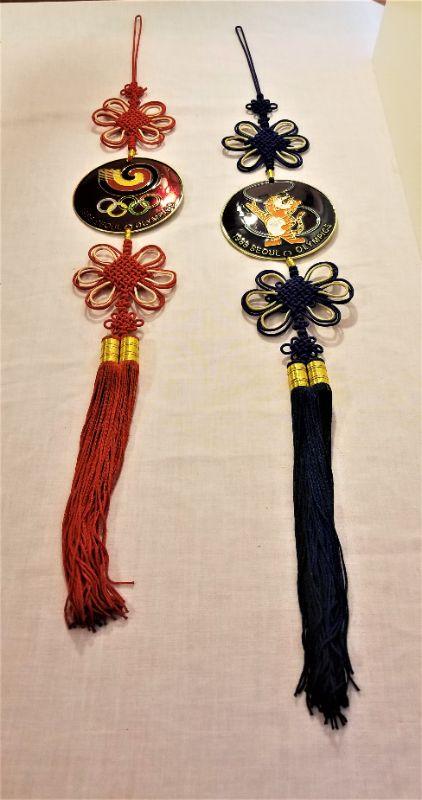 Pair of wall hanging souvenirs purchased at the 1988 Olympic Games in Seoul, Korea. Each in like new condition, 30" long. Insert is metal - one red, one blue, two different designs.