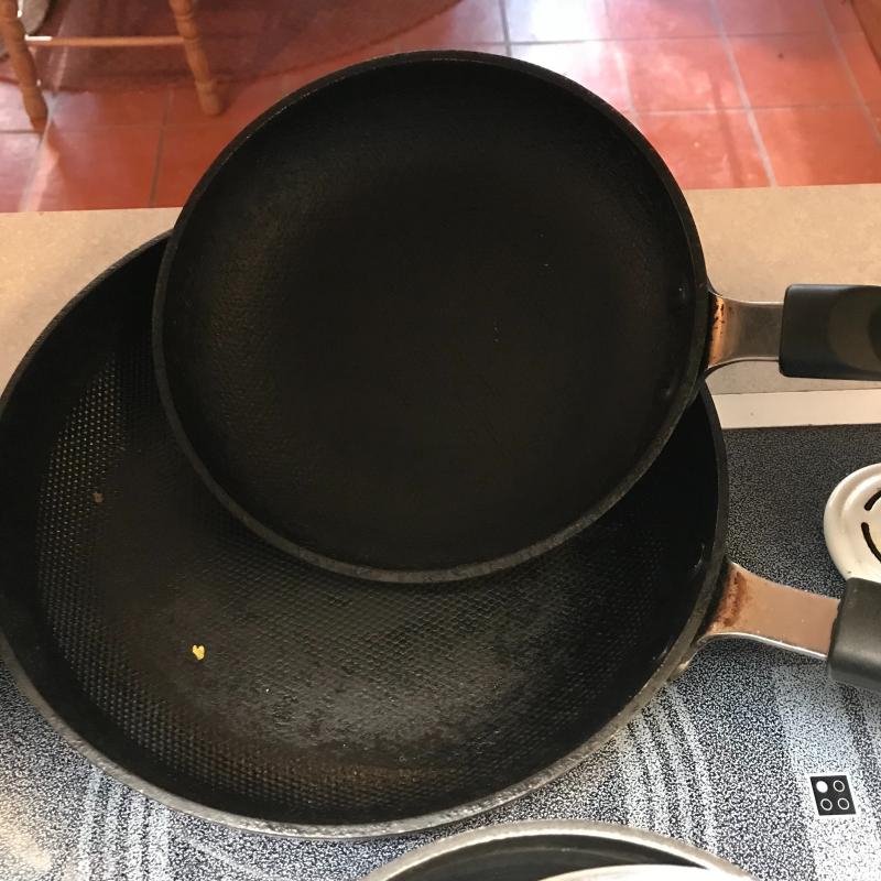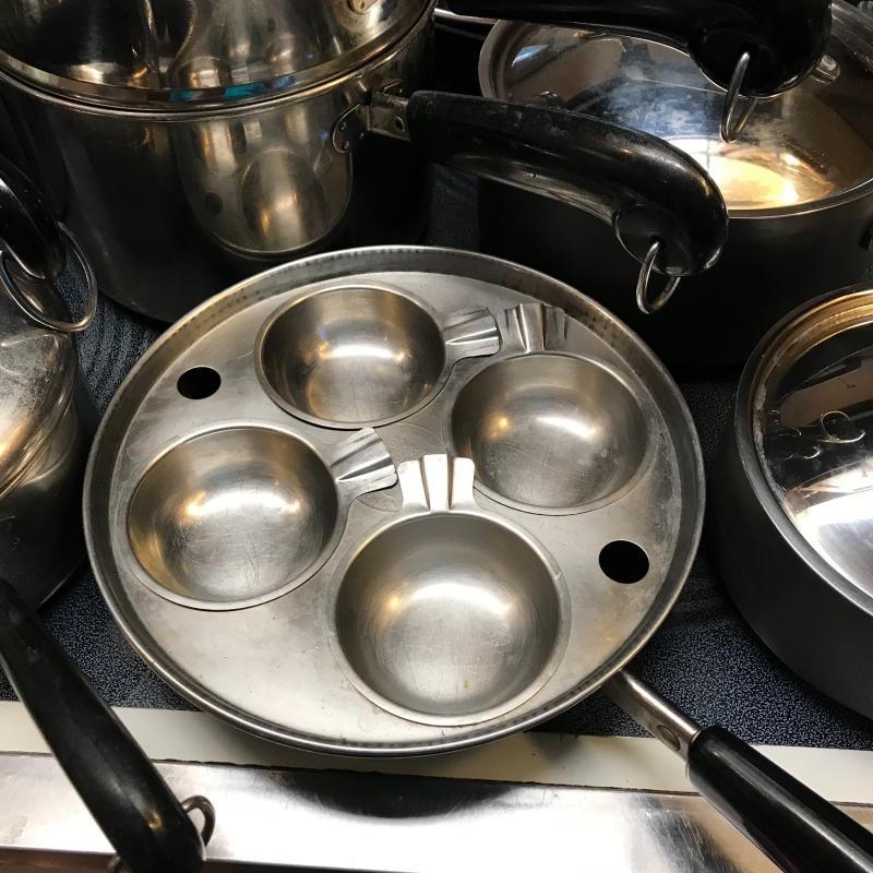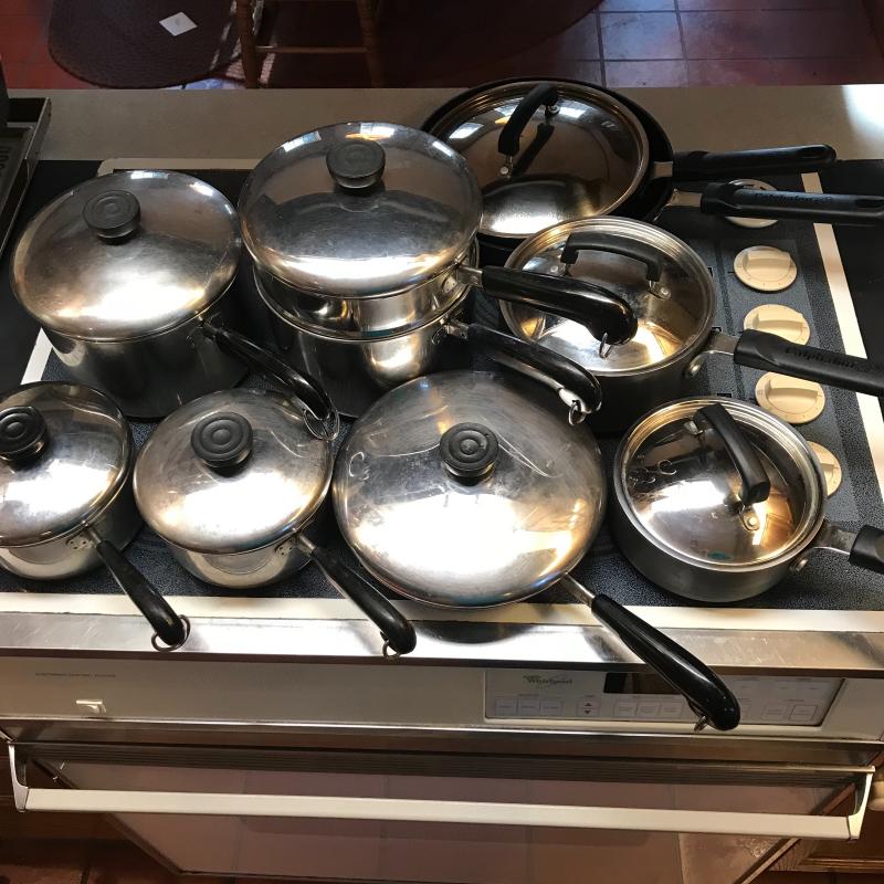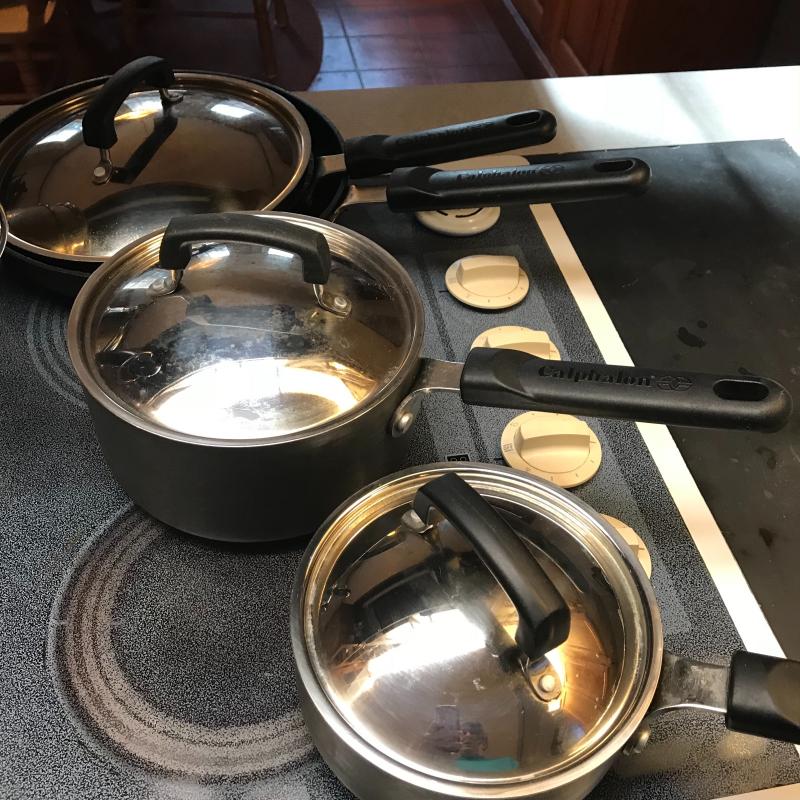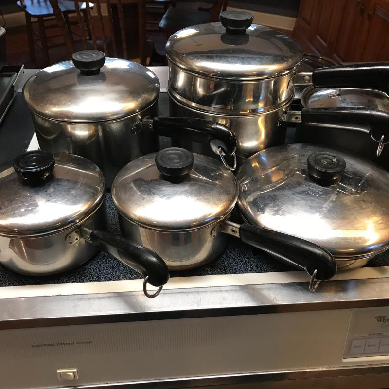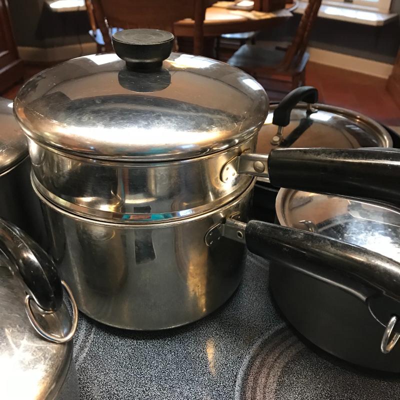 Revere Ware 6-piece set with lids, including a double boiler and egg poacher. Calphalon set of four pots and 3 lids. This lot is available for local pick up in Flat Rock, NC only.