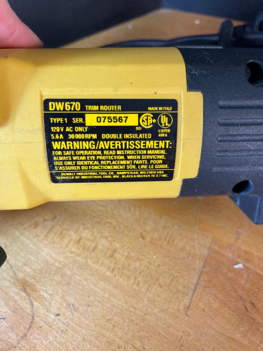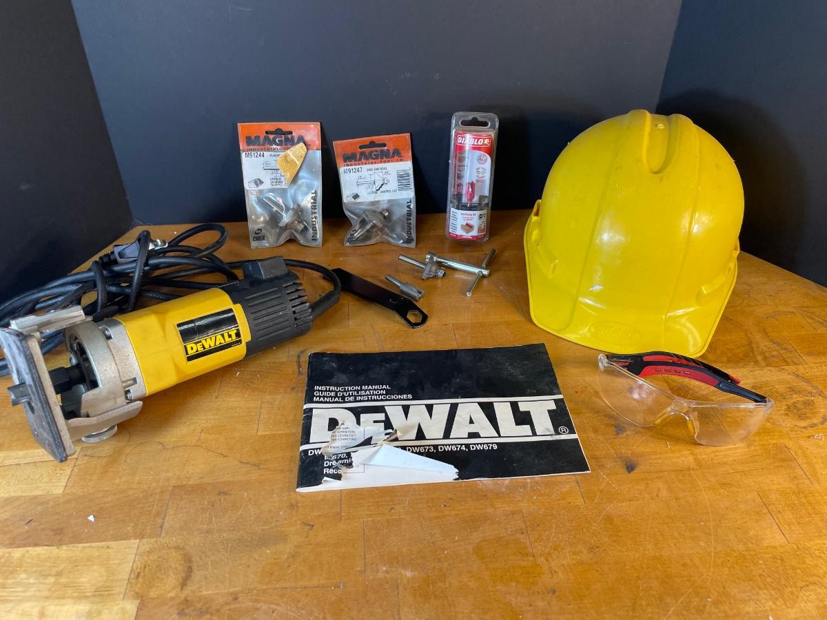 Dewalt Laminate Trimmer with assorted bits, hardhat and safety goggles