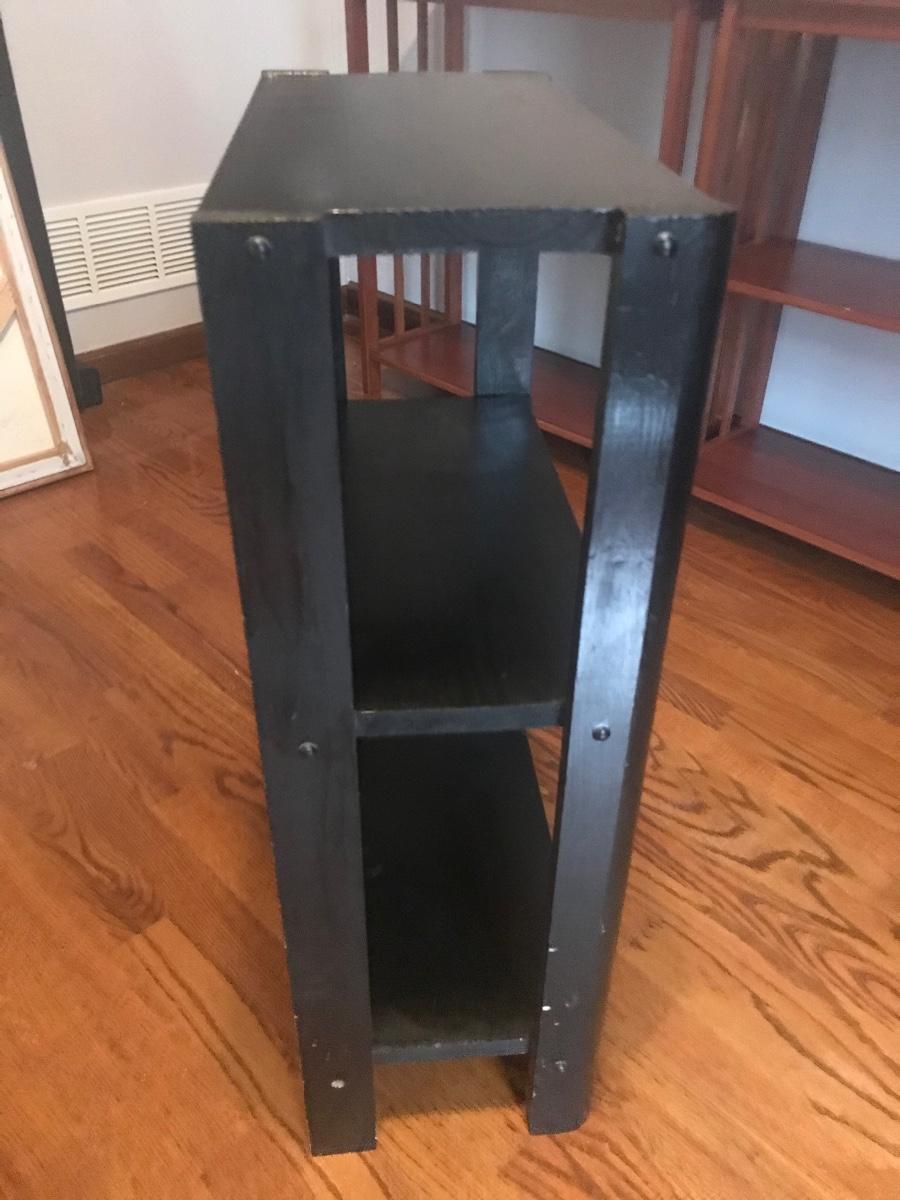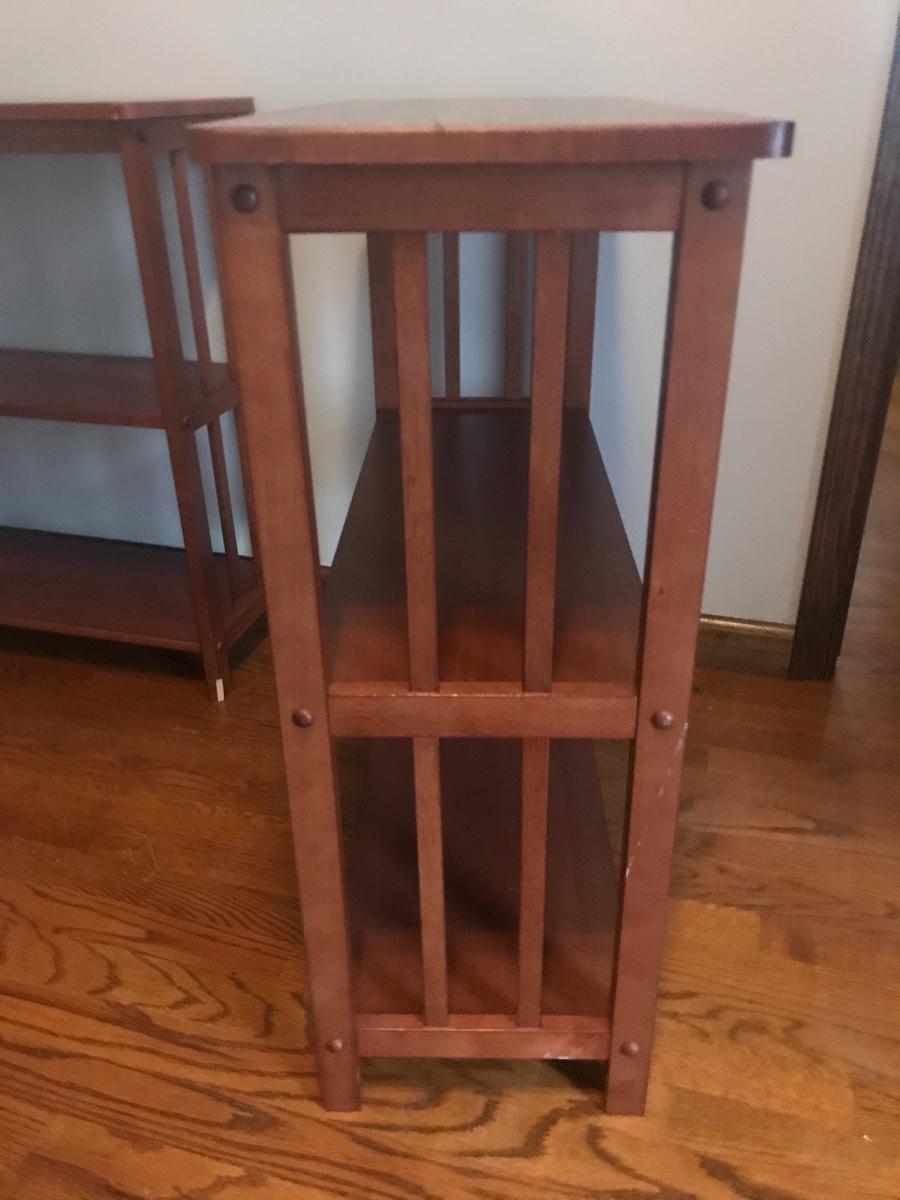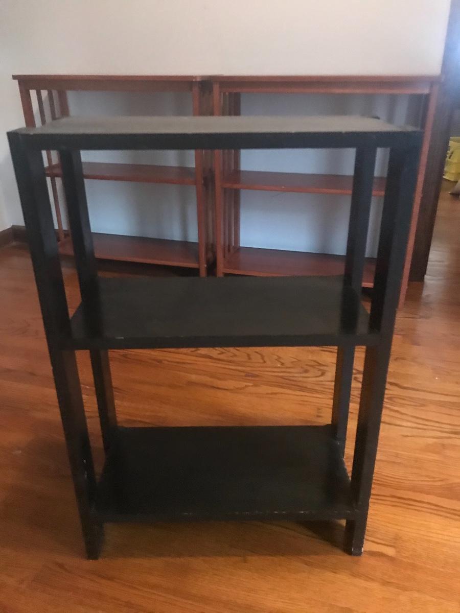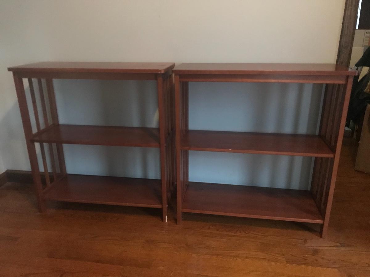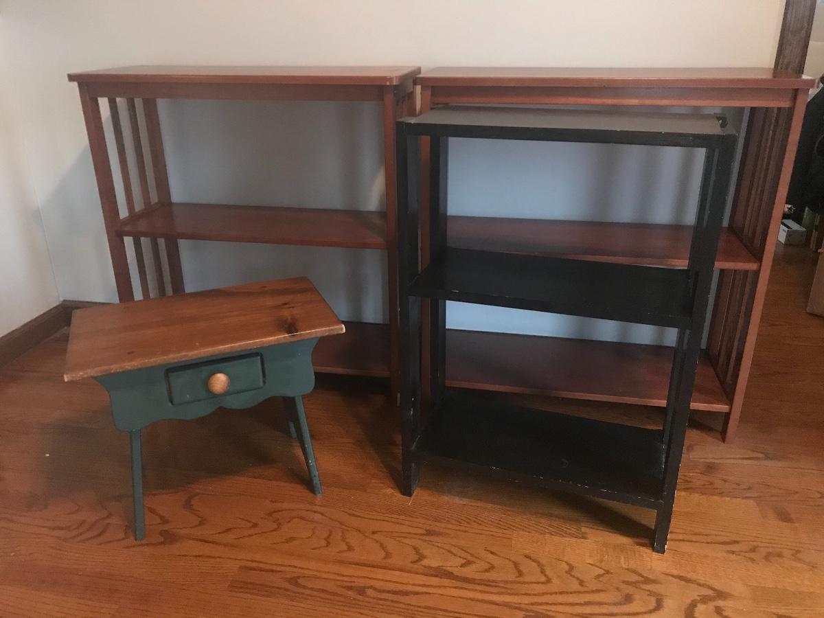 Bookshelves and wooden stool with drawer. Please see all pictures for content of the lot, condition of the lot, and measurements if taken. Pictures are the best representation of the items listed and items are untested unless indicated in description. Thank you for looking and have fun bidding!