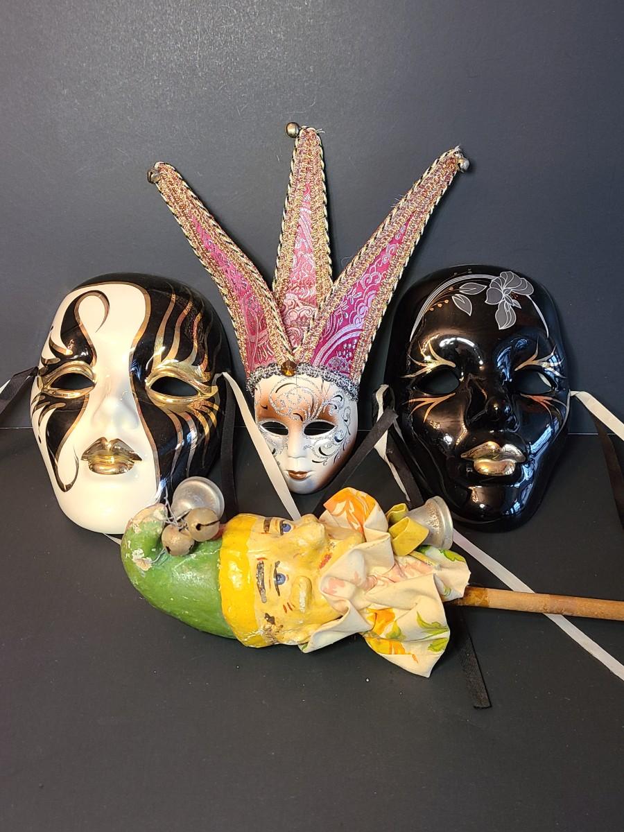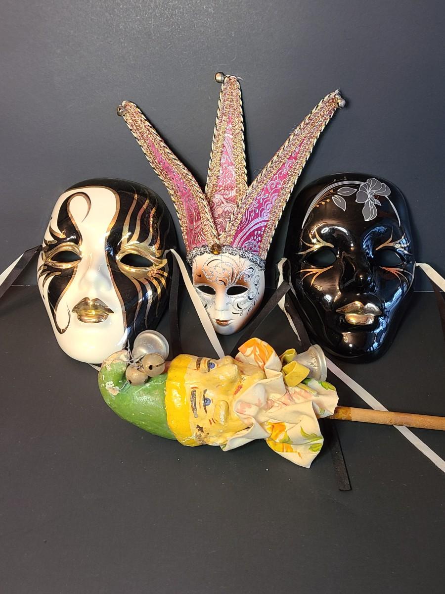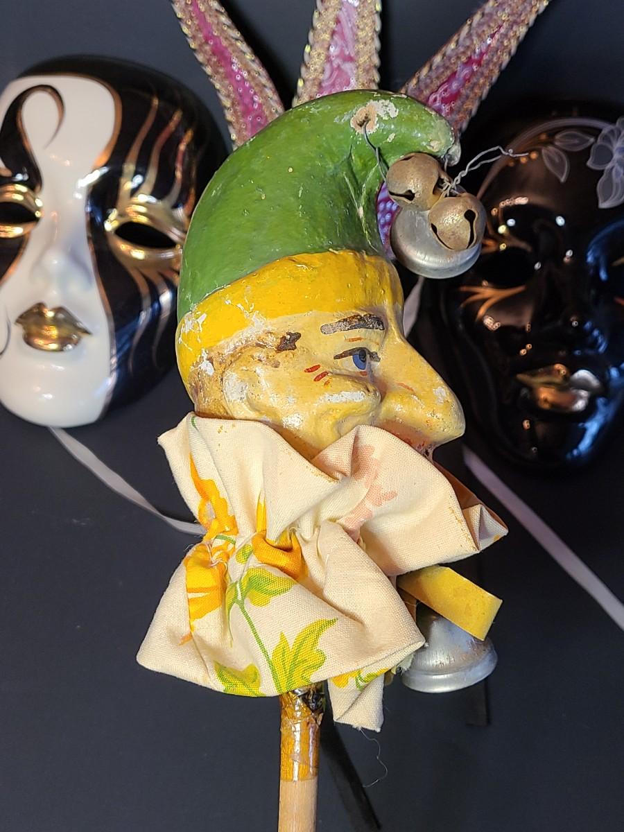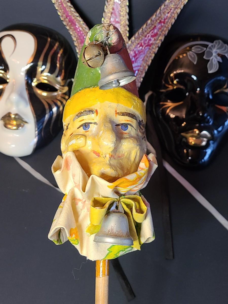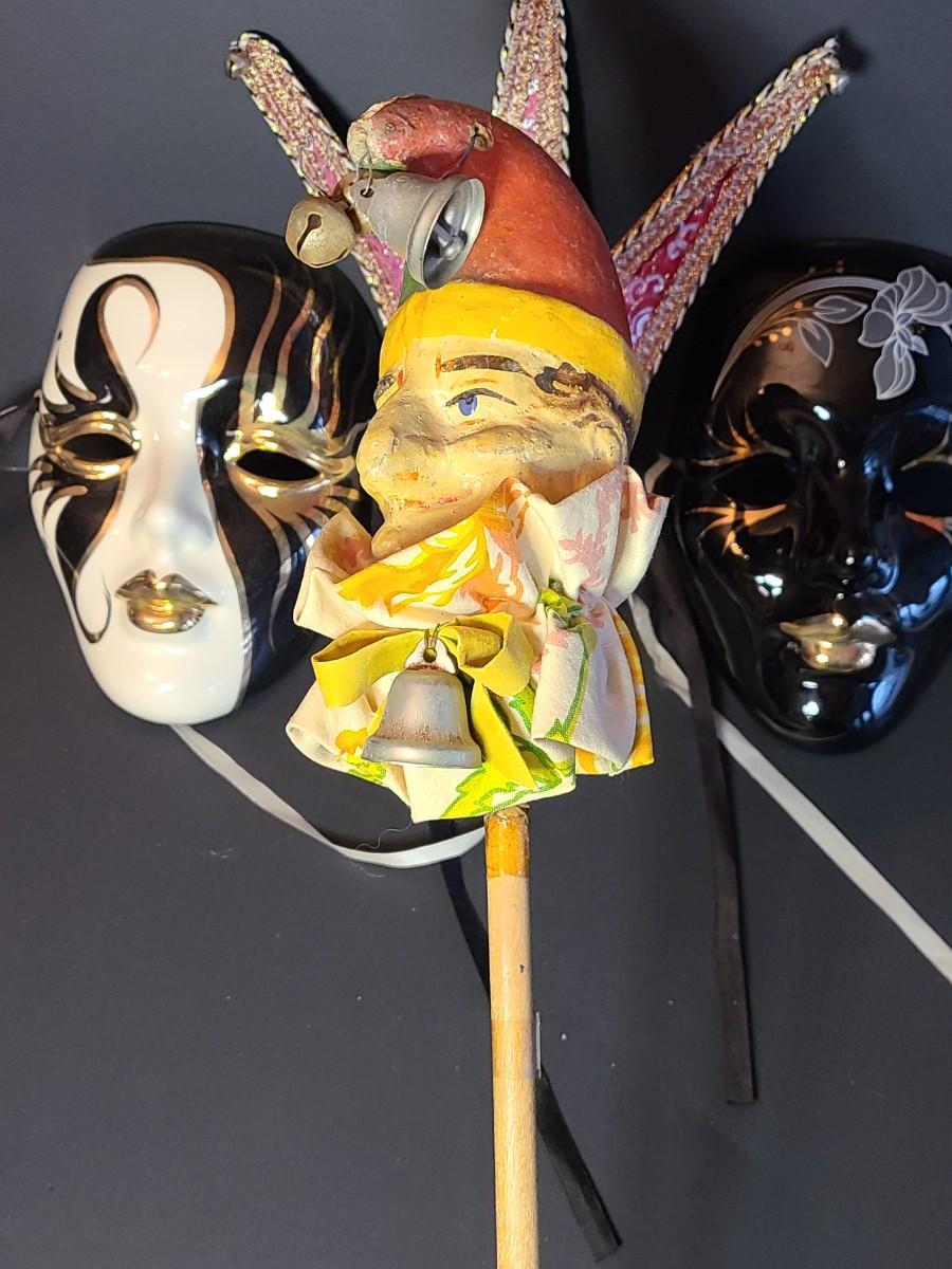 Handmade ceramic face masks used as decor, smaller purple mask for decor, and vintage/antique cardboard/paper mache parade jester stick.
